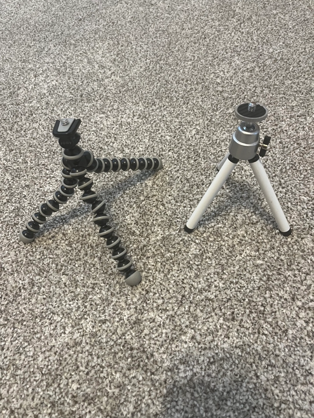 Two mini tripods. $10 each or both for $15. White one has a moveable head for angles. The black one is adjustable at every joint.