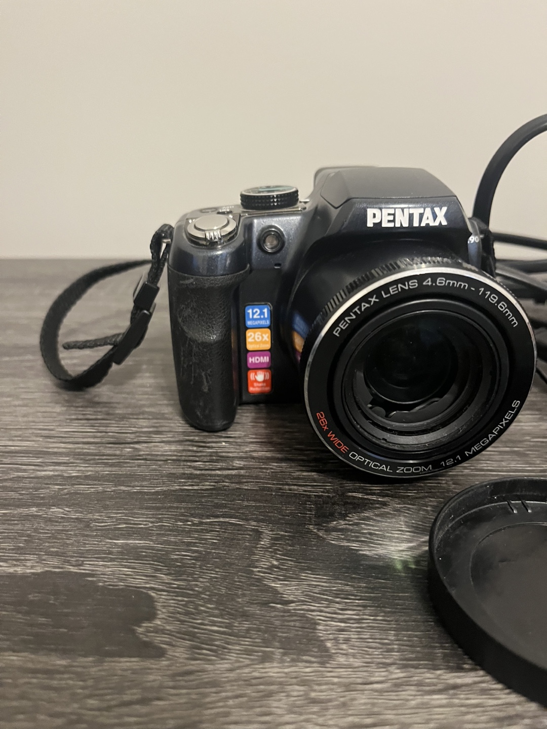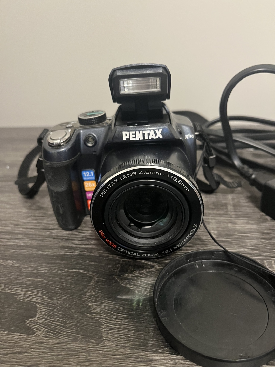 Pentax X90 digital camera. Comes complete with manual, charger, cable for downloading and bag.