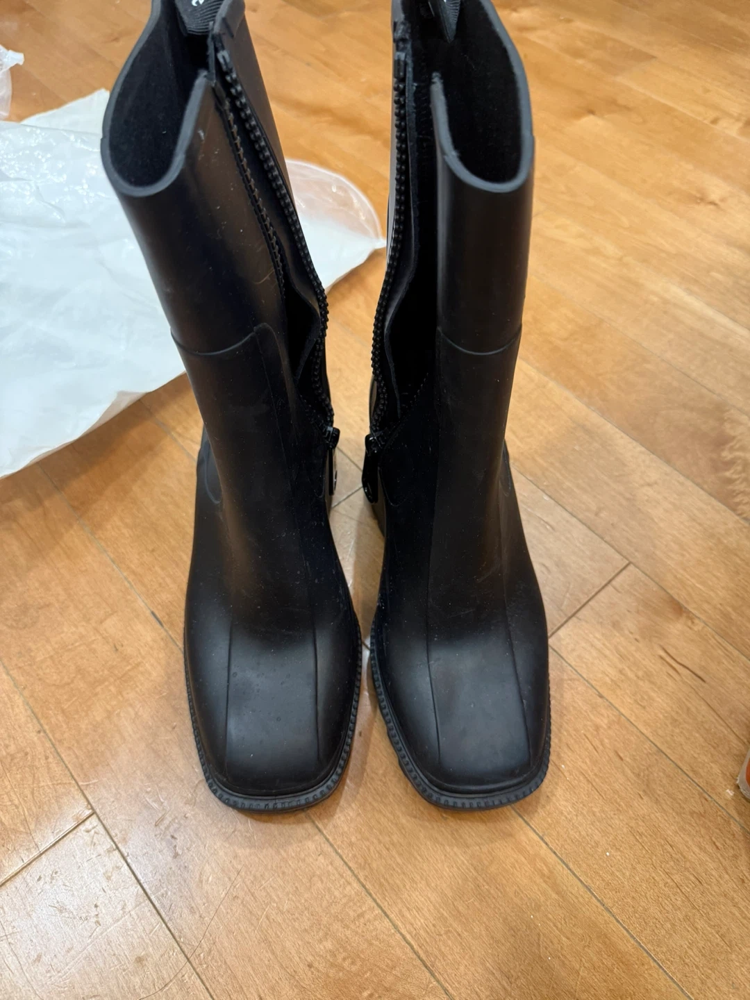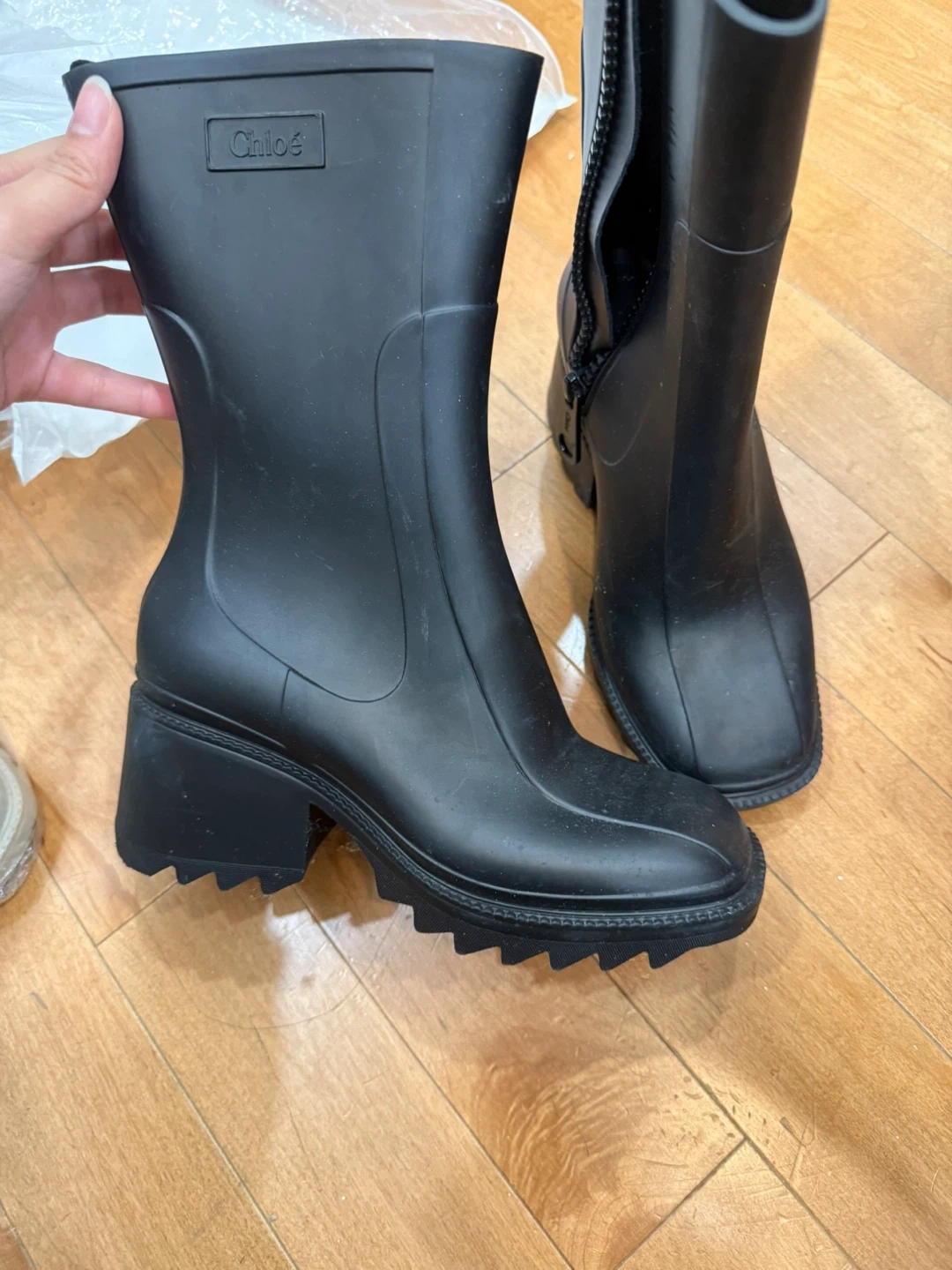 15These are a pair of stylish Chloé rain boots in black rubber! They feature a comfortable heel and a convenient zipper. Perfect for keeping your feet dry and fashionable on rainy days