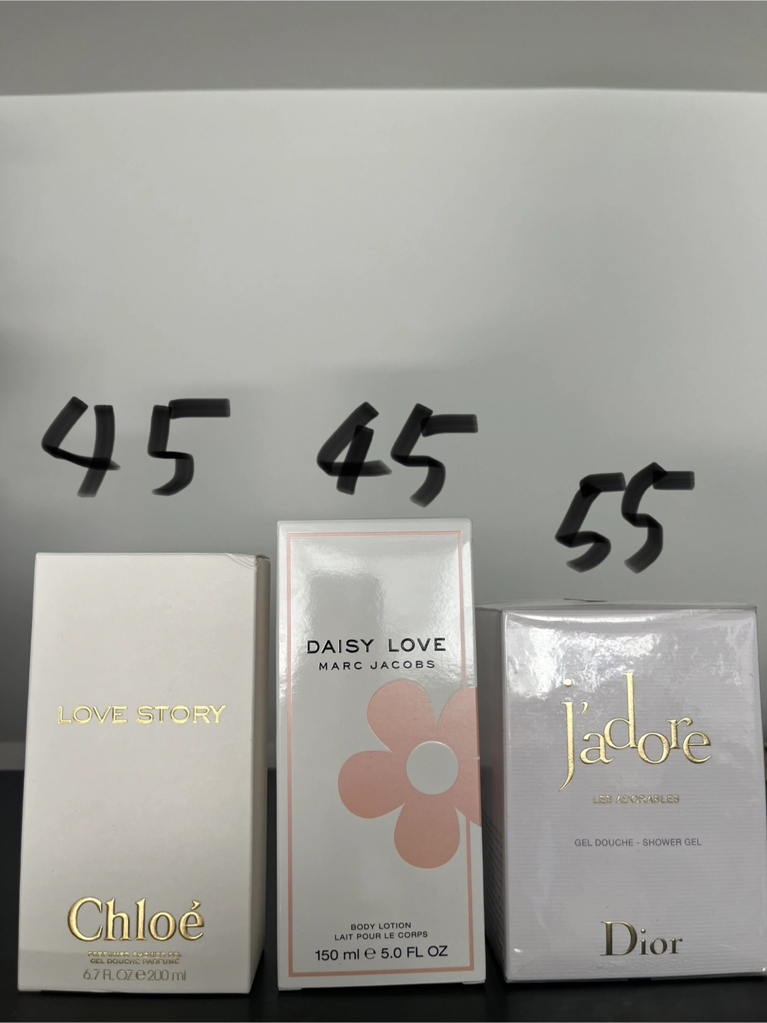 Two shower gel and one body lotion in their original boxes. Price is different as a picture. Each 45-55