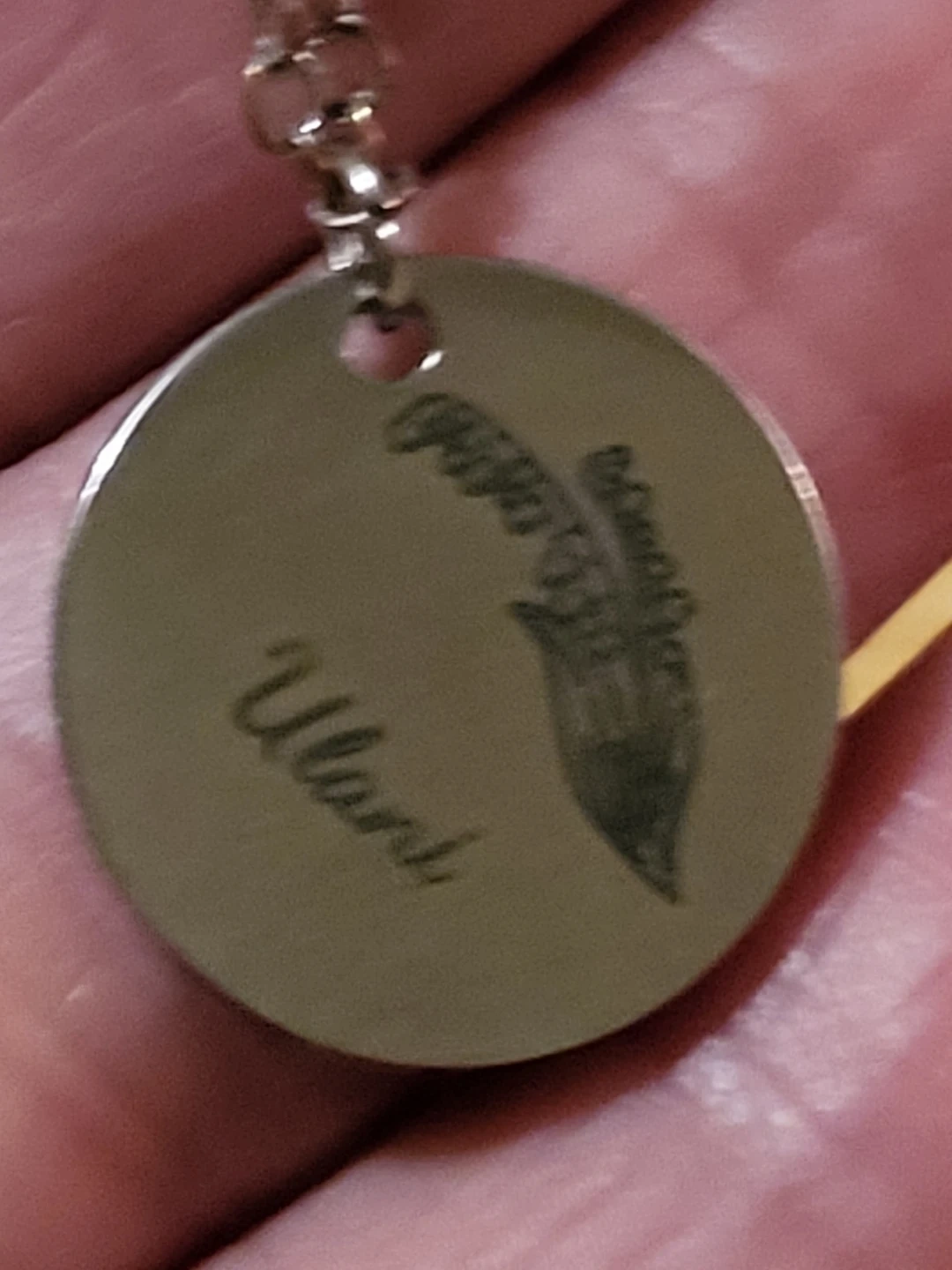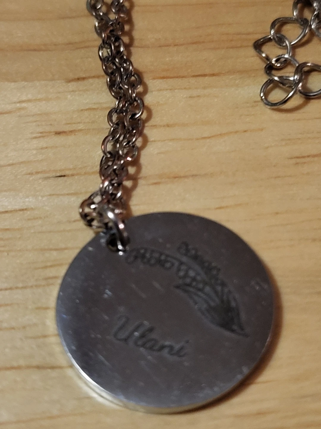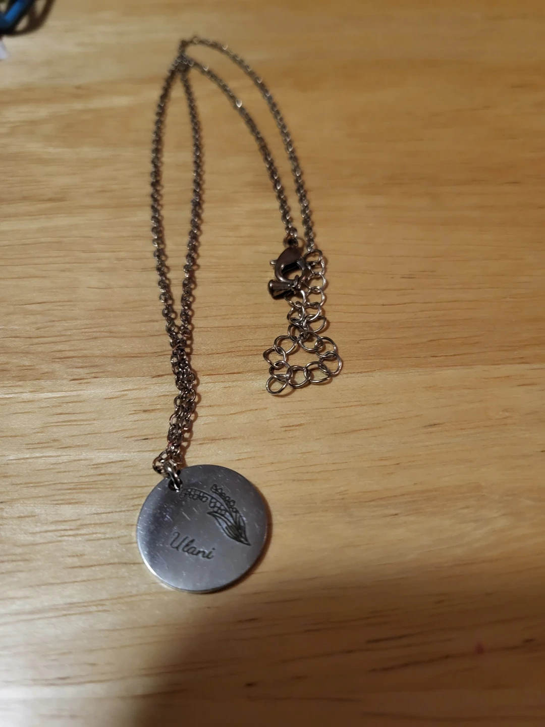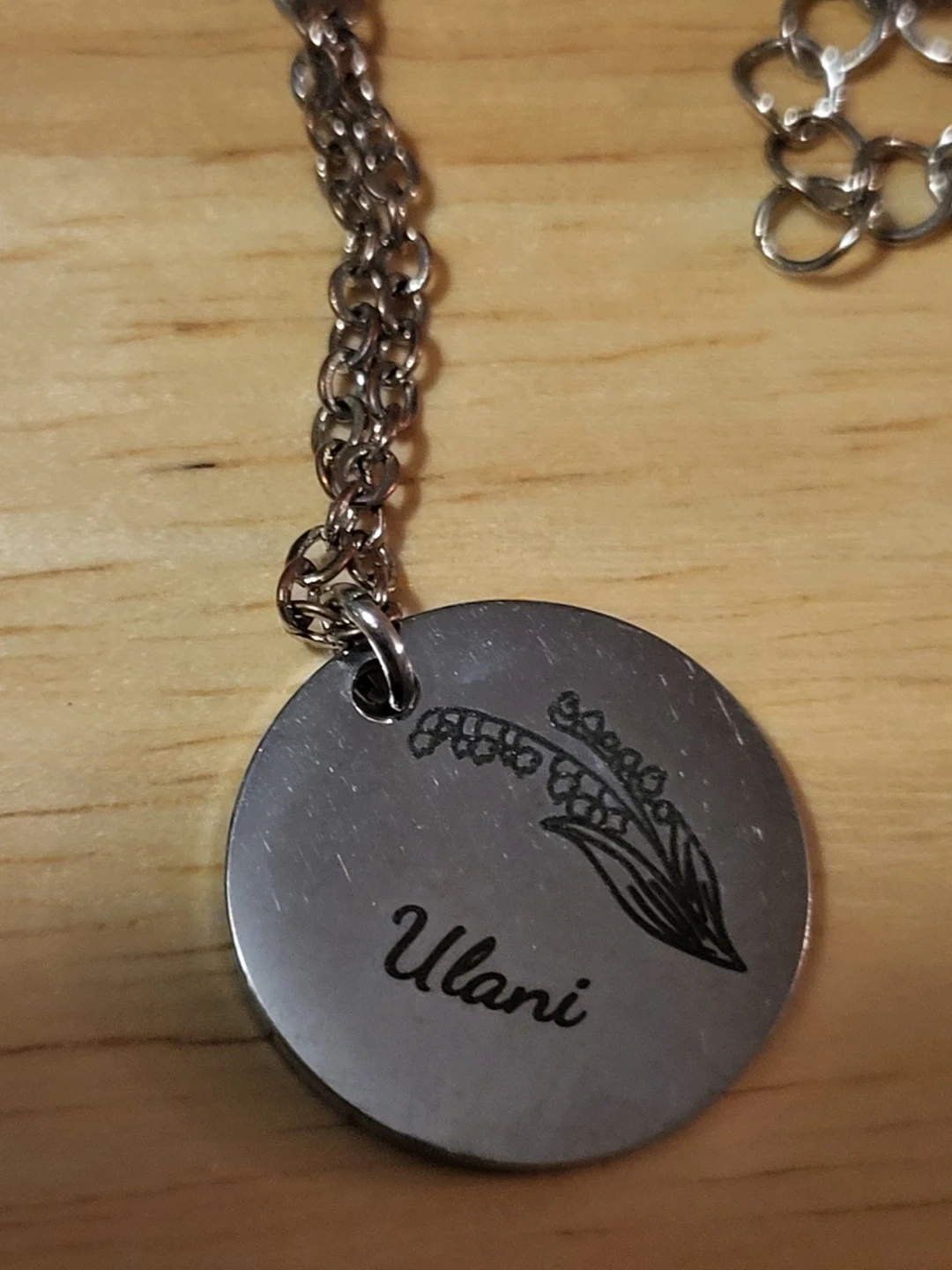 Selling a cute Ulani silver necklace! It features a delicate chain and a circular pendant with a floral design and the name 'Ulani' engraved on it. It's in great condition and ready to add a touch of elegance to your look