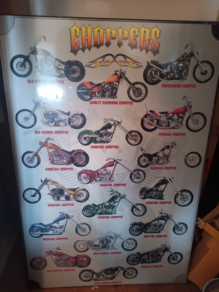 A cool poster featuring various chopper motorcycle styles, including Old School, Harley Davidson, Shovelhead, Panhead, Hardtail, and Softtail choppers
