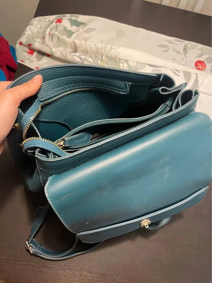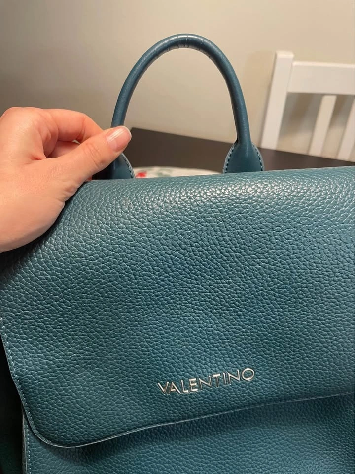 Stylish Mario Valentino backpack in a cool teal color. It's made of pebbled faux leather with a flap closure, adjustable straps, and a top handle, making it great for everyday use. There are small scratches on the bag and inside, all visible in the pictures. Pickup available in the 10019, 10022, and 10003 areas.