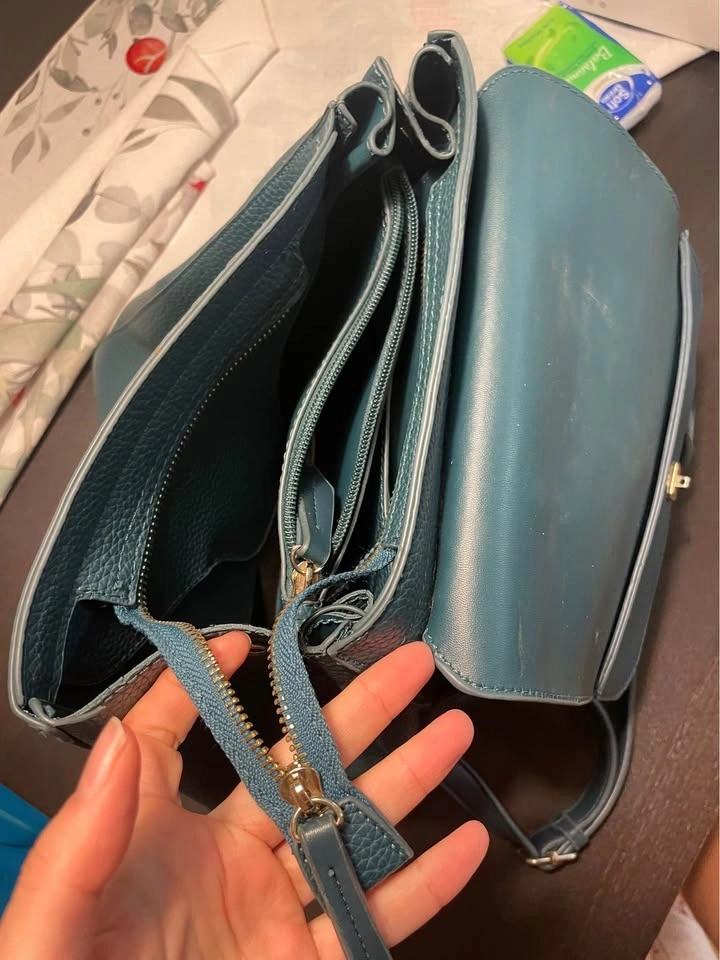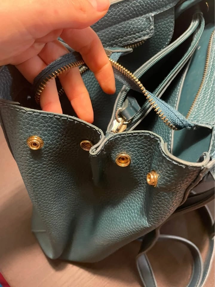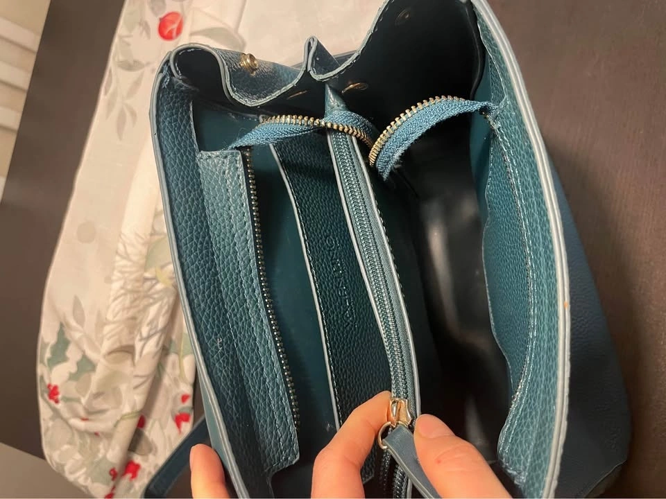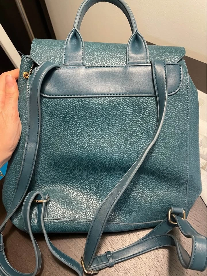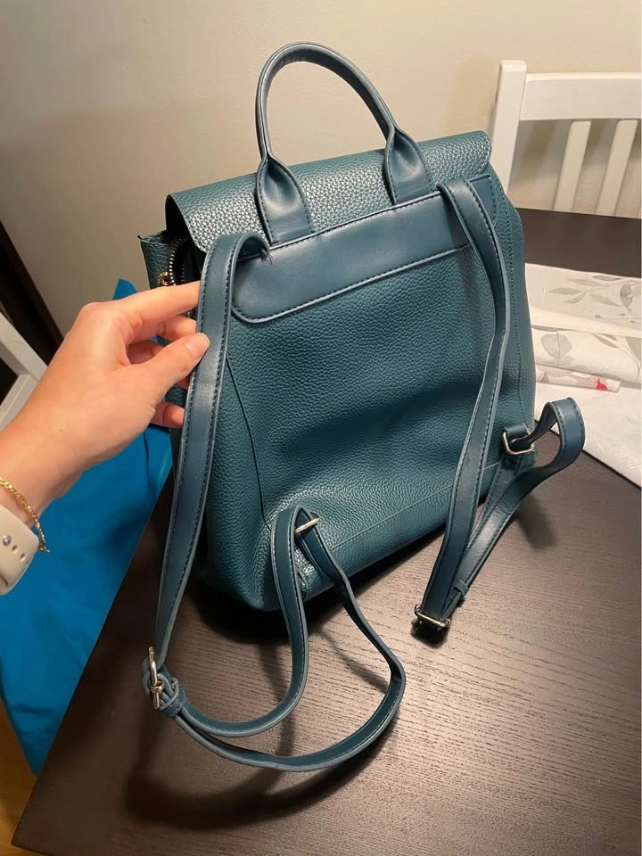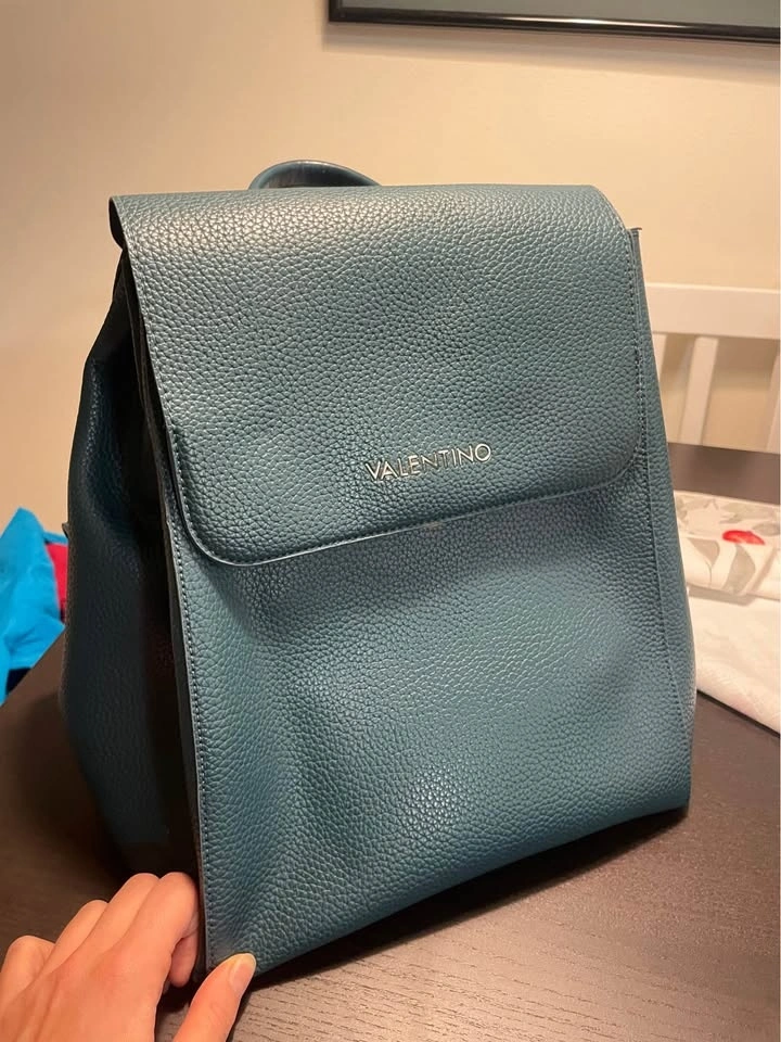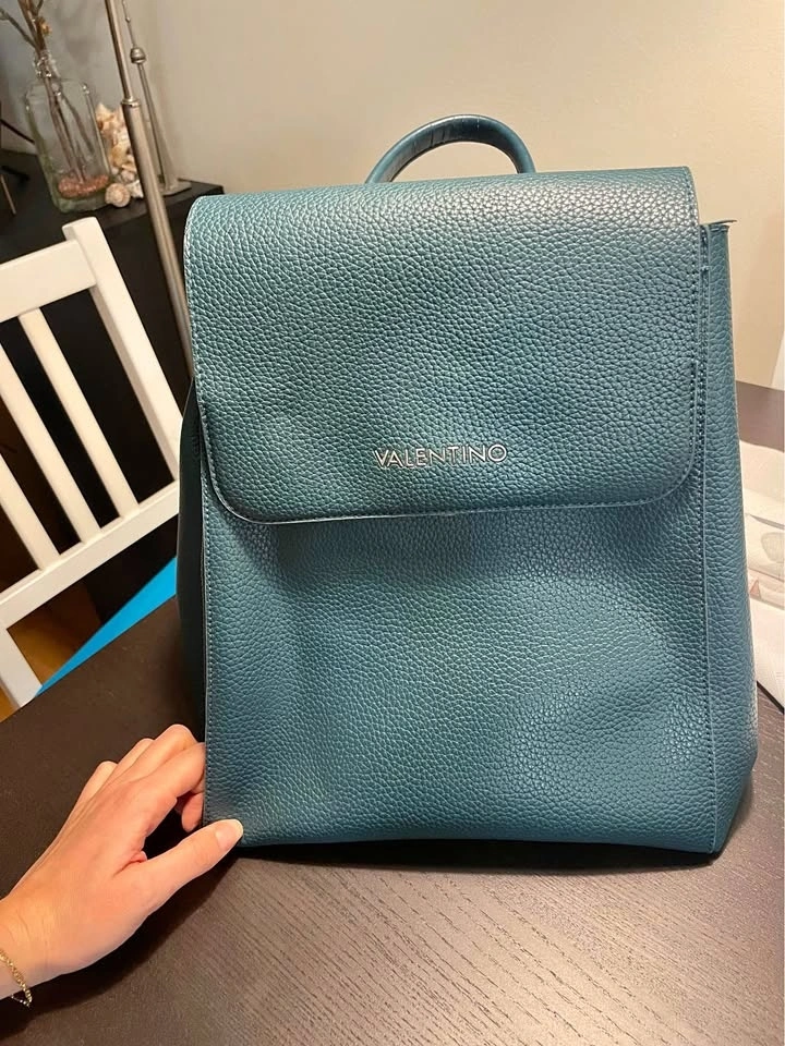 Stylish Mario Valentino backpack in a cool teal color. It's made of pebbled faux leather with a flap closure, adjustable straps, and a top handle, making it great for everyday use. There are small scratches on the bag and inside, all visible in the pictures. Pickup available in the 10019, 10022, and 10003 areas.