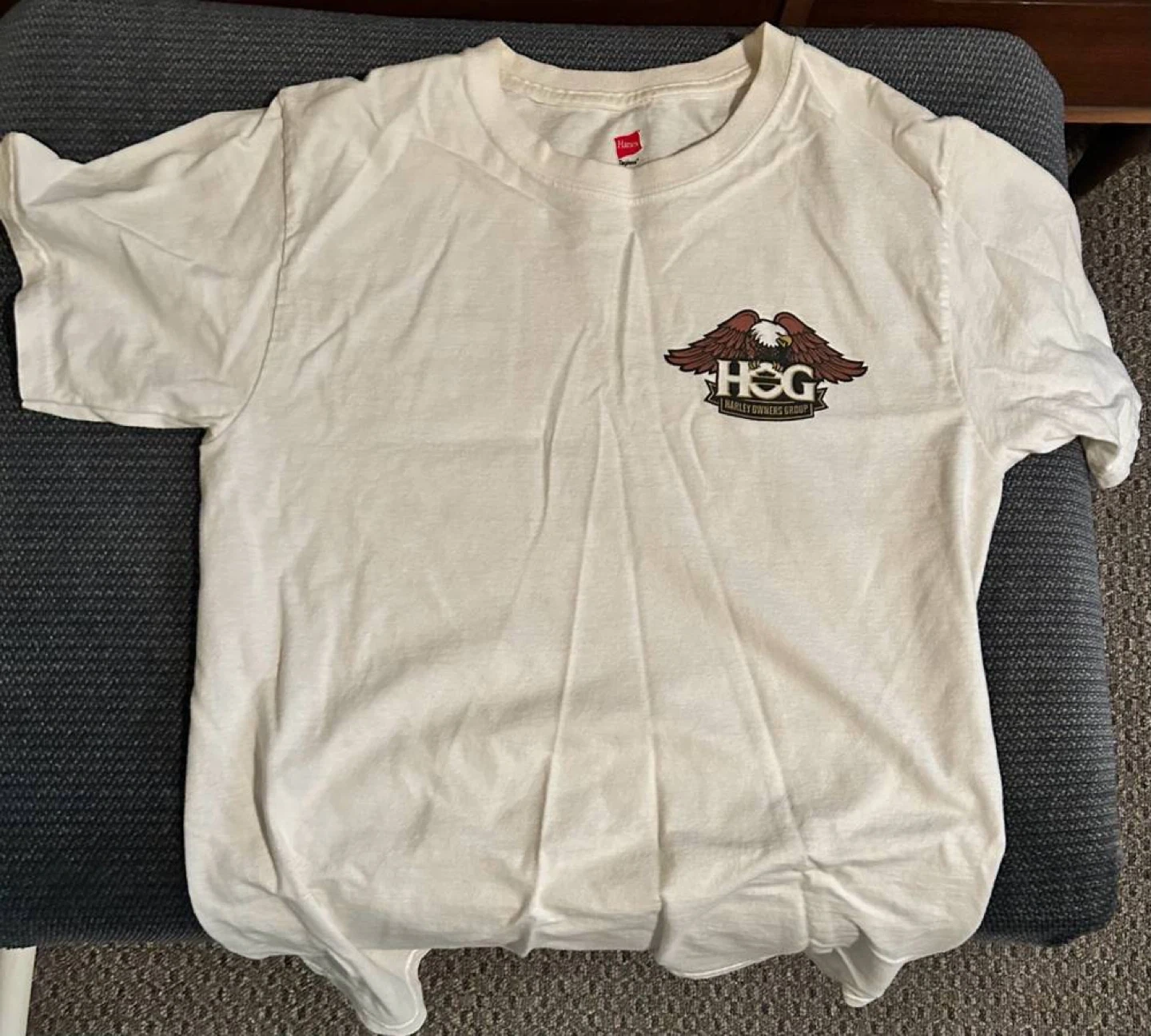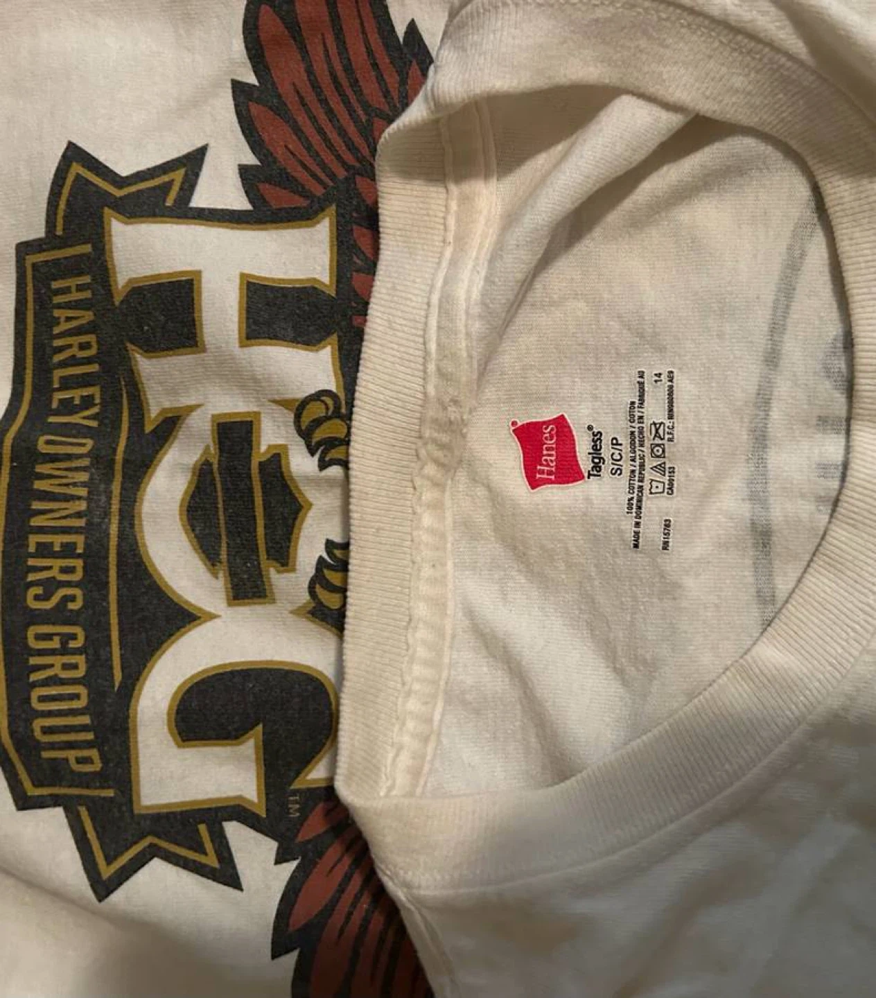 Selling a Hanes T-shirt featuring the Harley Owners Group (HOG) logo. It's a size small and made of cotton. The shirt has a design on both the front and back. It is in used condition.