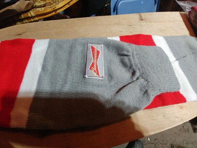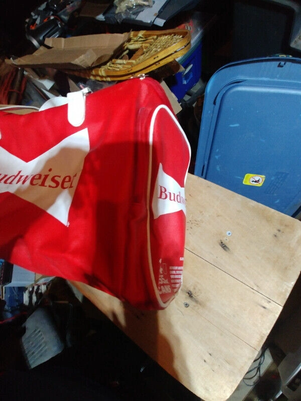 Up for sale we have these 4 Budweiser pieces we have a 2 x 24 can Cooler Bag with 2 side pocket in like new condition and we have 2 New Scarf with hand warmer 52 “ long Asking $30 for all 3 pieces Pickup on Old Richmond Road in Nepean