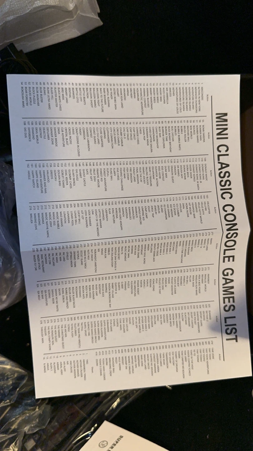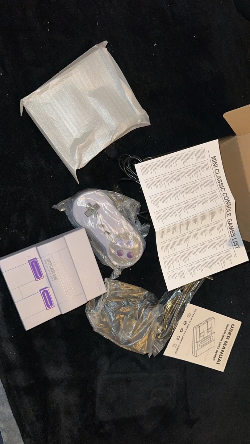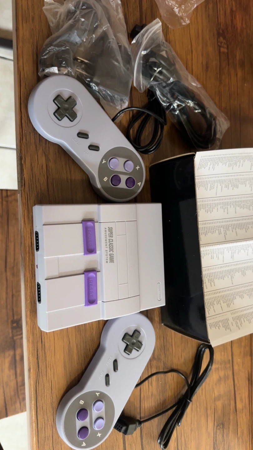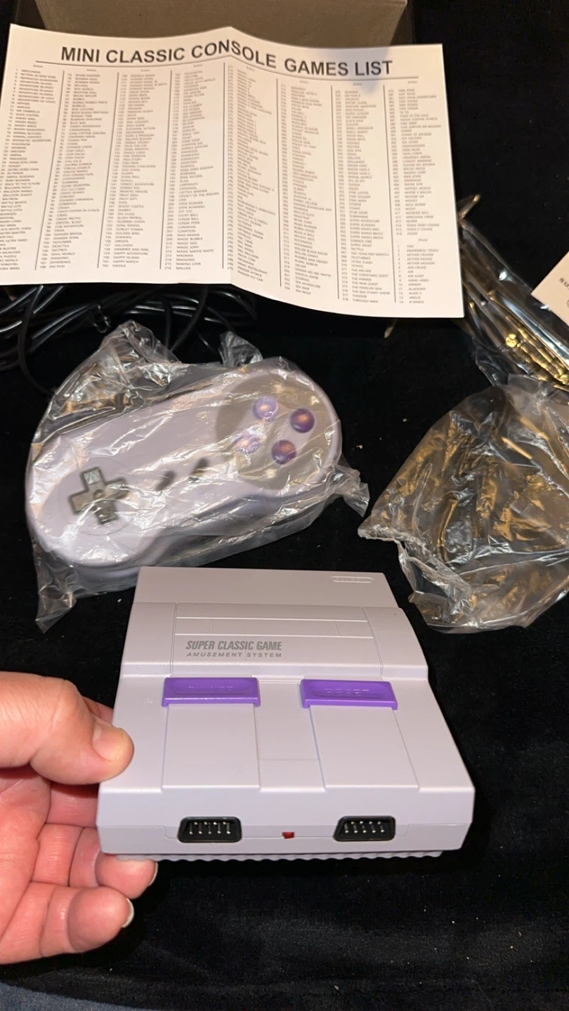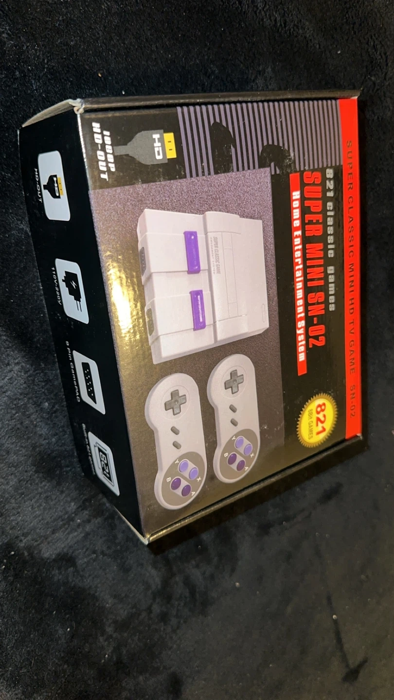 This is the Super Mini SN-02 Home Entertainment System, a classic game console. It comes with two controllers and a list of included games. The console supports HD output and operates on 110-220V.