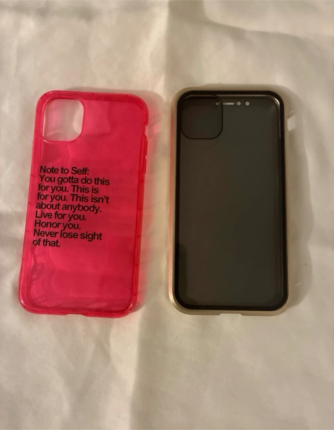 This is a pink phone case with a "Note to Self" quote printed on it. The case is made of transparent, durable material. It's designed to protect your phone from everyday wear and tear. A second inner case with a dark gray finish is also included.