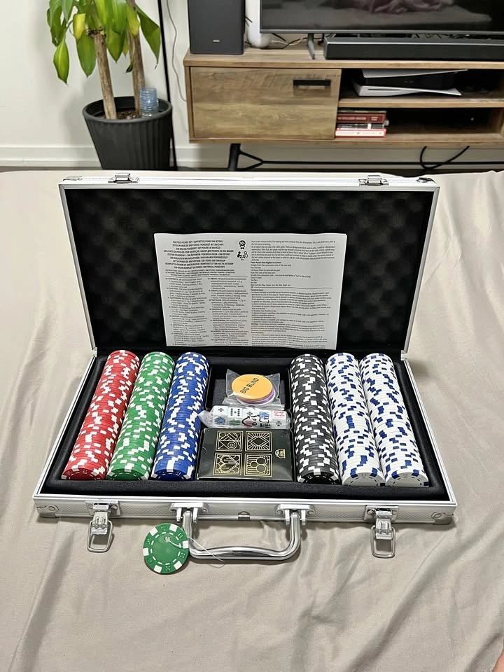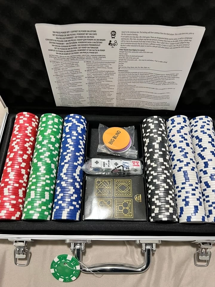 Pickup only - Stouffville L4A. Cash only. Set includes 300 professional weight poker chips, 1 card deck, 1 dealer button, 2 betting buttons, and 5 poker dice.
