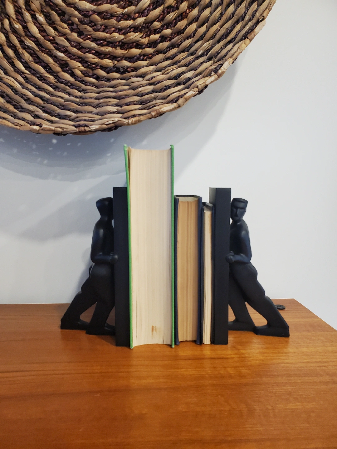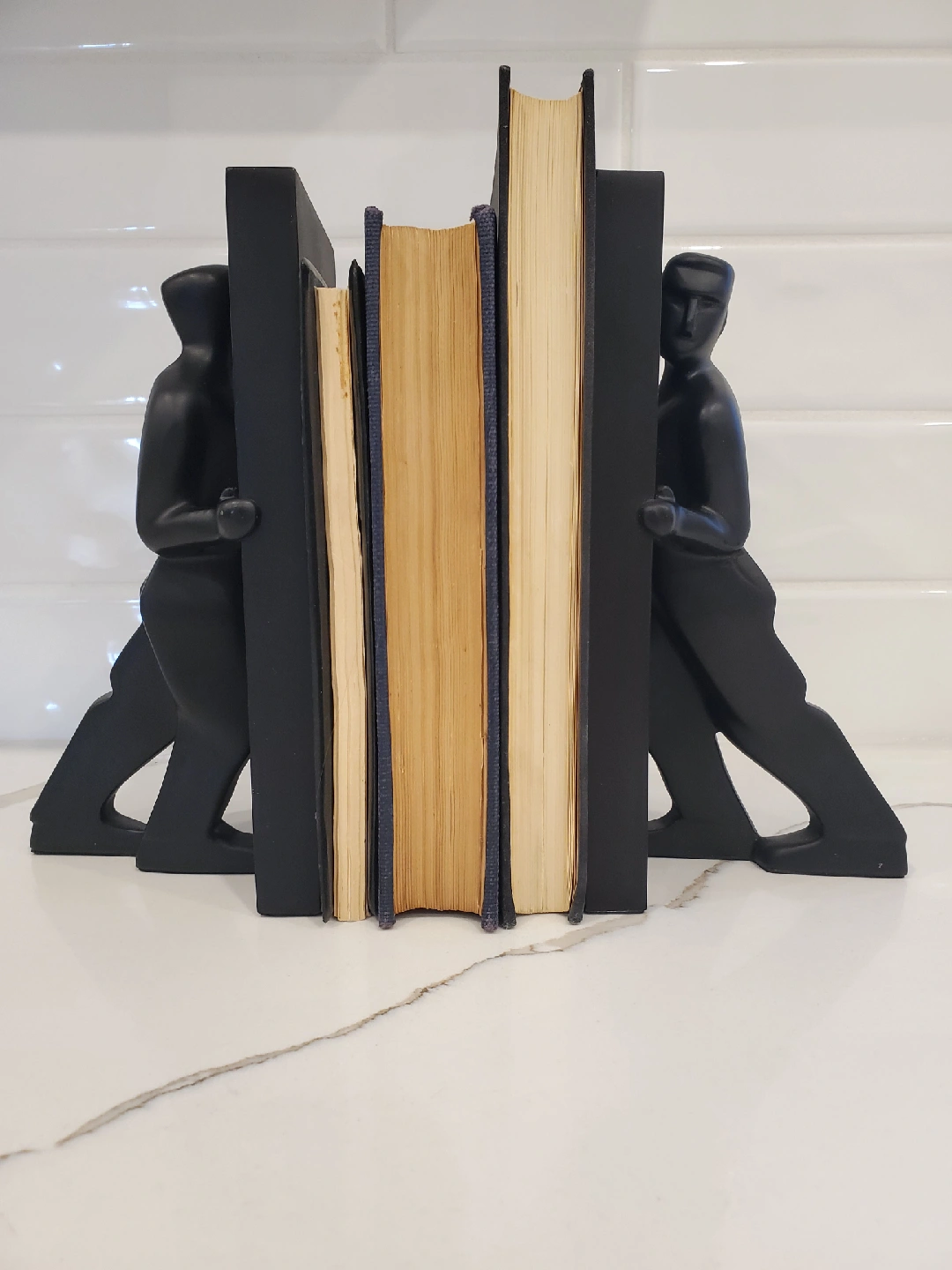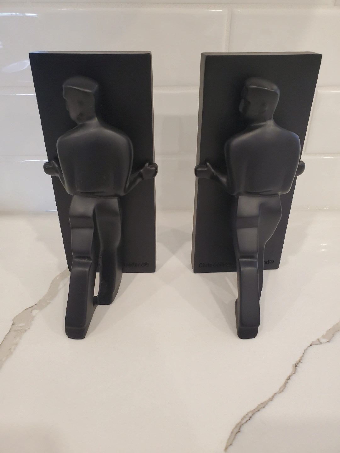 113Pushing Men Bookend Set Of 2. Vintage is mid 2000’s. A quality style statement to any office or home library. • Chris Collicott designed for the Kikkerland Brand beginning in mid 2000’s. • Modern machine age inspired. • Black glazed stone composite with weight to hold books upright. • Close to 8” tall, 3” x 4.5 wide at the base Accept cash only. Can meet in Mississauga or Hamilton area. More on Chris Collicott’s work below: https://kikkerland.com/blogs/stories/in-memoriam-chris-collicott-1953-2016?srsltid=AfmBOorrBmfL1GVfkRG5Bdhrf3bi6sjpNBGFAOafBzJWNcNCBIY6W50p