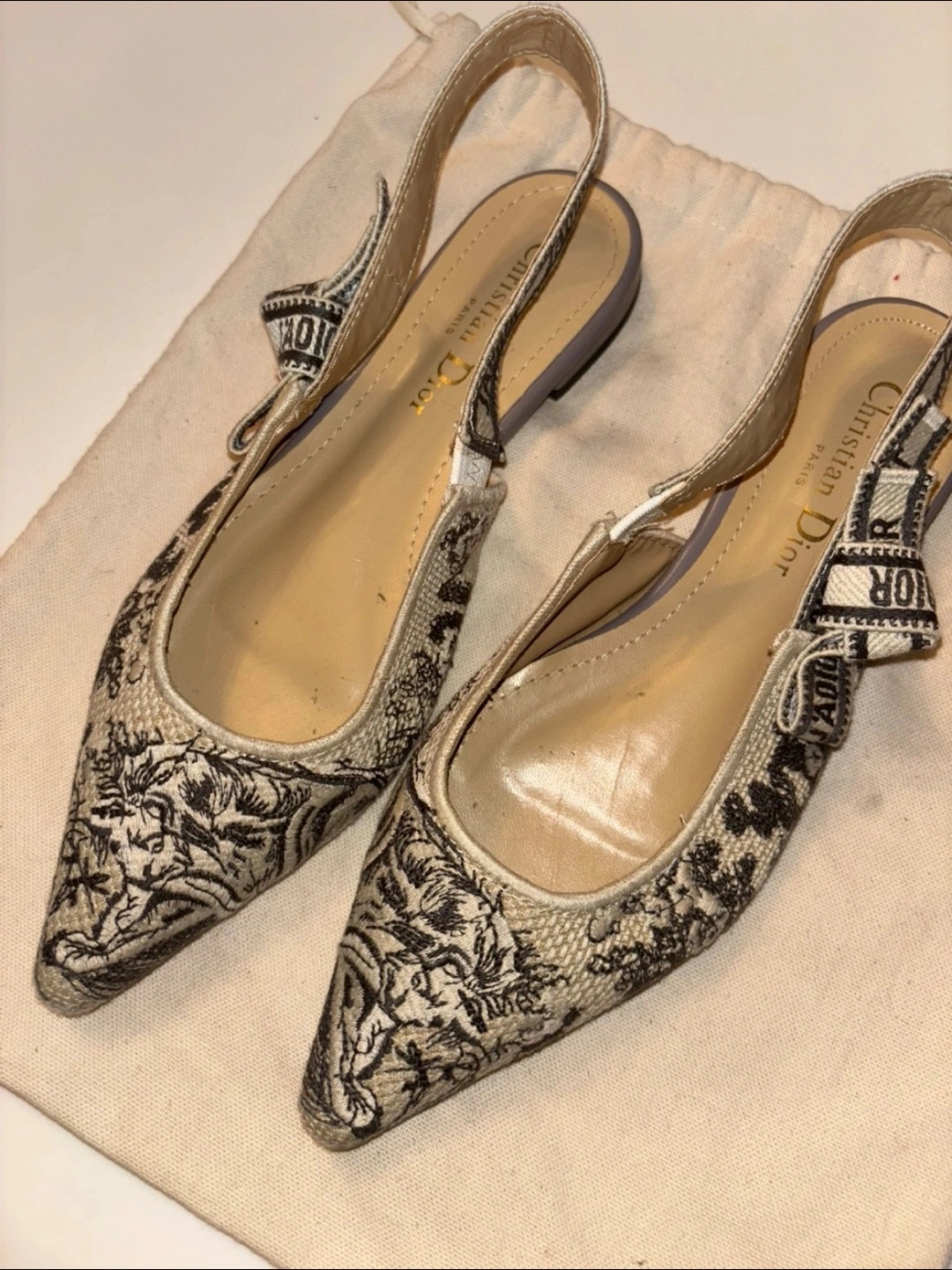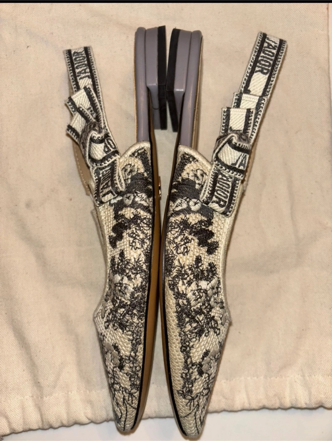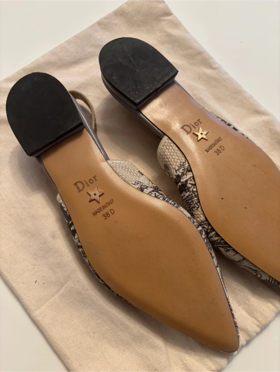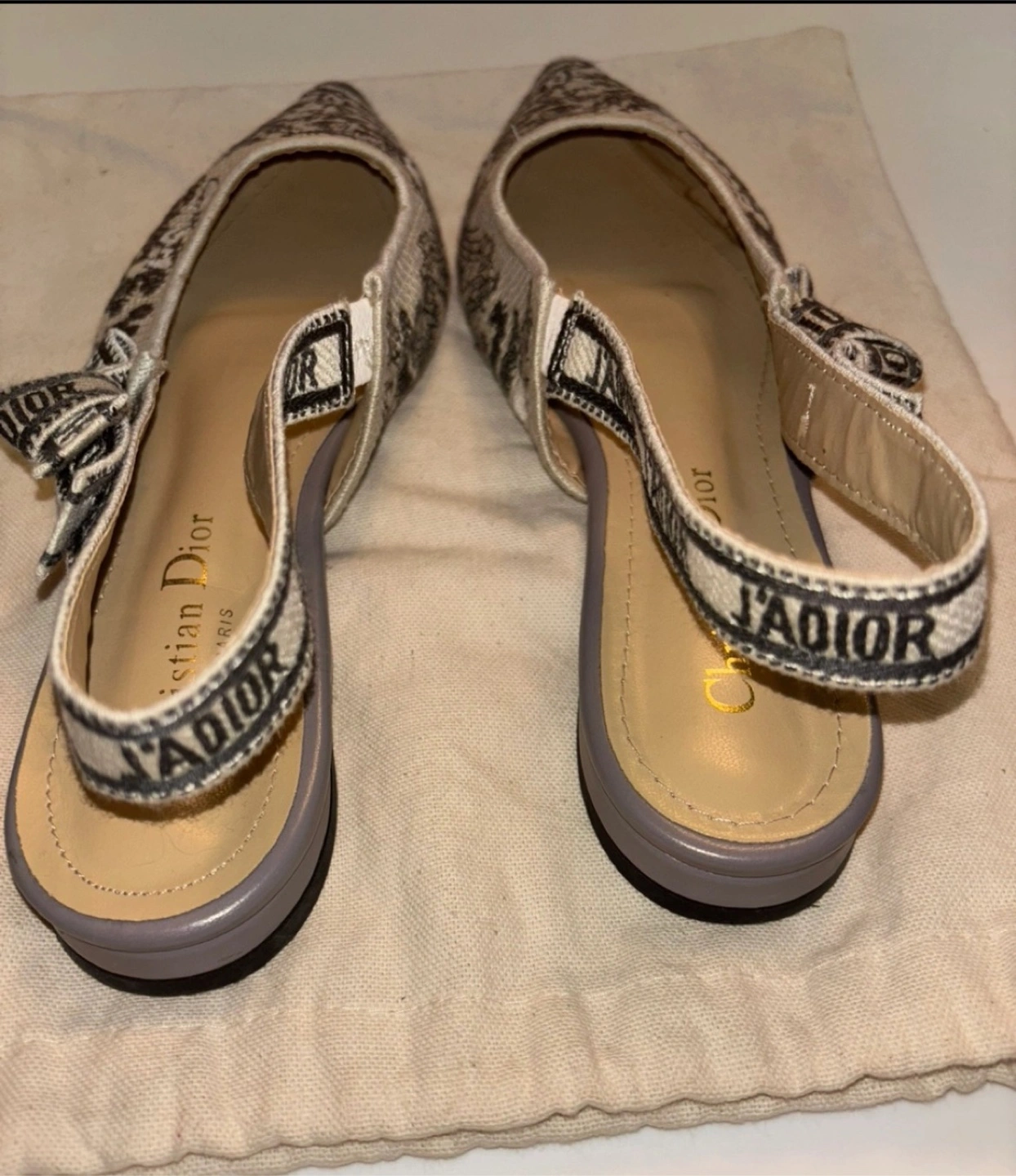 Selling a pair of Christian Dior J'Adior slingback ballet flats. They are a size 38. The shoes are in good condition and feature the iconic 'J'Adior' ribbon detail. Perfect for adding a touch of elegance to any outfit!