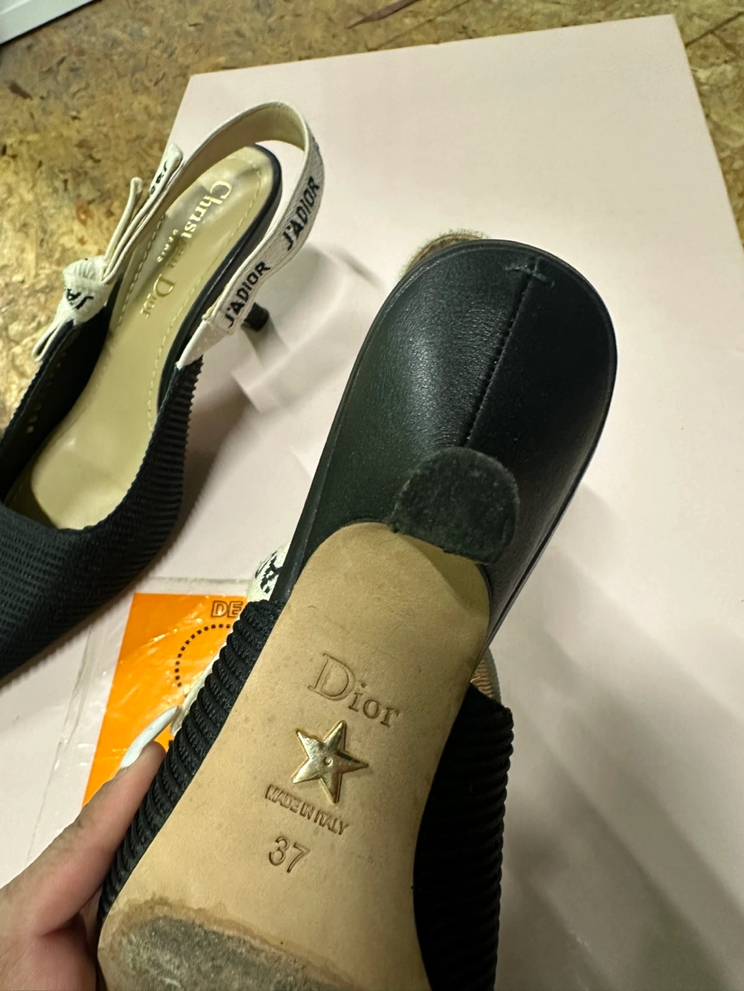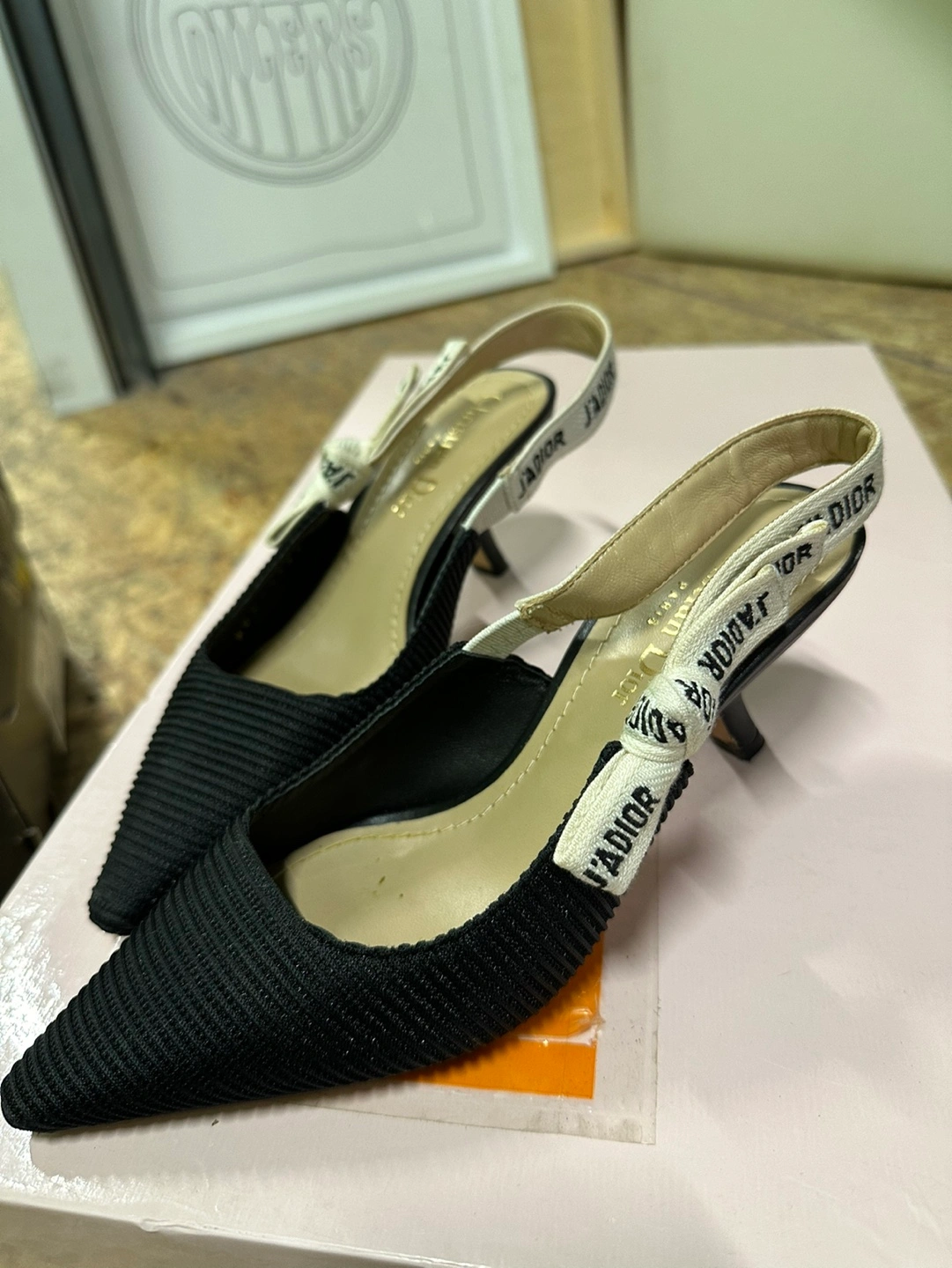 68Black fabric slingback heels. Pointed toe. Kitten heel. J'Adior detail on strap. Made in Italy. size 37