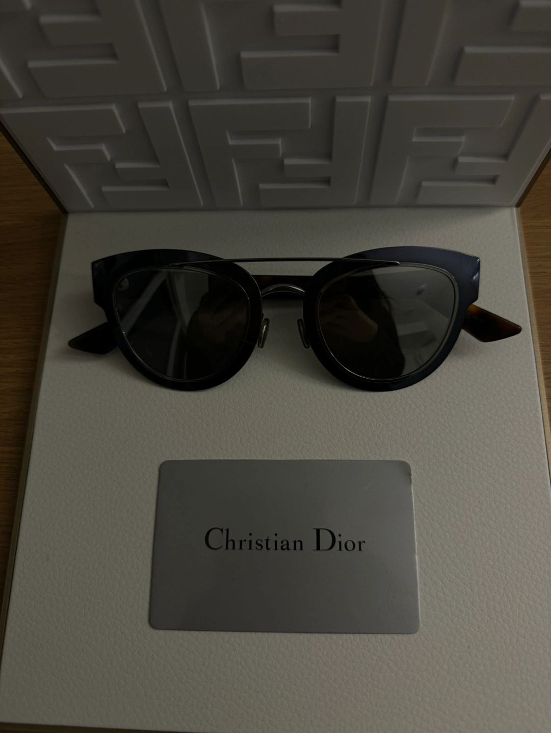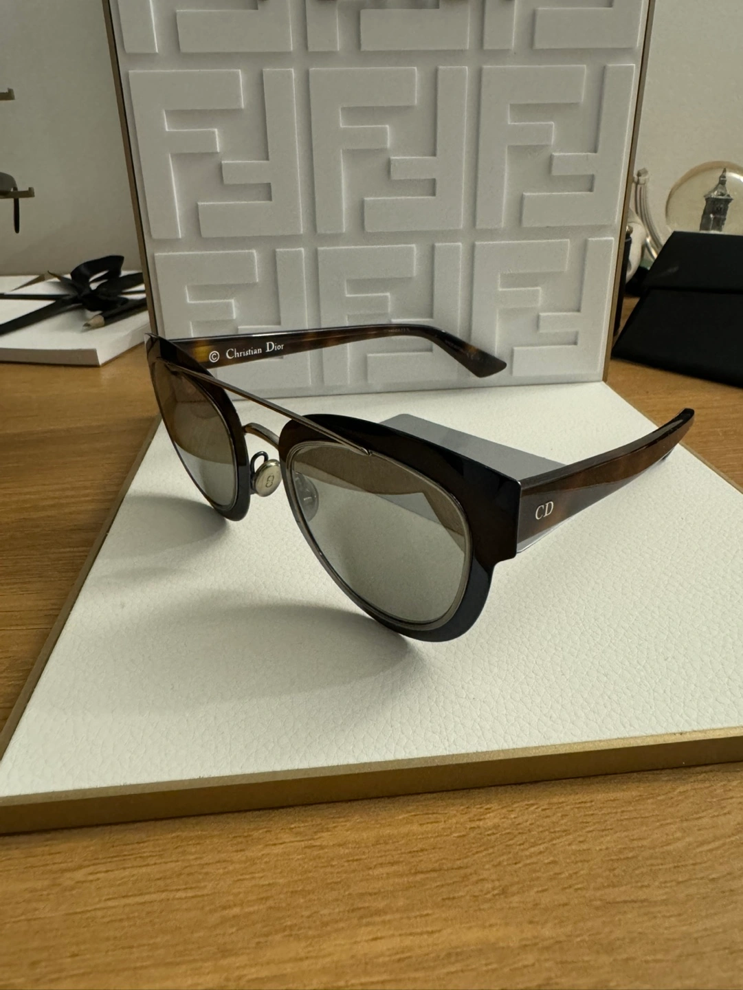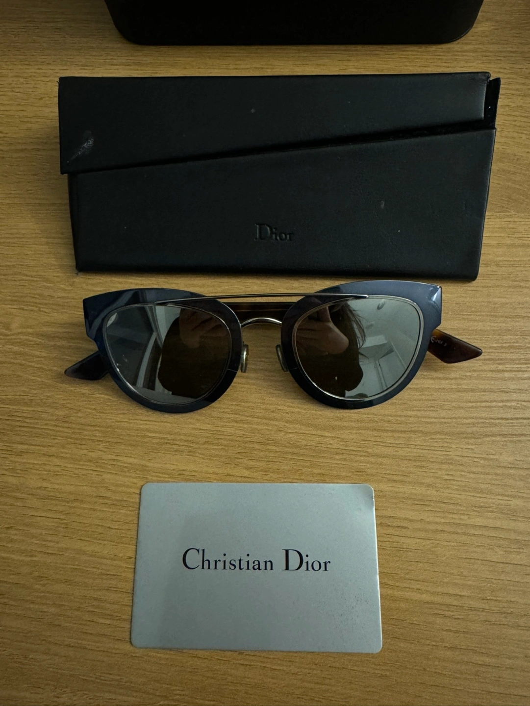 Authentic Christian Dior sunglasses. Brown and blue frames. Mirror lenses. Comes with case and cleaning cloth. Excellent condition.