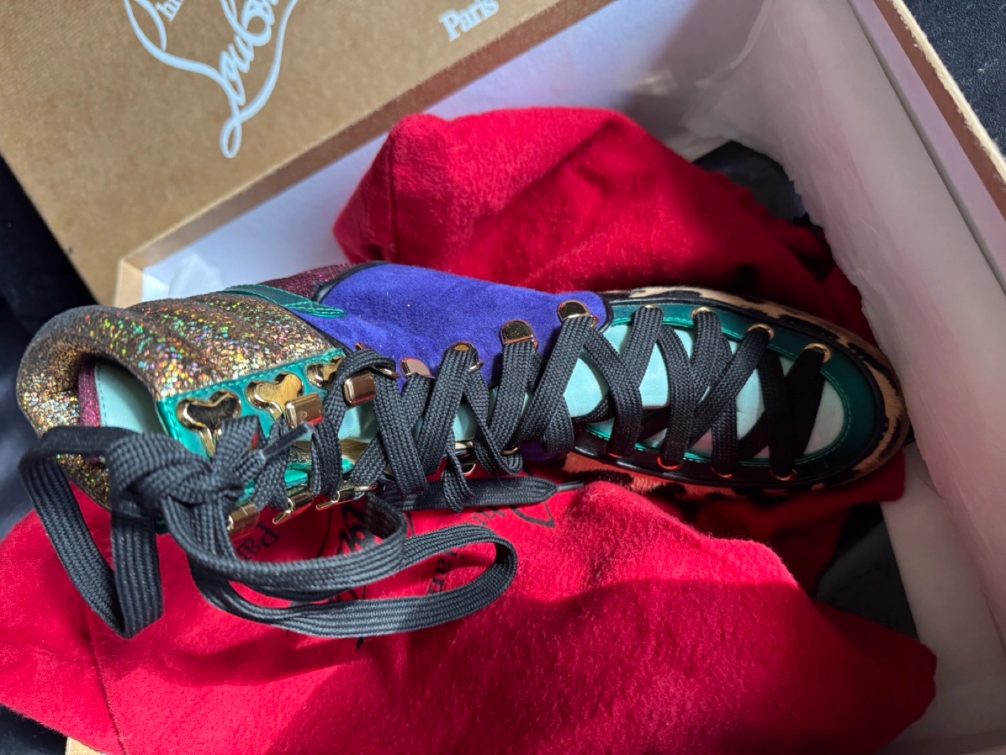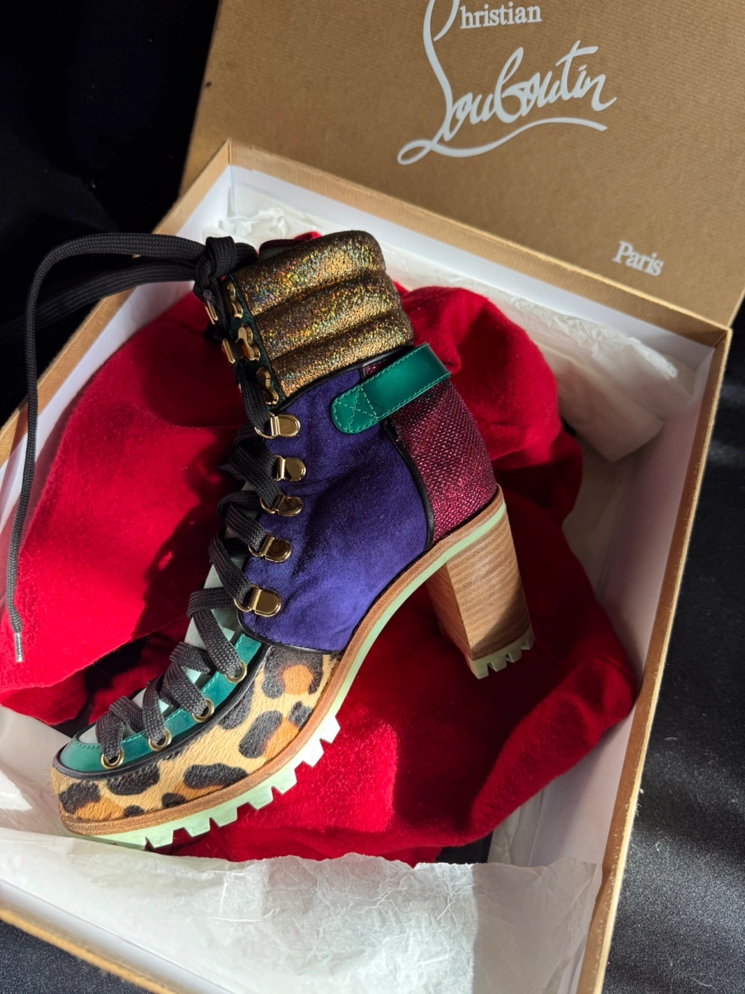 41These Christian Louboutin ankle boots are a unique statement piece! They feature a mix of textures and colours, including leopard print, purple suede, and glittery accents. The boots are in excellent condition and come with the original box & dust bag. Like just unboxed!
