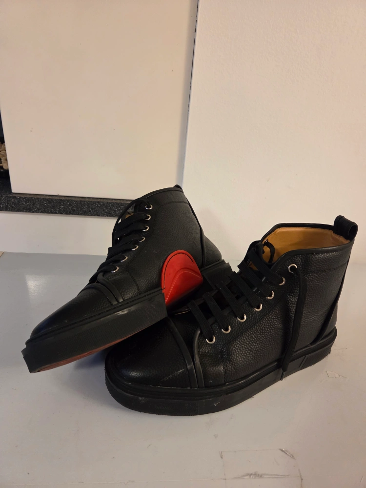 185Selling a pair of Christian Louboutin high-top sneakers in black leather. These stylish sneakers feature the iconic red sole.