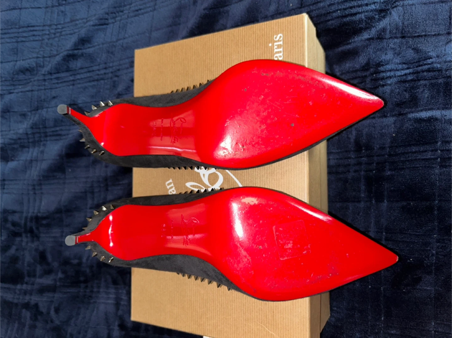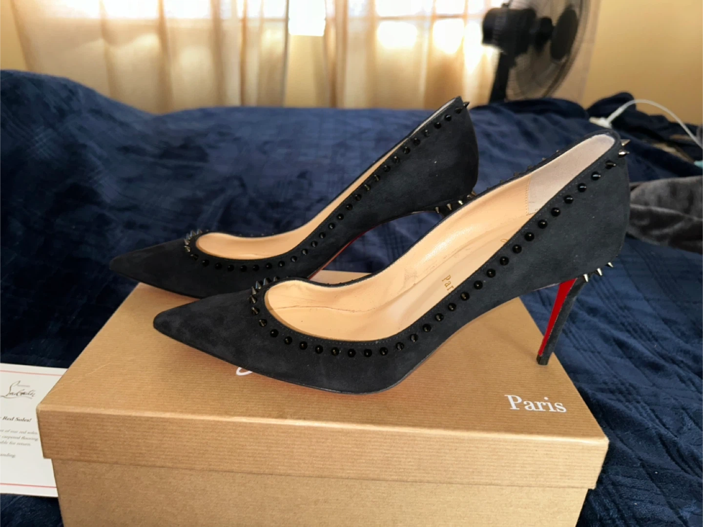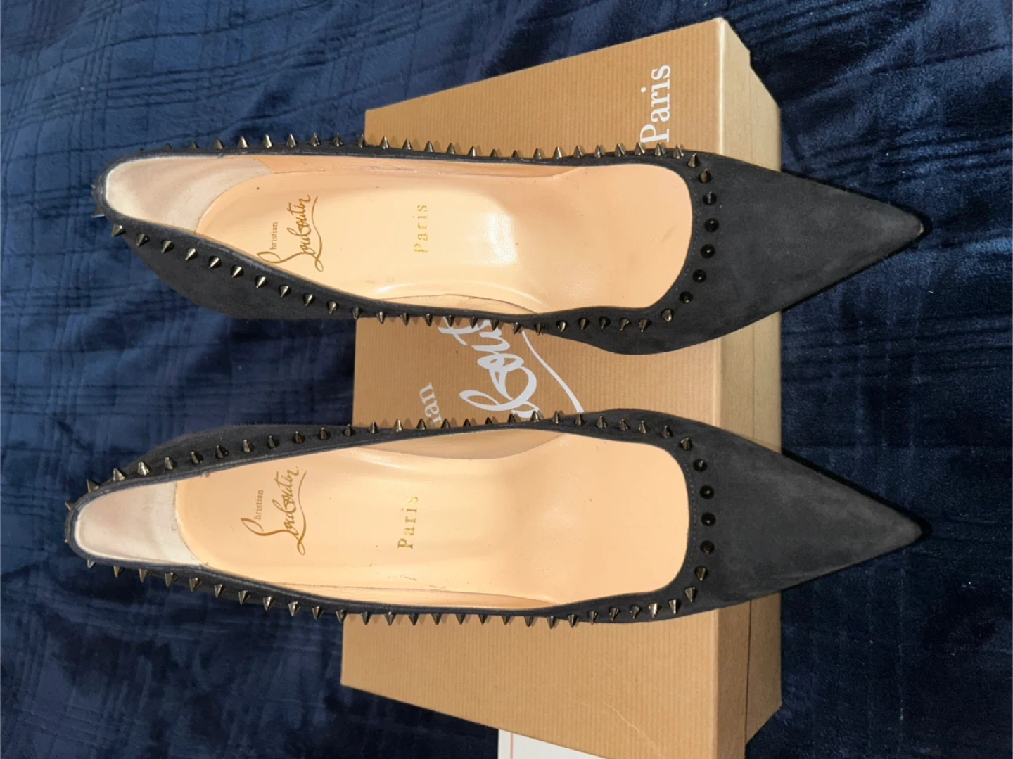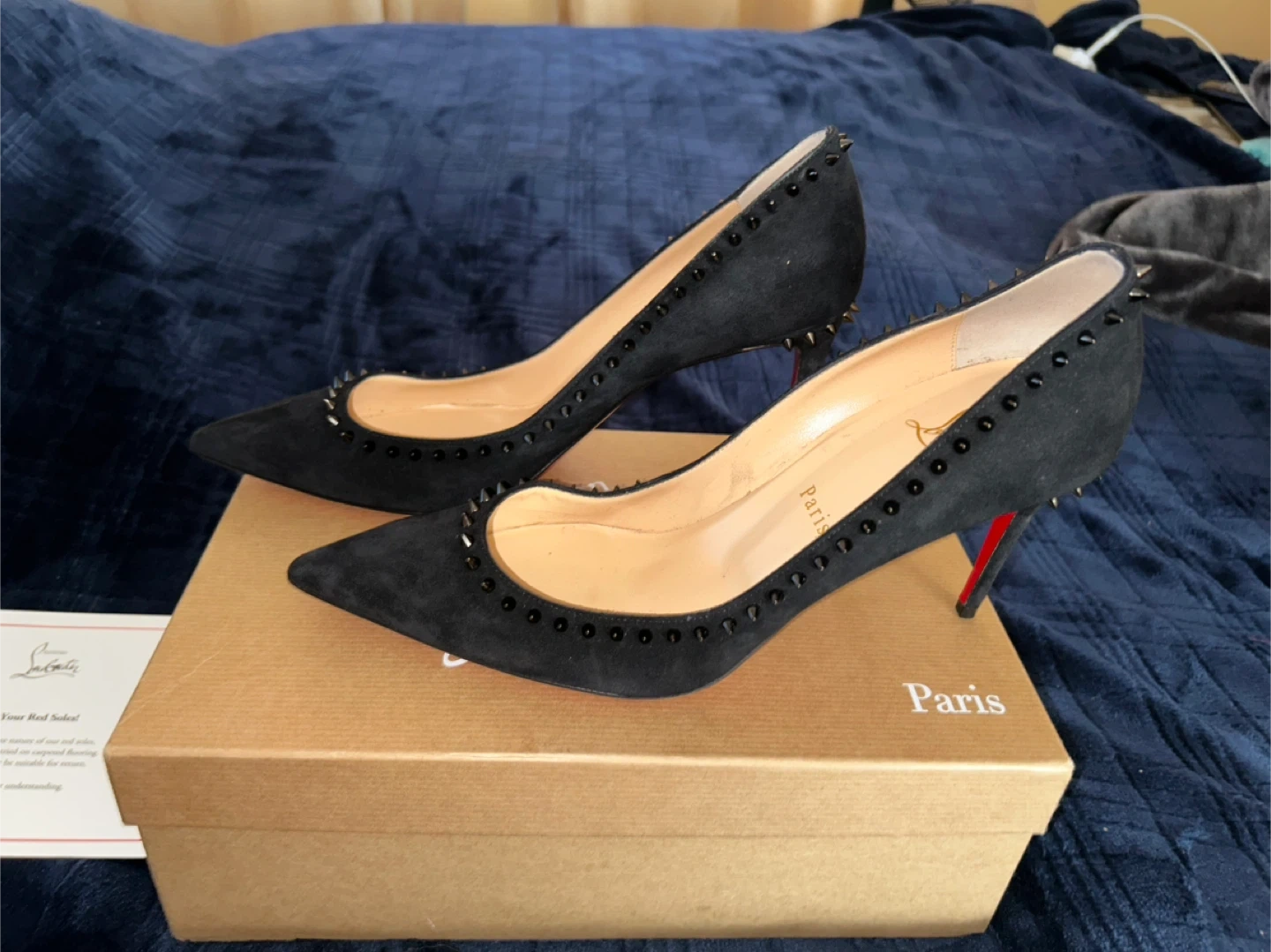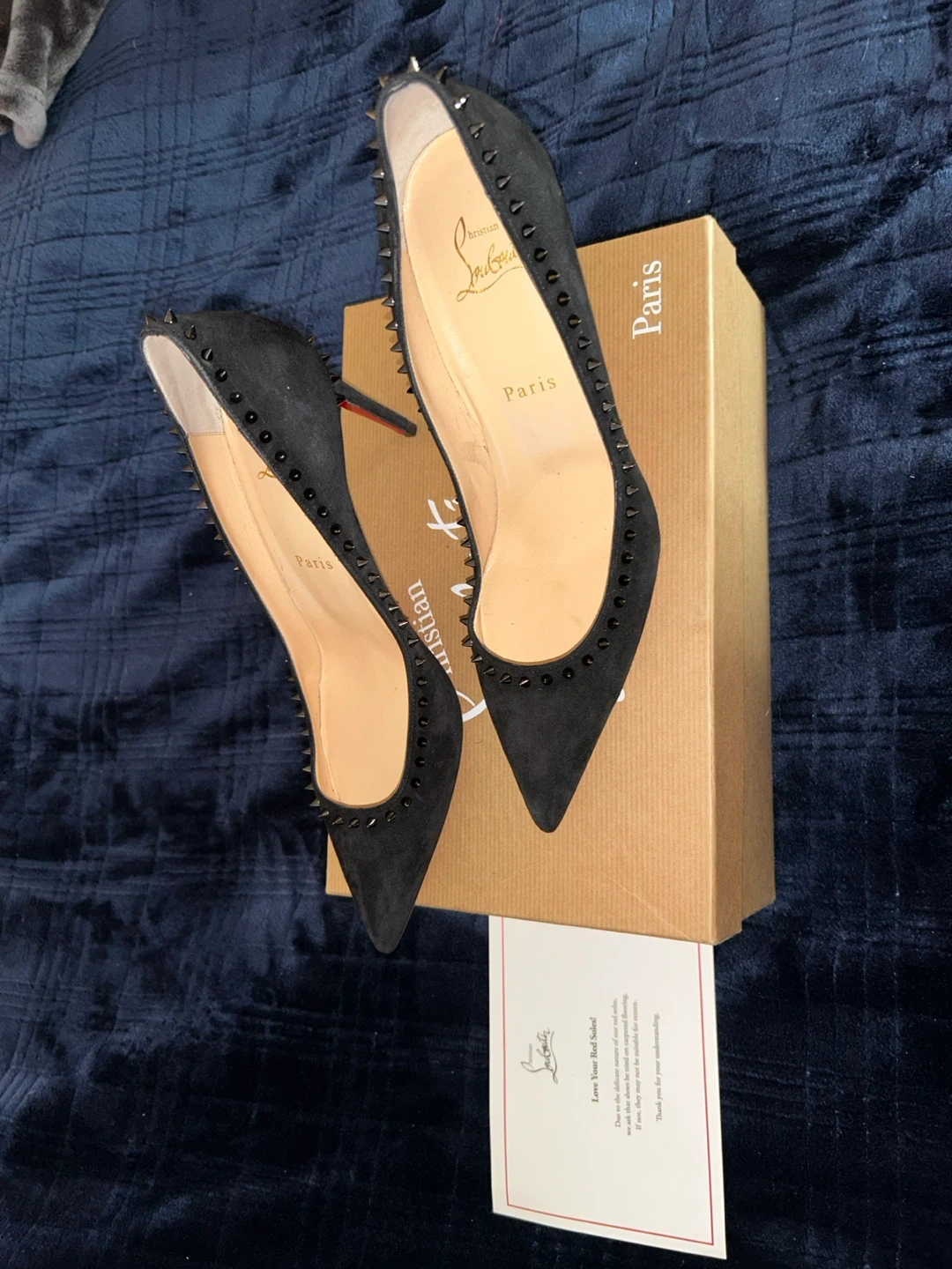 10Selling a pair of Christian Louboutin heels in black suede. These have a studded design and the iconic red soles. They come with the original box and dust bags. Perfect for adding a touch of luxury to any outfit!