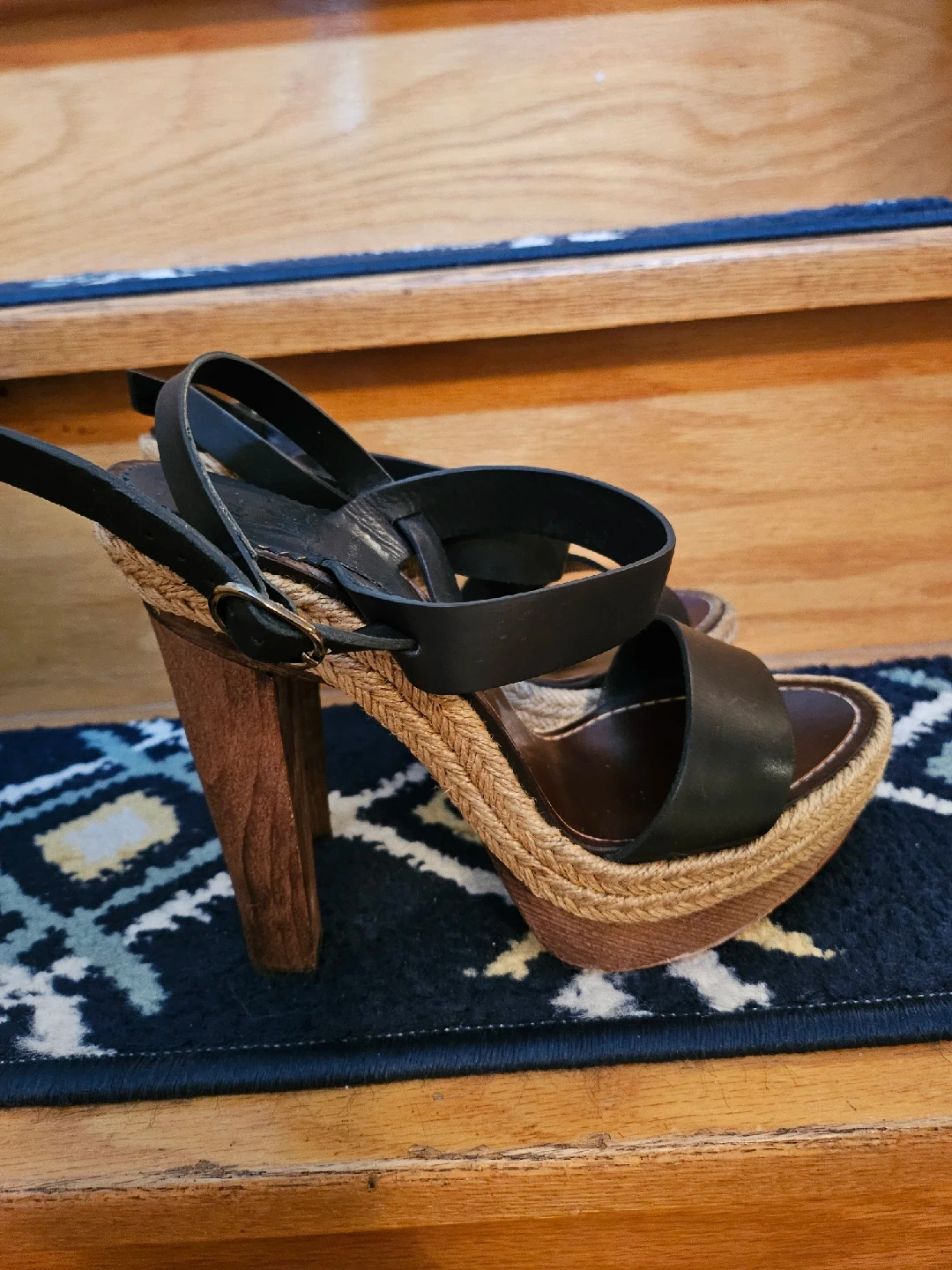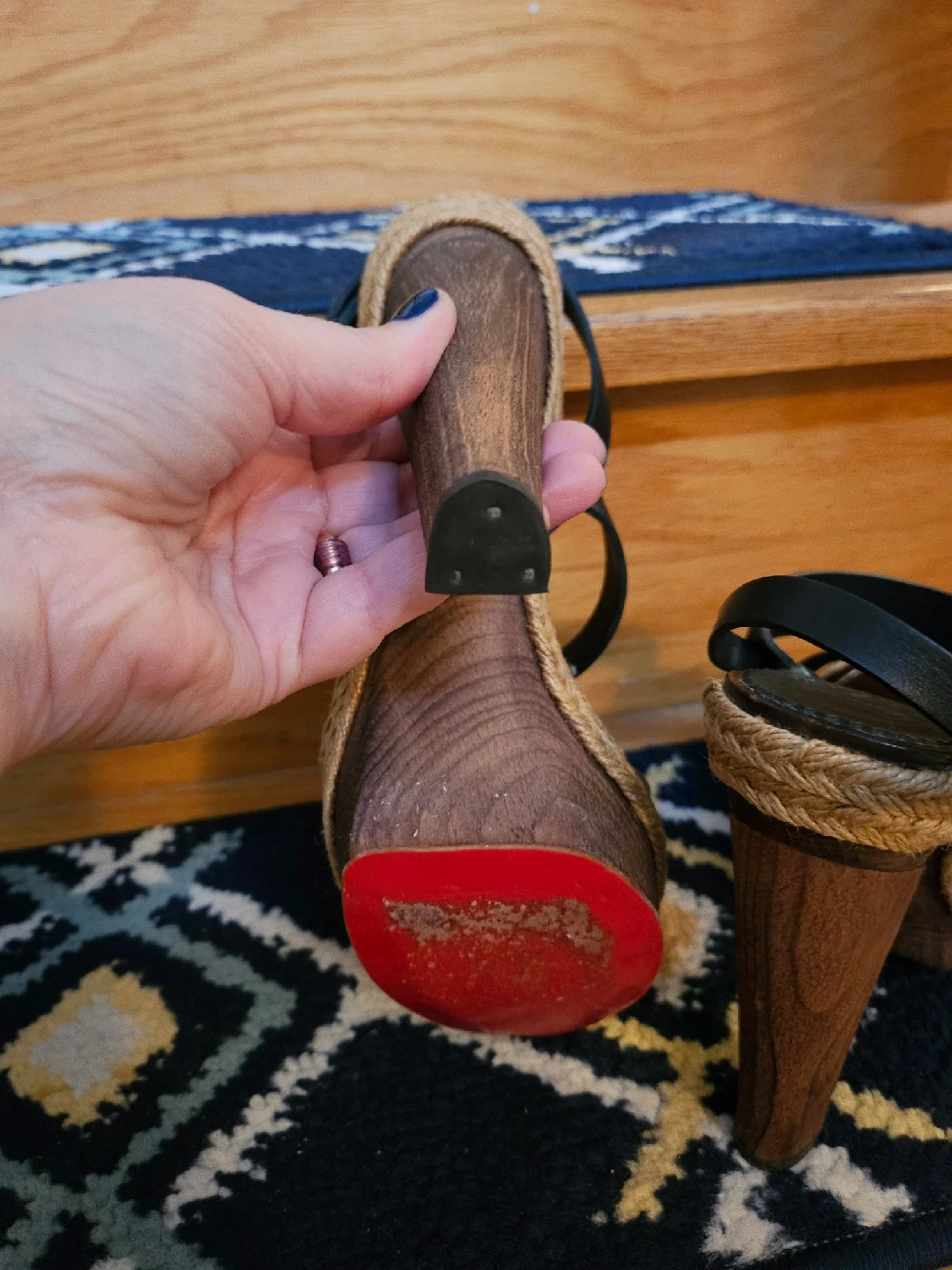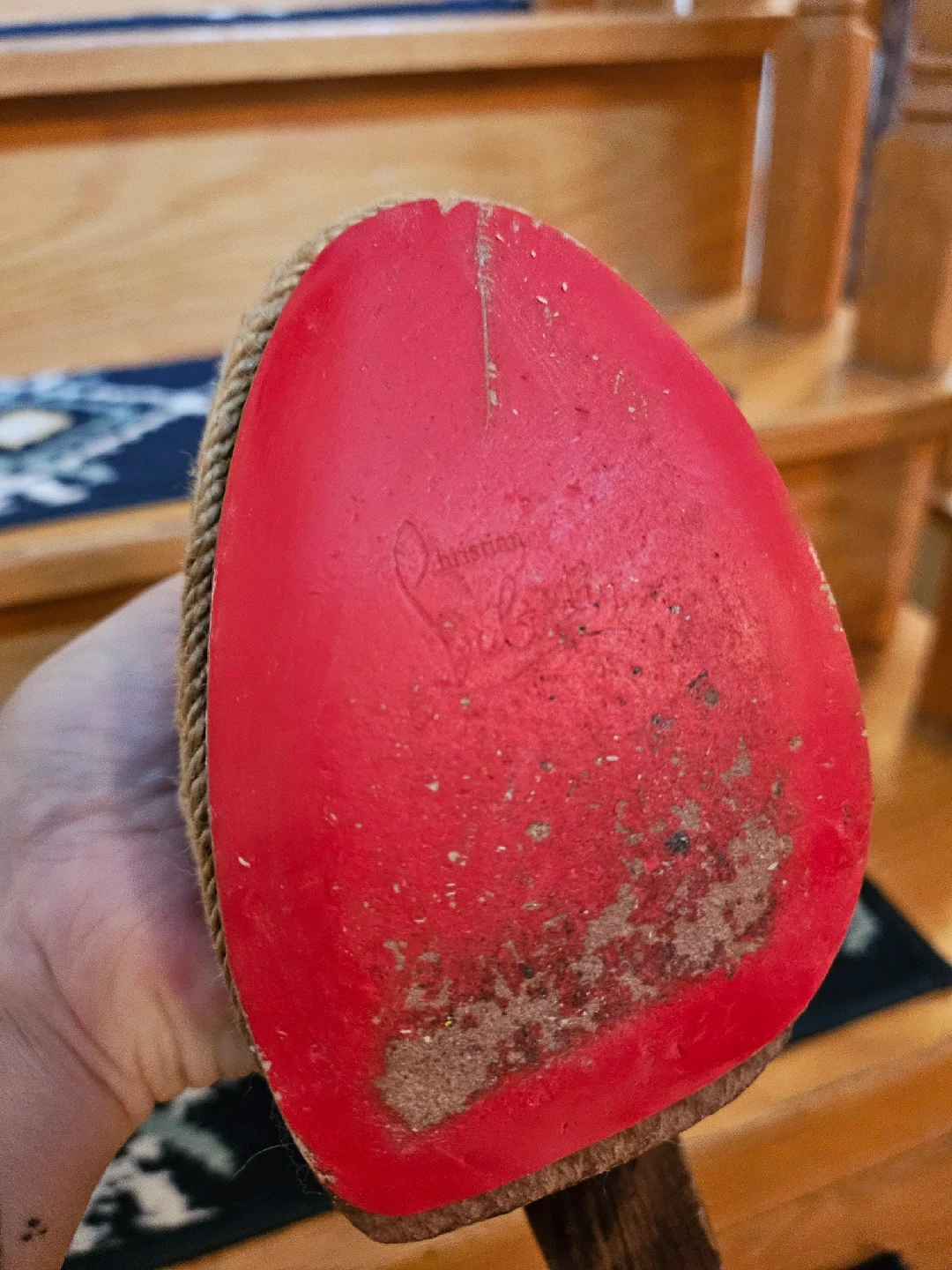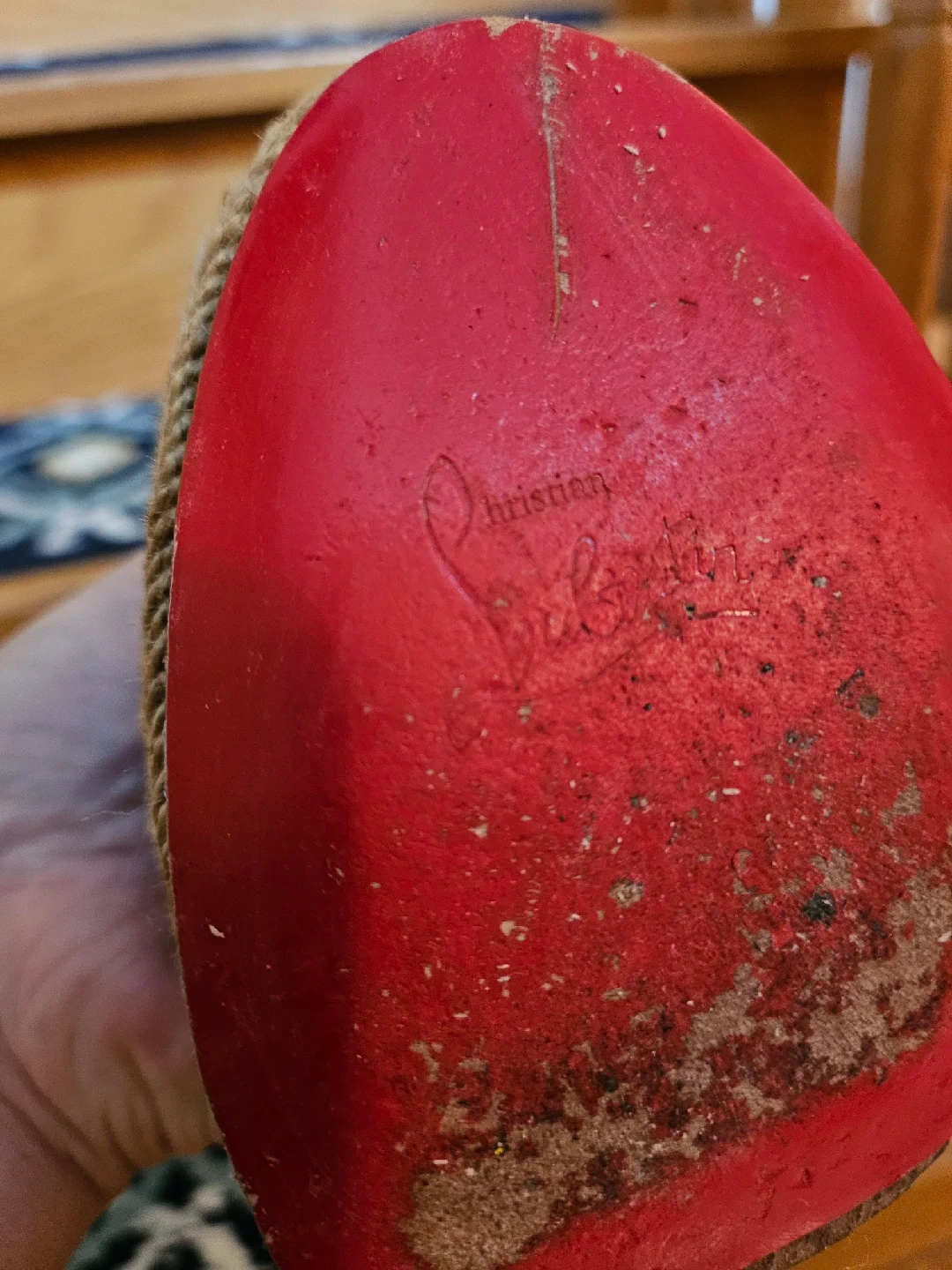 21Selling a pair of Christian Louboutin espadrilles sandals. They show some signs of wear on the red soles, but the uppers are still in good shape. Please see the photos for details!
