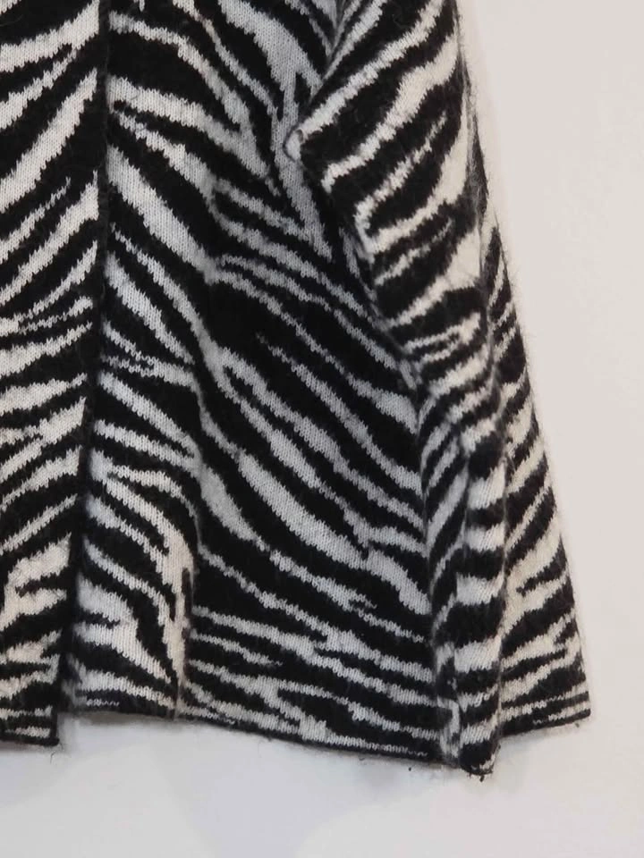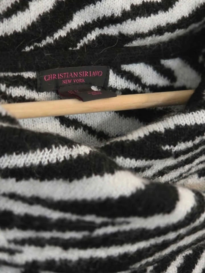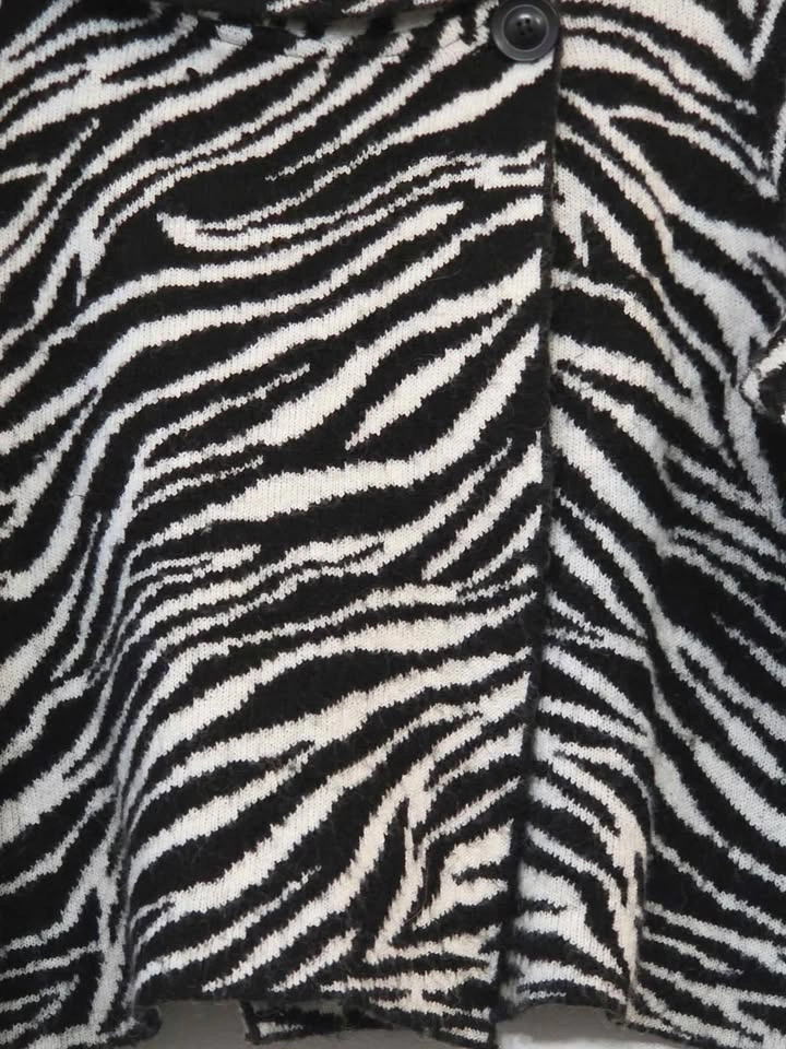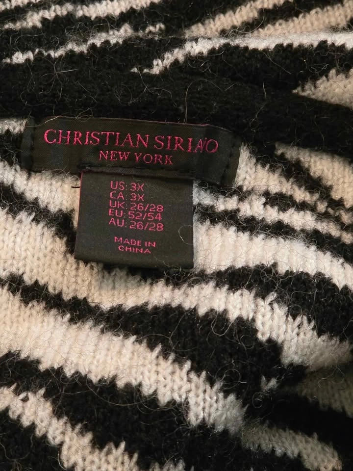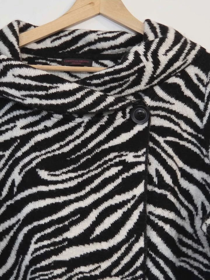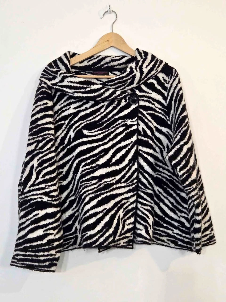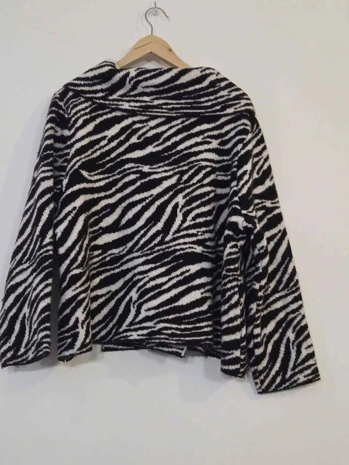 15Stylish and soft Christian Siriano New York cardigan in a bold black and white zebra print. Features a fashionable French Draped Cowl Neck with a single asymmetrical button closure. Perfect as a jacket replacement or cozy layering piece. Size: Women's Plus Size 3X (US 3X, UK 26/28) Brand: Christian Siriano New York Style: French Draped Cowl Neck Cardigan/Sweater Coat Colour: Black and White Zebra Print Fabric: Soft, cozy knit. Condition: Good Pre-Owned Condition. Very clean with no holes or stains. There is some minor pilling consistent with normal wear on a knit garment, which can be easily cleaned up with a fabric shaver or gentle razor. Very soft and cozy! The plus size 3X fit is comfortable and flattering. From a Non-Smoking Home with Two Cats. Pickup Location: 4531 7 Ave SE, Calgary. Check out my other listings for clothing, home decor, and other unique vintage pieces.