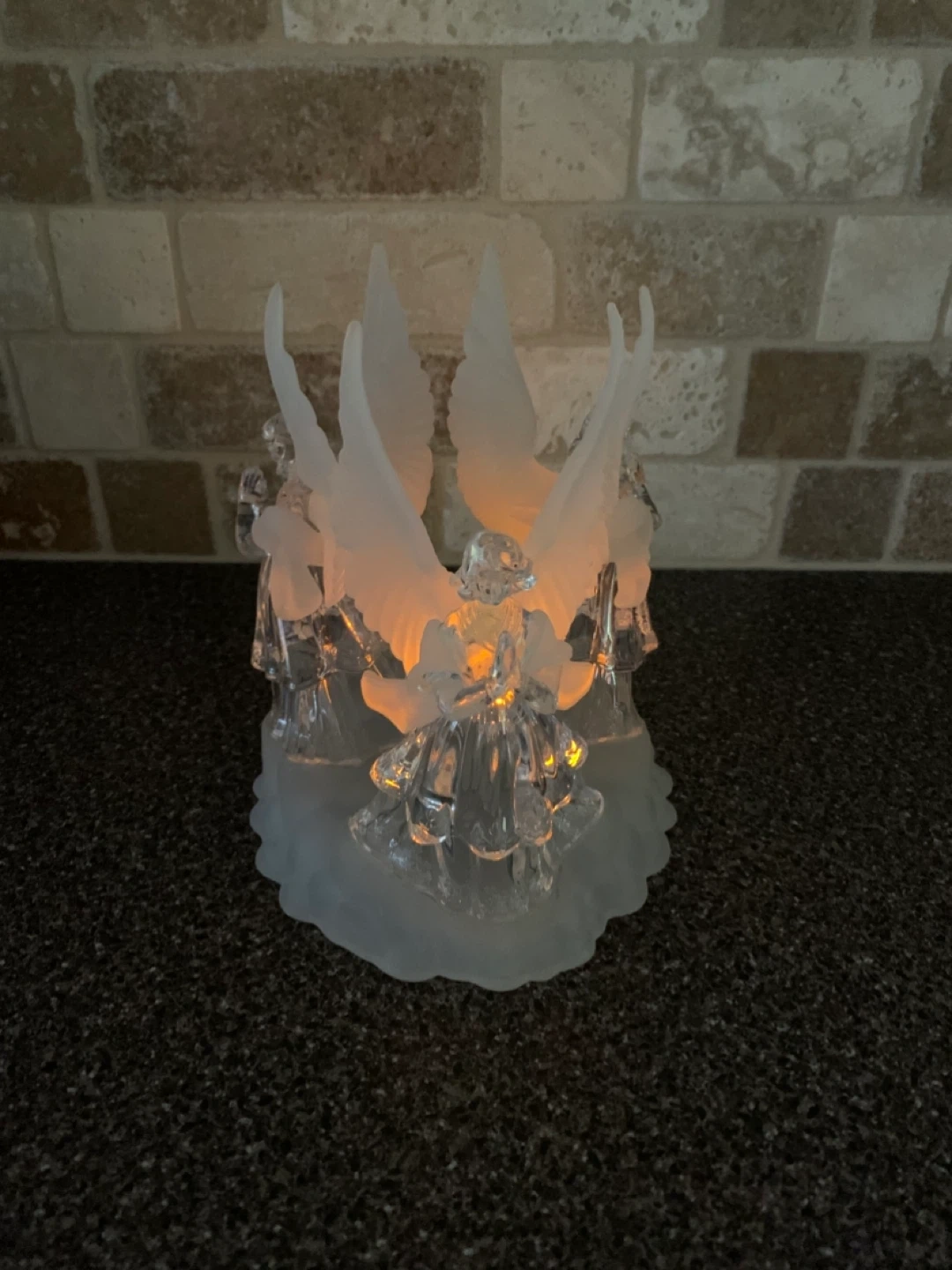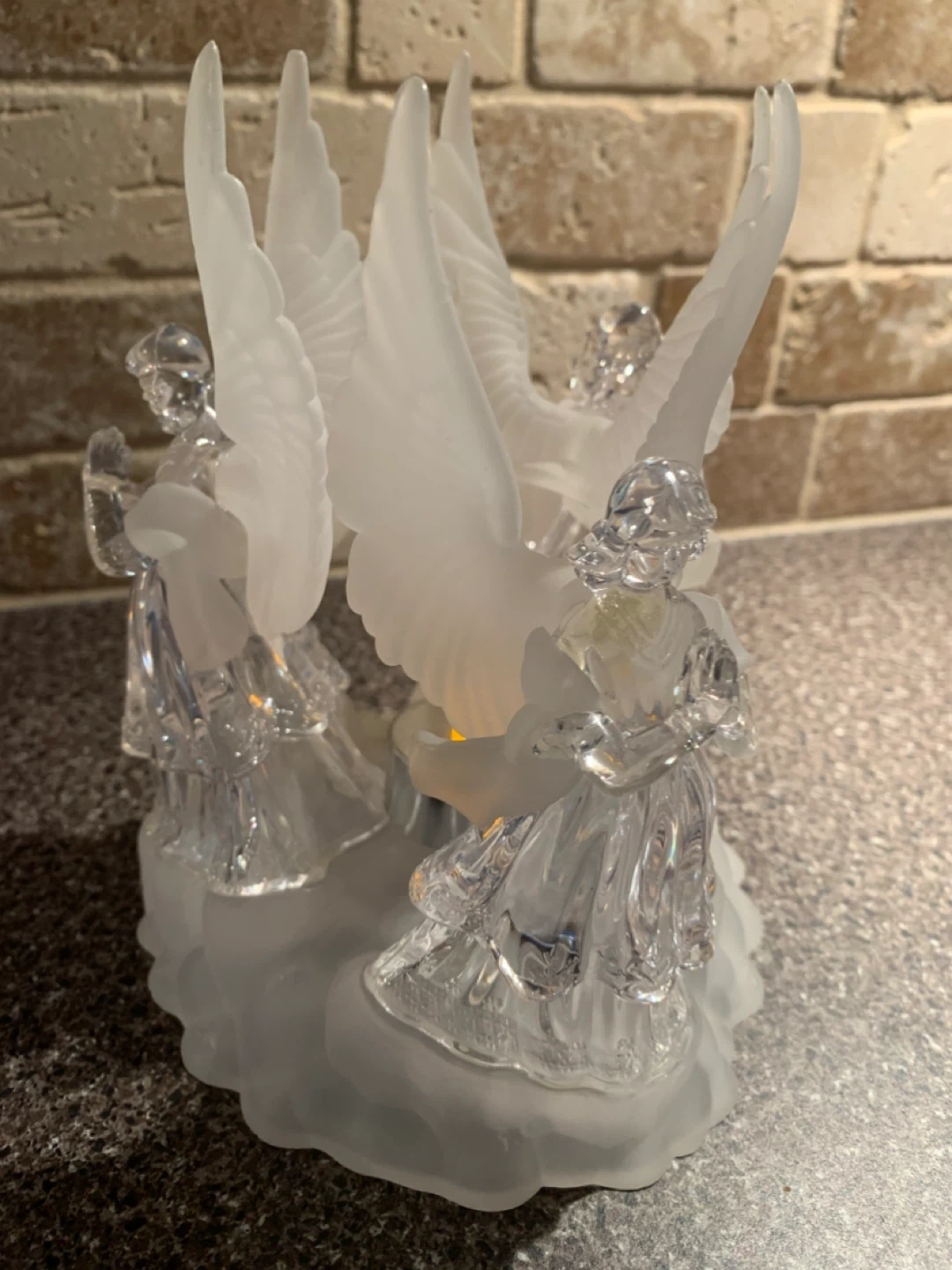 This is a beautiful acrylic angel figurine candle holder. It would look great as a centrepiece or decoration for your home. It is in great condition and ready to find a new home!