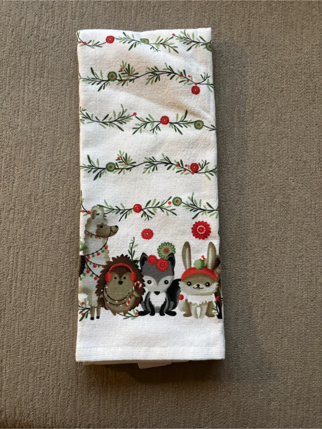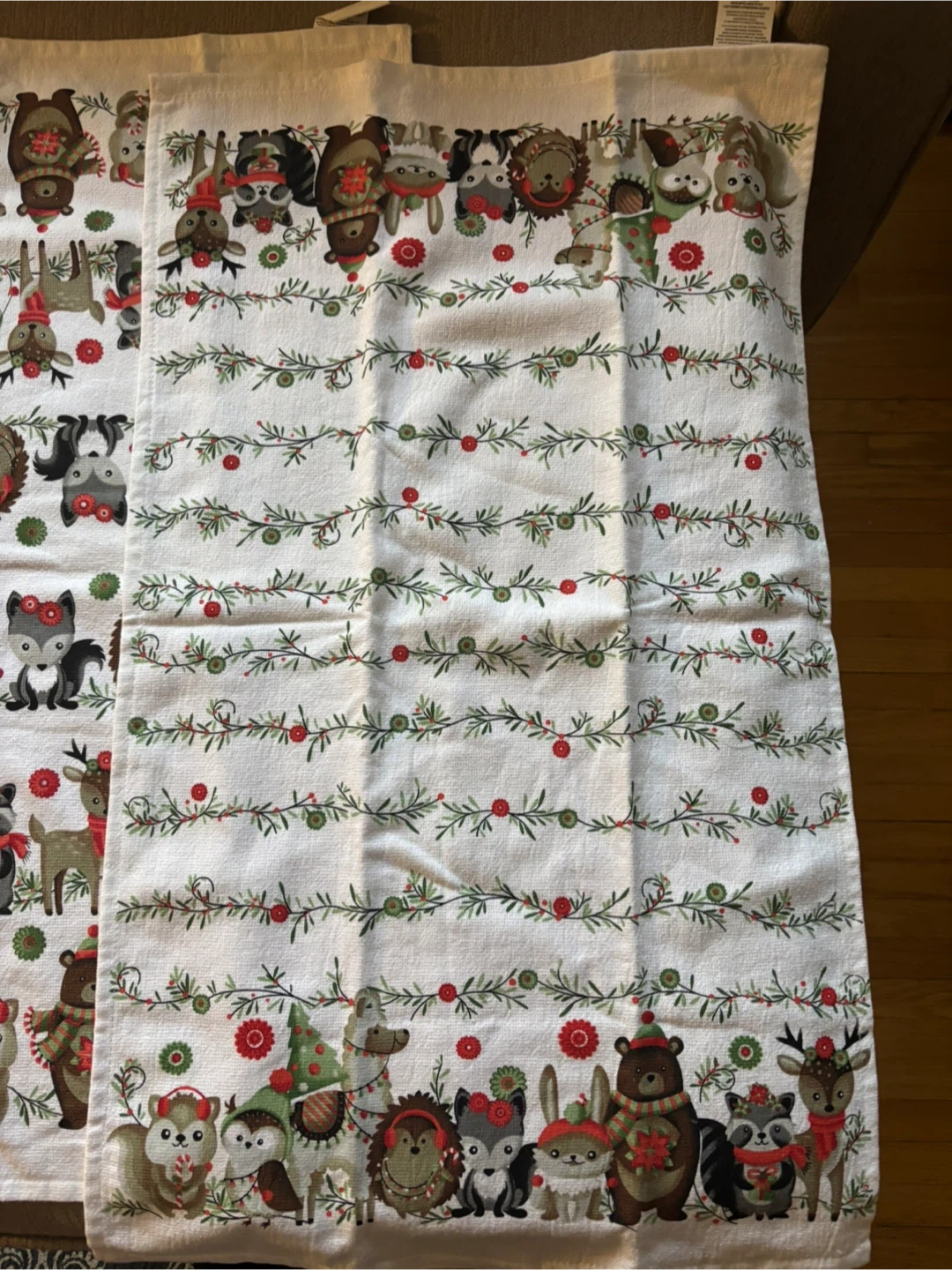 69Here's a set of two Christmas-themed kitchen towels! They feature a cute animal print design with festive greenery and red berries. Perfect for adding a touch of holiday cheer to your kitchen. Cash only.