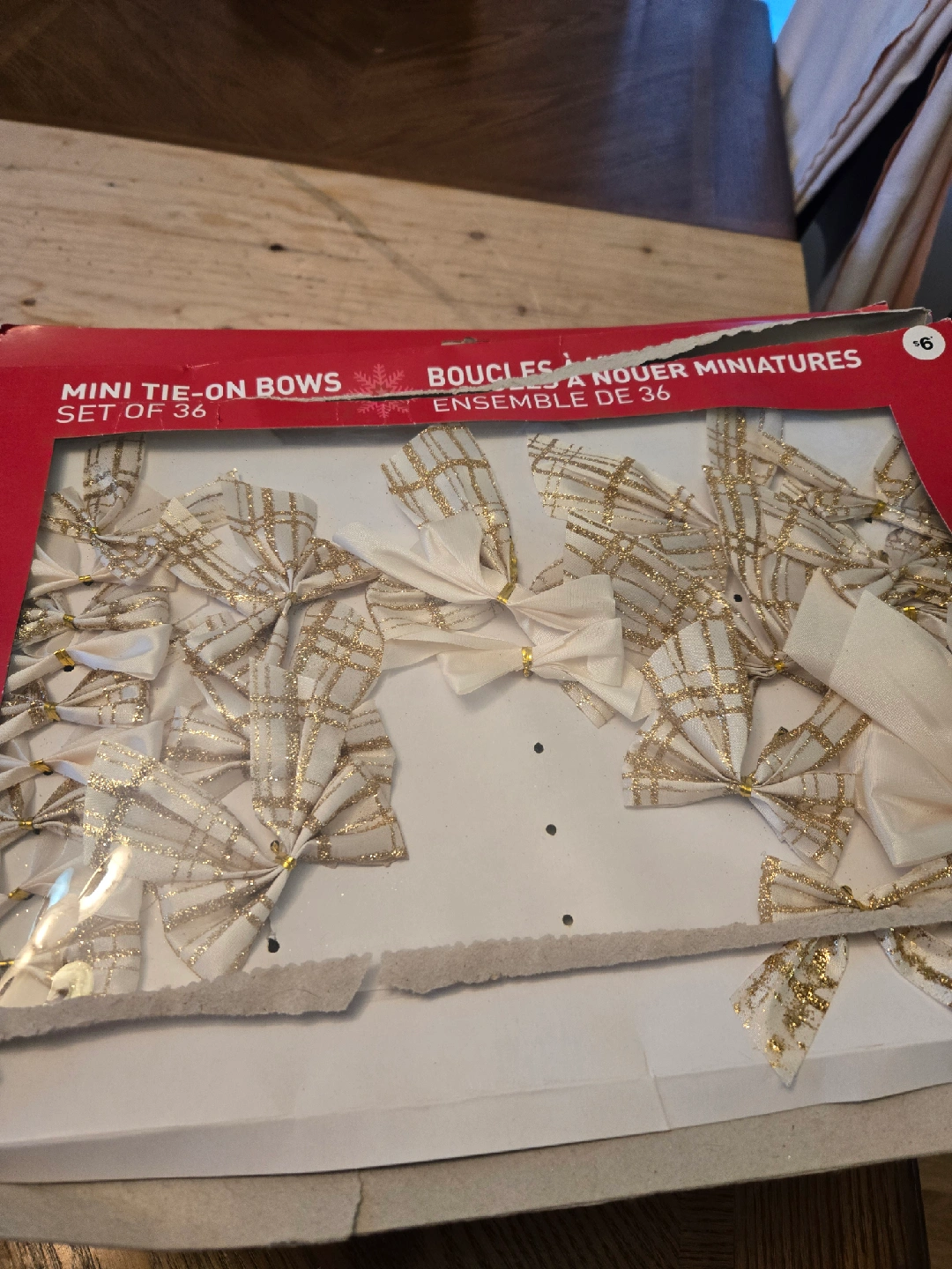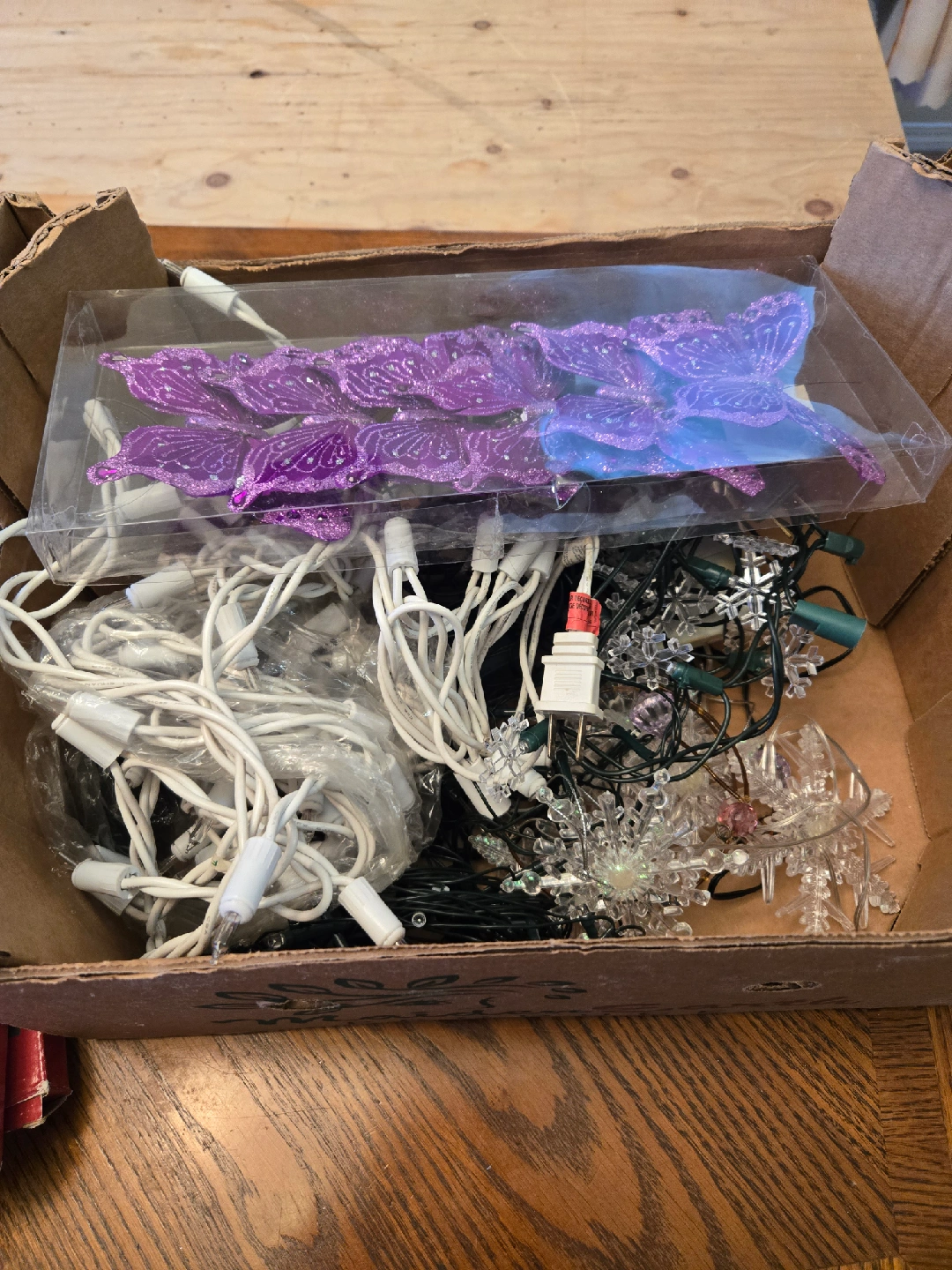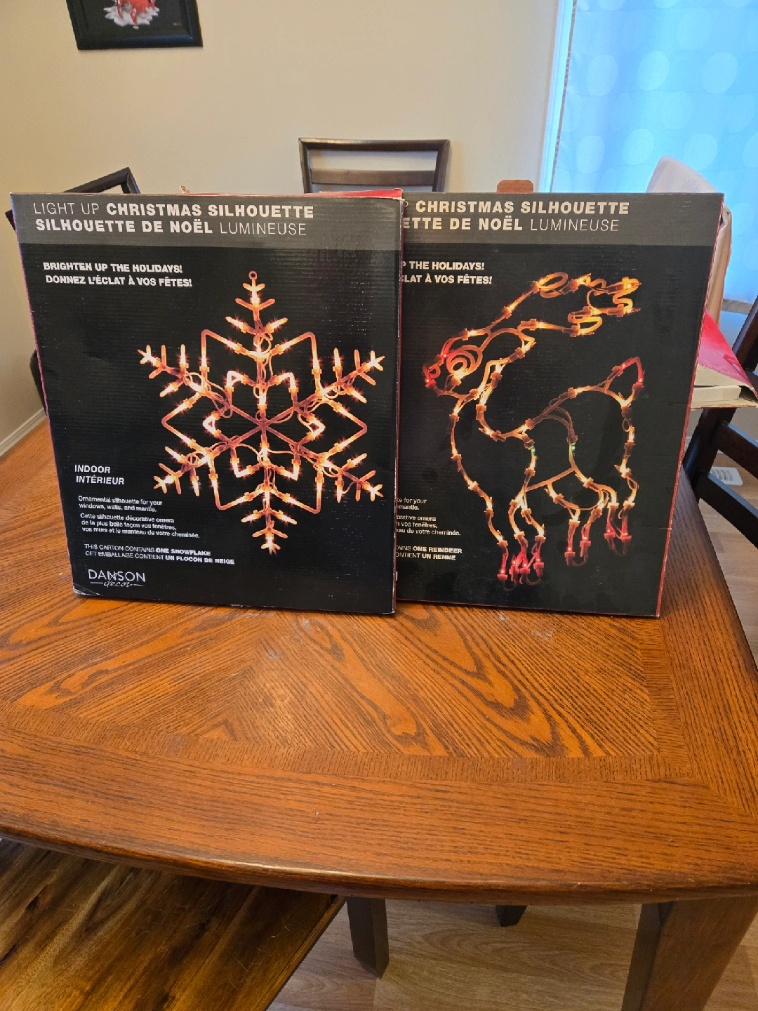 10Selling a collection of Christmas decorations! Includes mini tie-on bows (set of 36), light-up Christmas silhouettes (snowflake and reindeer), and various Christmas lights. Perfect for getting your home festive for the holidays
