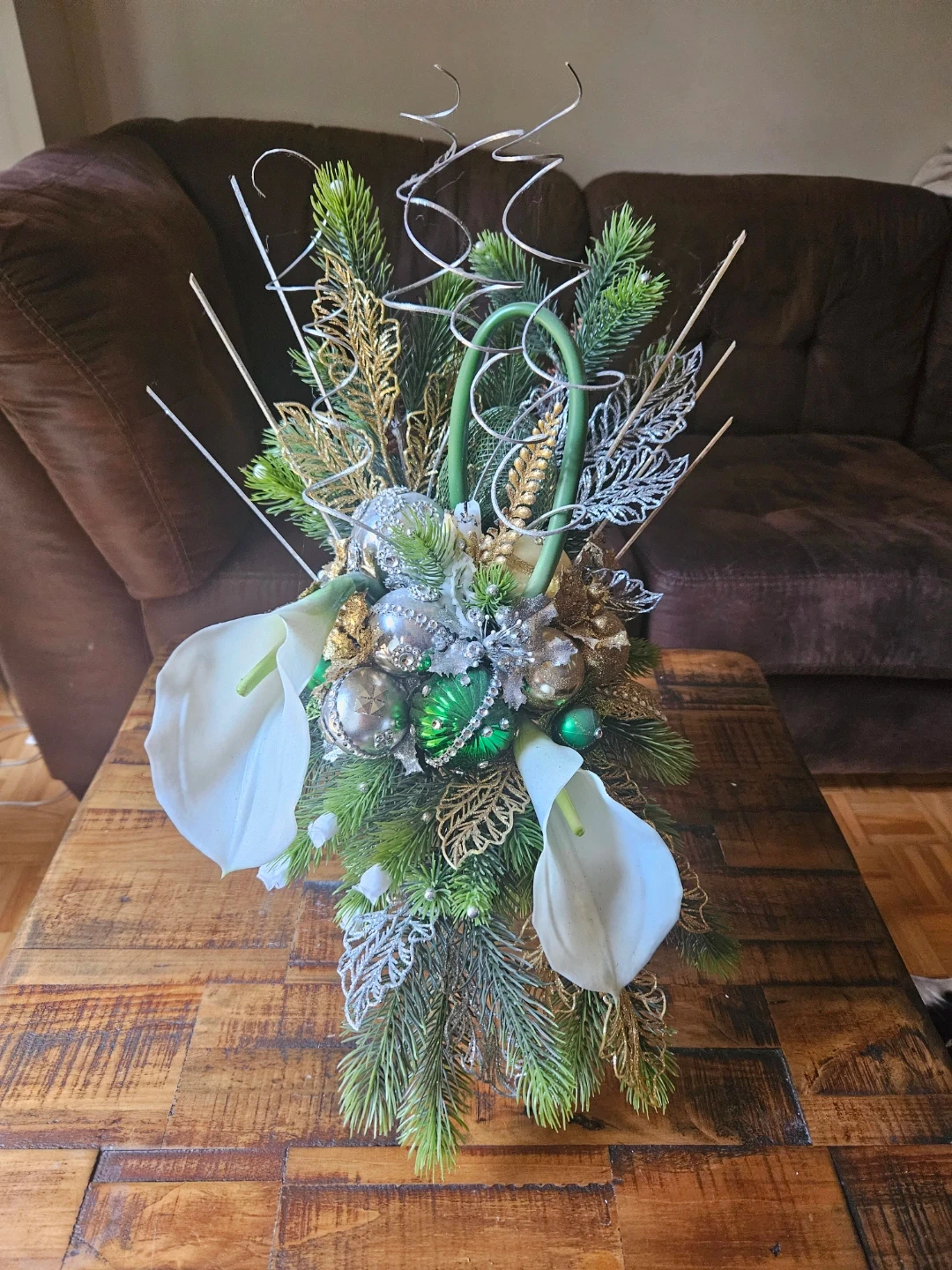 10Selling a lovely Christmas floral arrangement! It features white calla lilies, festive green and silver ornaments, and decorative gold accents. Perfect for adding a touch of holiday cheer to your home
