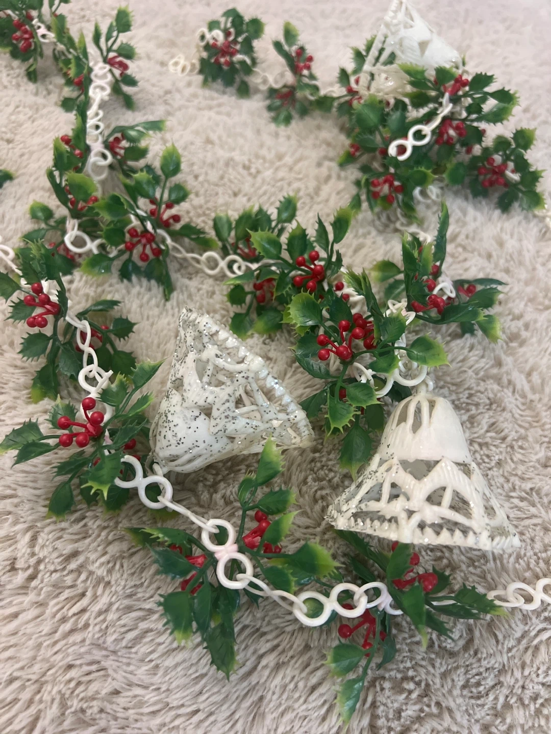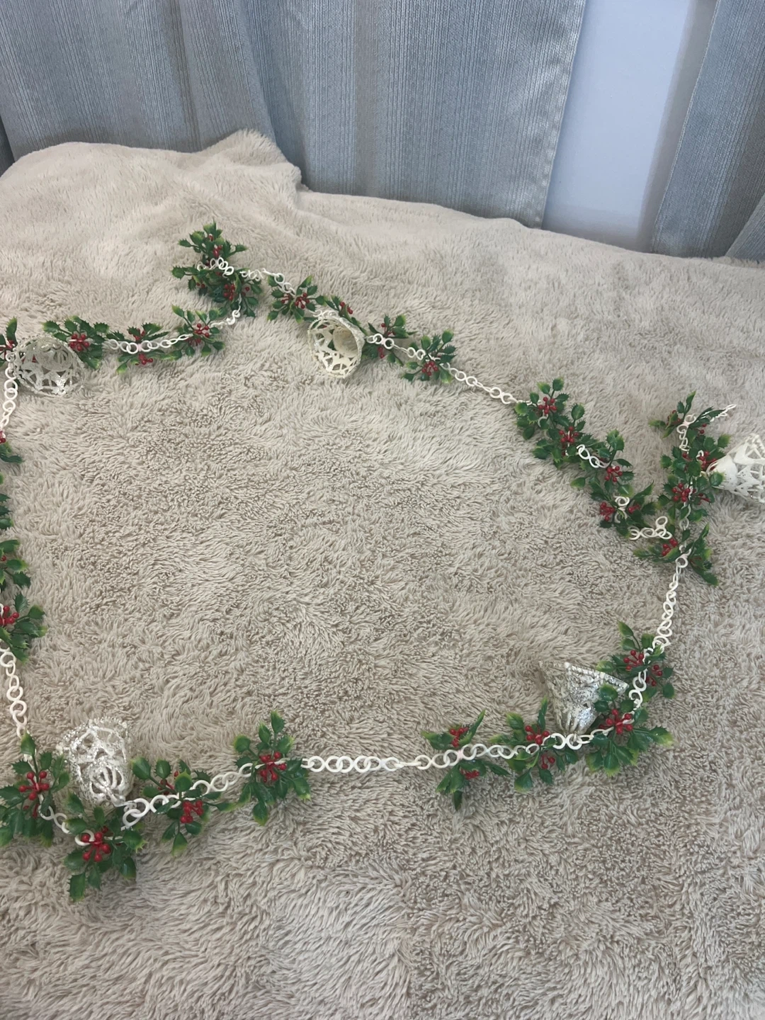 27Festive Christmas garland featuring holly leaves, red berries, and decorative bells. Perfect for adding a touch of holiday cheer to your home!