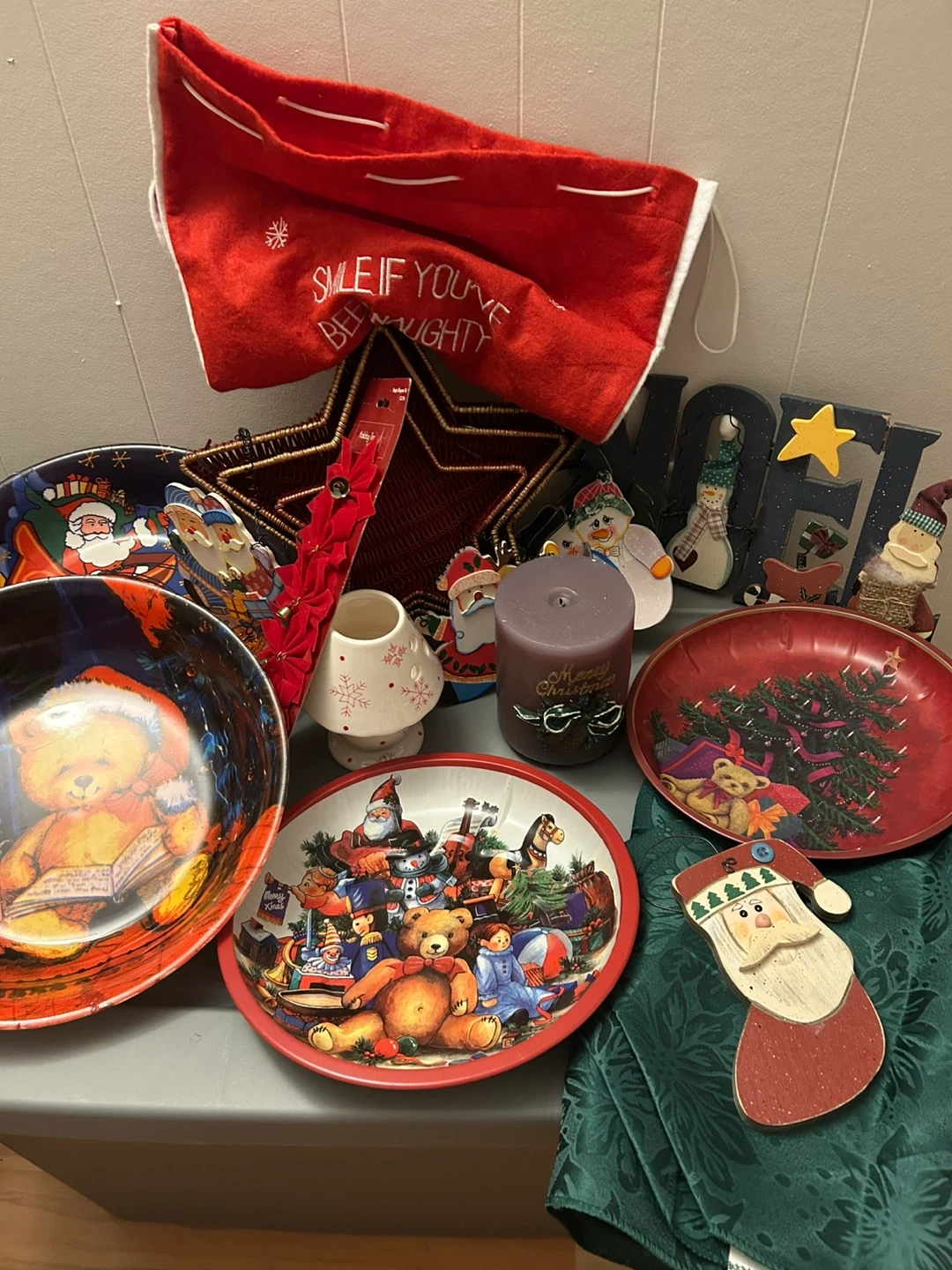 A collection of festive Christmas and holiday decor items! Includes decorative plates with teddy bear and Santa designs, a red felt bag with 'Smile if you've been naughty' text, a star-shaped basket, wooden ornaments, and more! Perfect for adding some holiday cheer to your home
