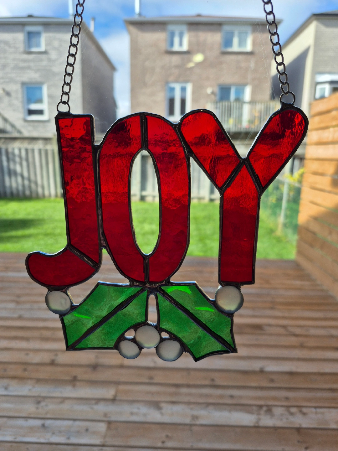 29Handmade stained glass JOY suncatcher. Christmas red with green leaves and frosted white berries. Approx size 6.26 by 7 inches. has chain attached and hangs at 15 inches. Pick up is in Pickering, cash sale only