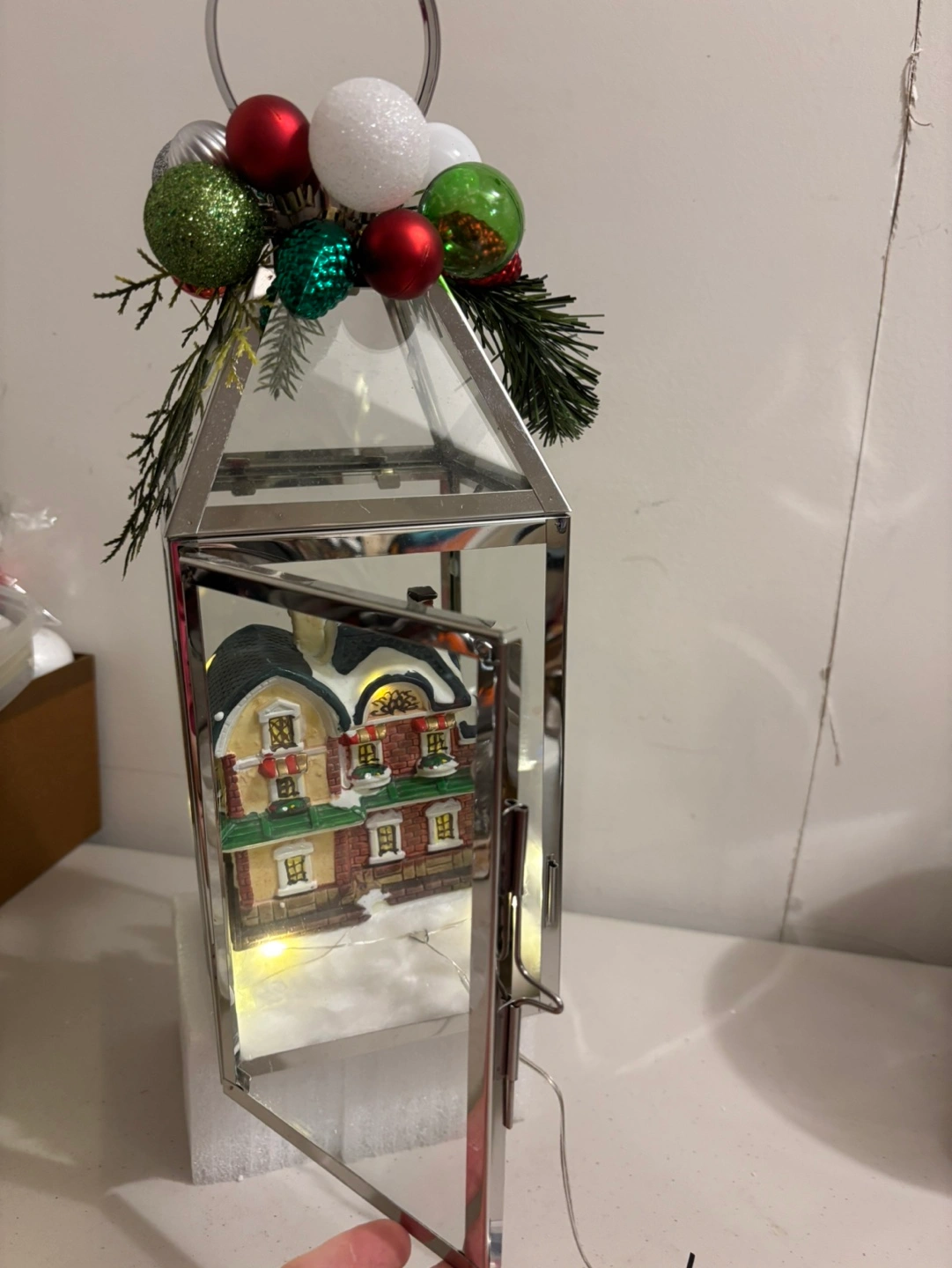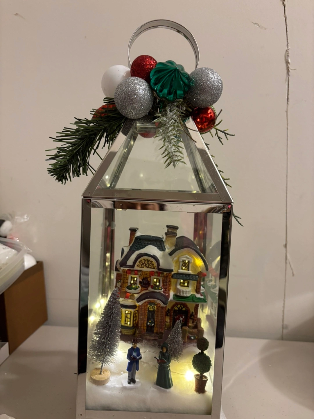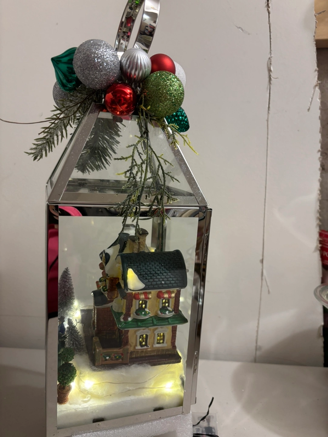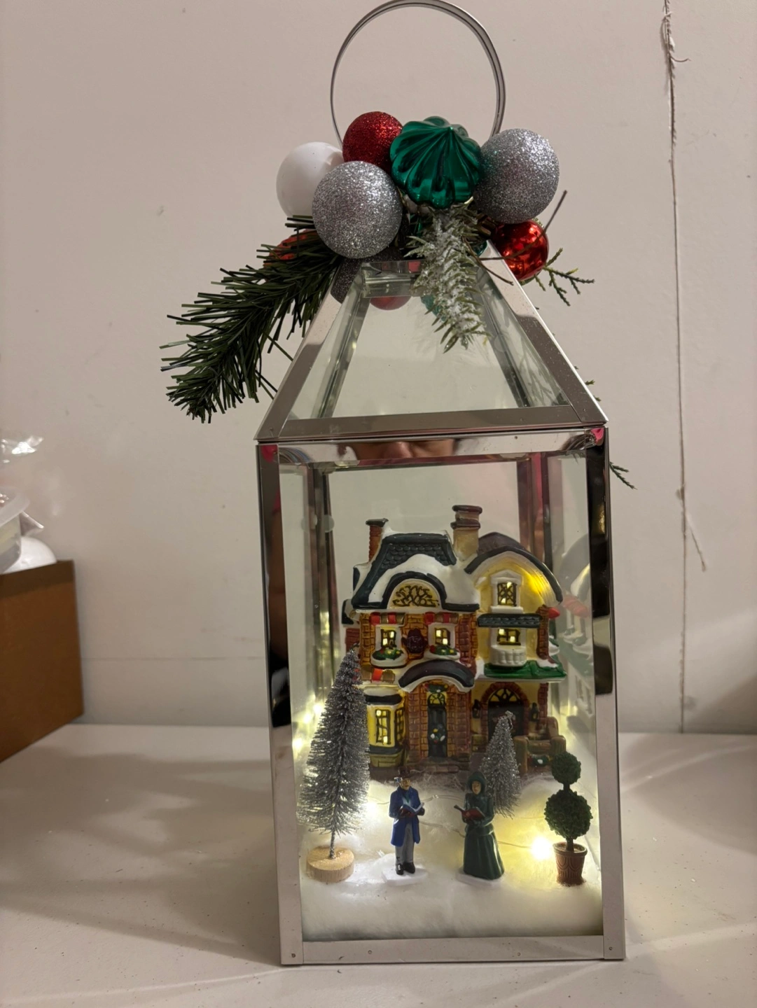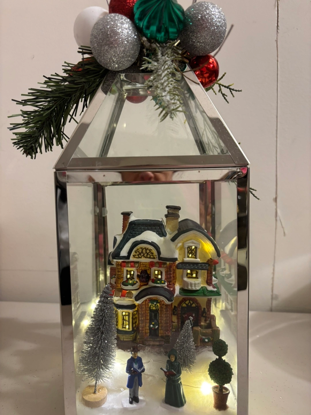 Square Silver lantern with glass panels and a small light up village scene inside. It has a handle and is decorated with greenery and ornaments. Price firm, cash only at time of pickup, pickup in Mississauga