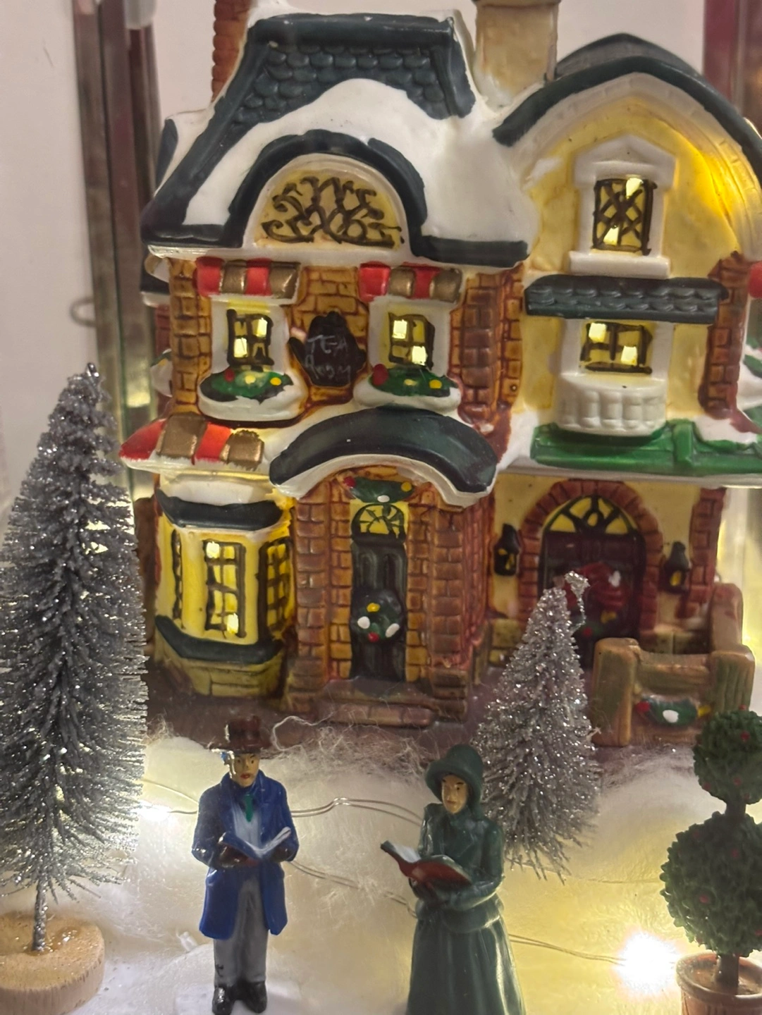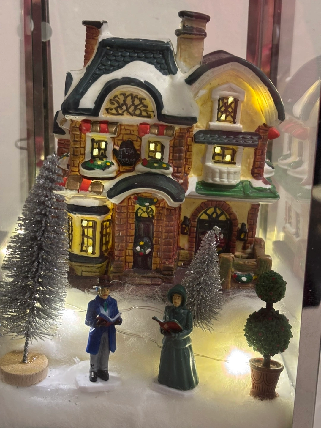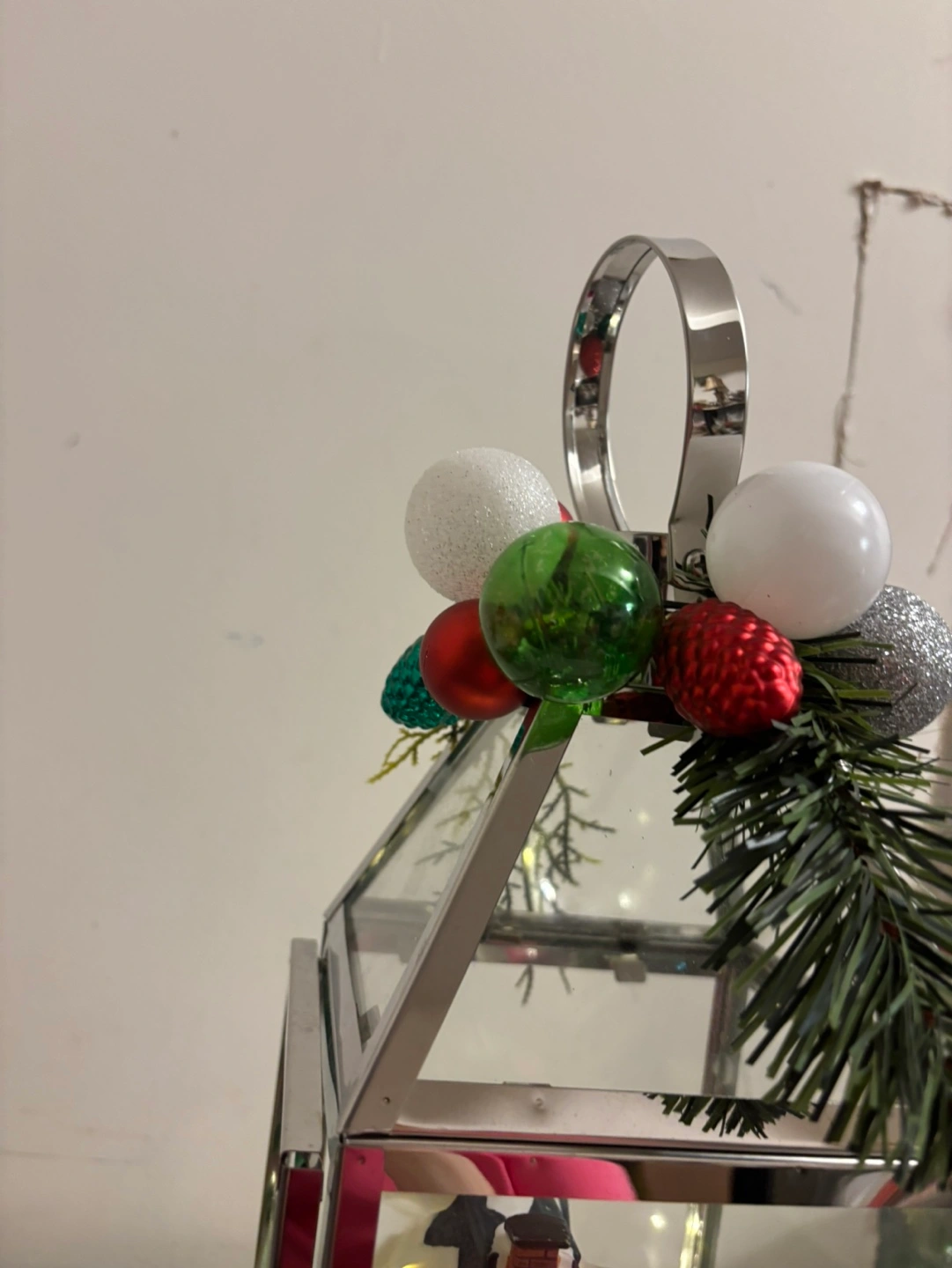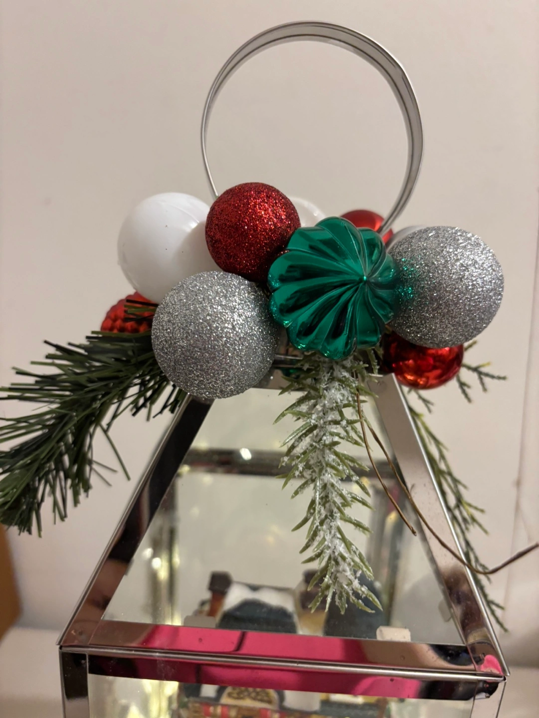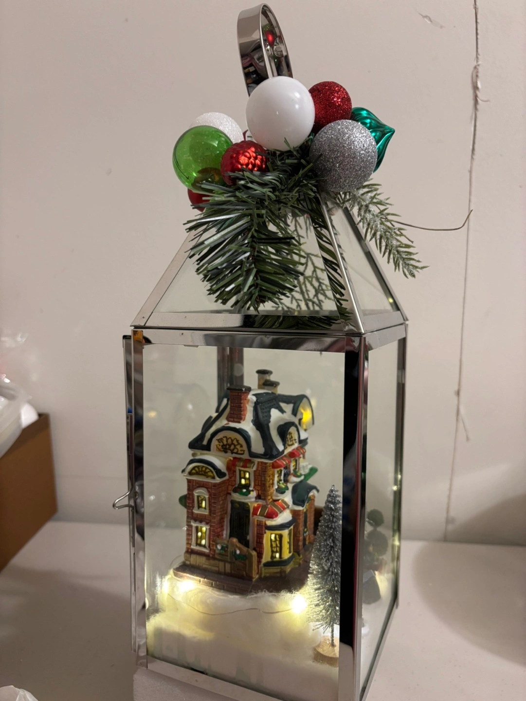 Square Silver lantern with glass panels and a small light up village scene inside. It has a handle and is decorated with greenery and ornaments. Price firm, cash only at time of pickup, pickup in Mississauga