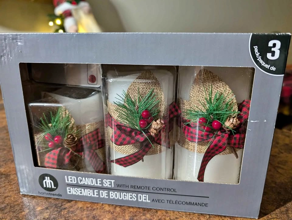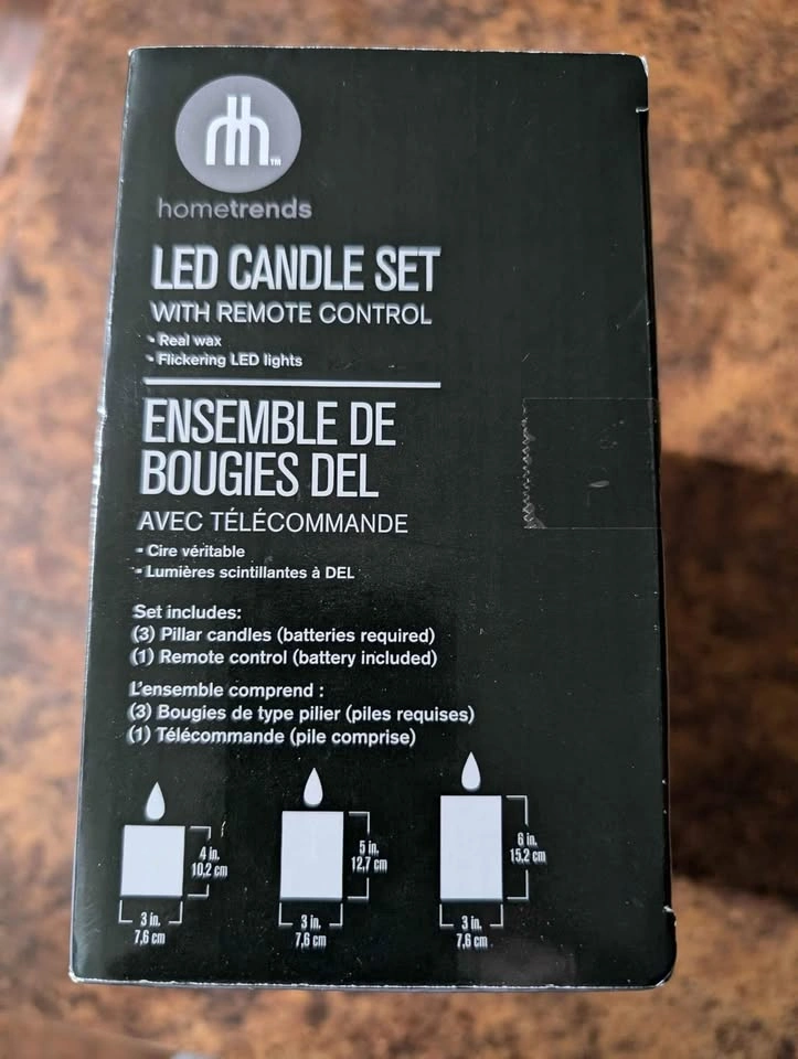 3 pillar candles and remote control. Battery operated. Batteries not included.