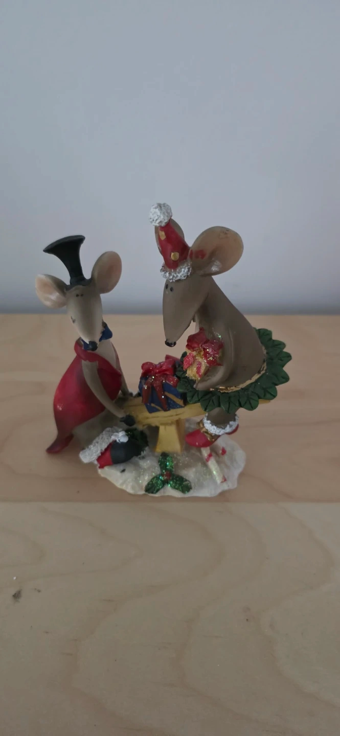 84A cute Christmas figurine featuring two mice decorating presents! It's perfect for adding a festive touch to your home this holiday season
