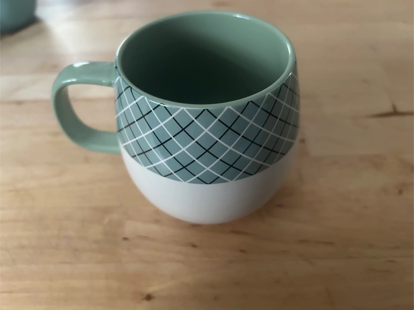 Selling a cute mug with a green handle and a white base. It has a nice pattern on the top half. It's also dishwasher and microwave safe, so it's super convenient for everyday use