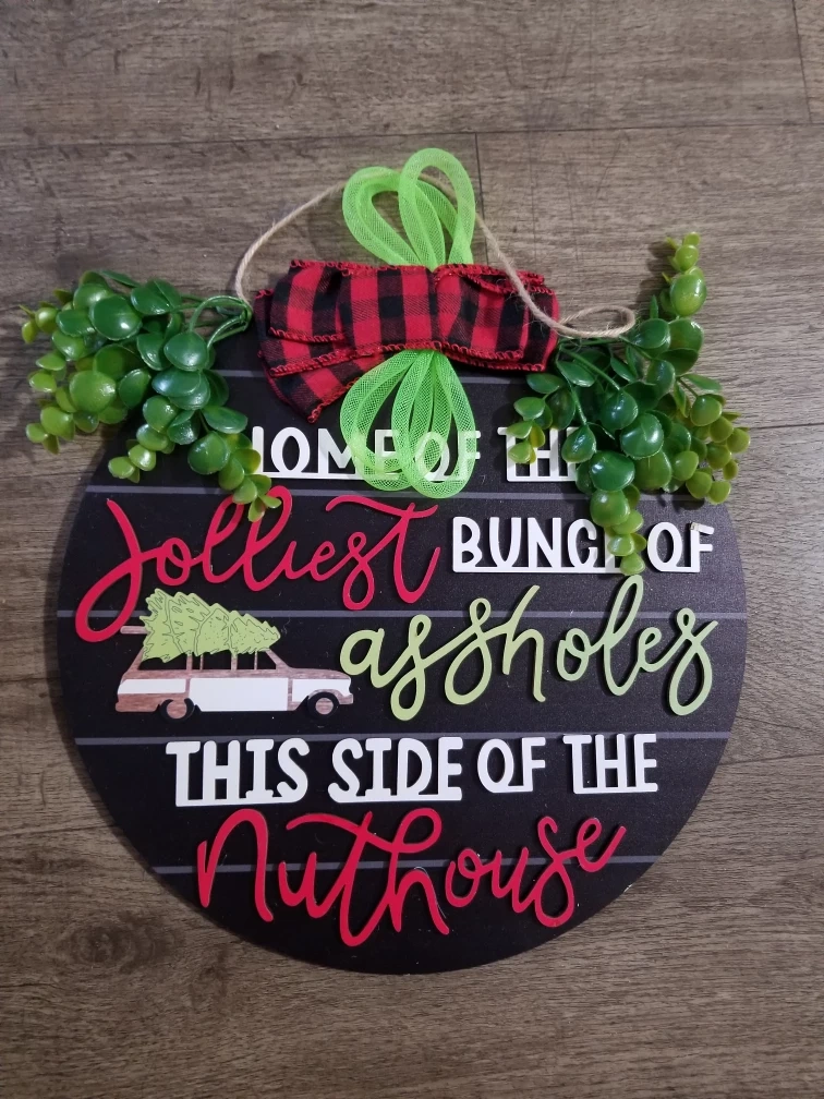 240This is a Christmas ornament shaped door hanger with the text "Home of the Jolliest Bunch of A**holes This Side of the Nuthouse". It has a red and black plaid ribbon and some greenery attached to the top. Brand new 12x12