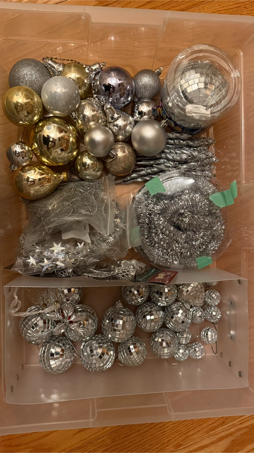 86Selling a variety of Christmas ornaments in silver and gold tones! There are baubles, disco balls, and tinsel garlands, perfect for adding some sparkle to your tree this holiday season