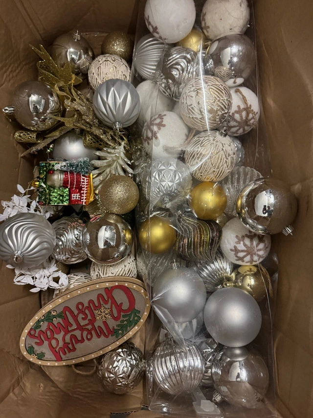 26Beautiful assorted Christmas ornaments in elegant gold, silver, and white tones — perfect for decorating your tree or holiday displays. Details: • Mixed set of over 40+ ornaments • Variety of finishes: shiny, matte, glitter, and textured • Includes baubles, snowflakes, and decorative pieces • Comes with a “Merry Christmas” sign and extra accent decor • Packed neatly in a box for easy pickup Condition: Used once, excellent condition. Ready to hang! Price: $20 for the full box Pickup: White Rock For Sale By: Owner