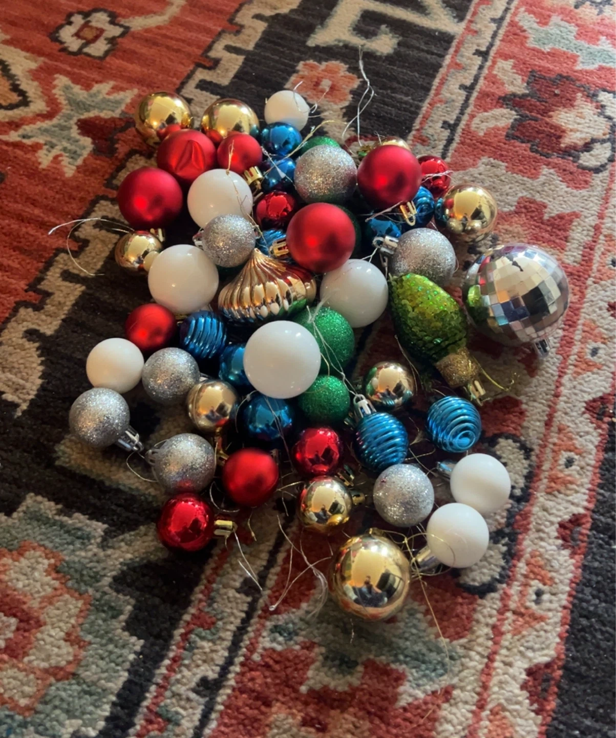 824Assorted Christmas ornaments in various colours and finishes! There are red, gold, blue, silver, and white ornaments in shiny, matte, and glittery finishes.