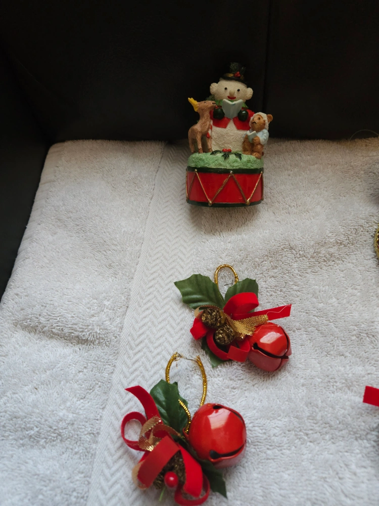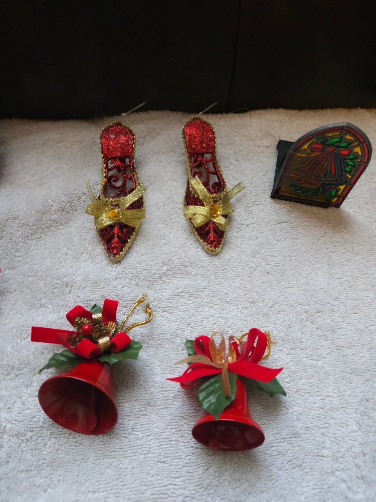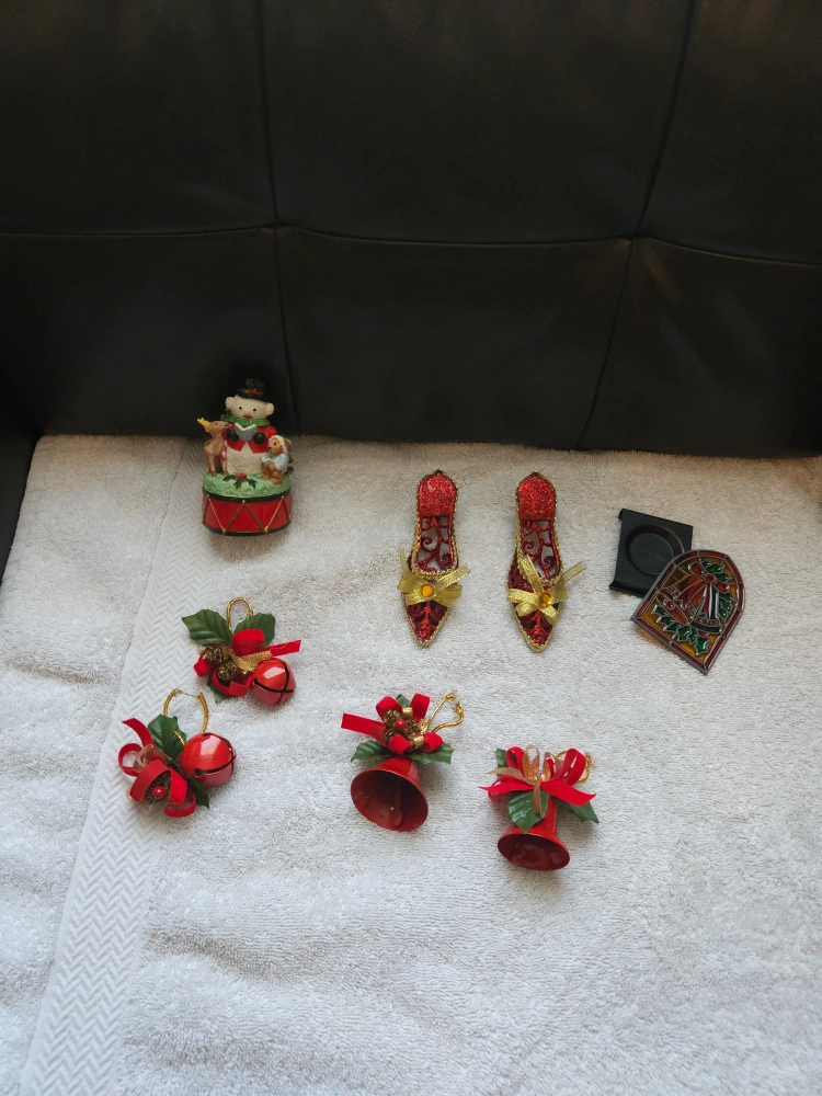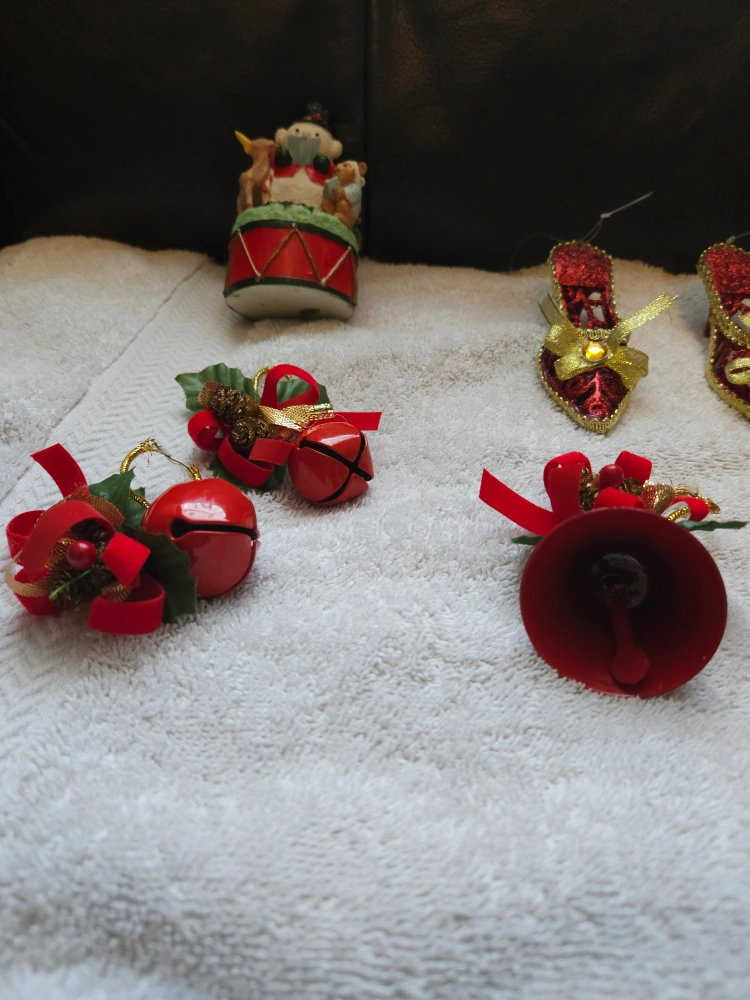 111A collection of festive Christmas ornaments to add some holiday cheer to your home! Includes a snowman on a drum, several red bell ornaments with bows, and a pair of decorative red shoes