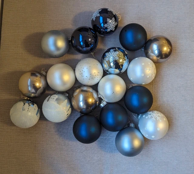 603Christmas Ornaments - Silver, Blue, White Selling a collection of Christmas ornaments! There are silver, blue, and black ornaments in various designs. Perfect for adding some sparkle to your tree this holiday season There are 18 ornaments total.