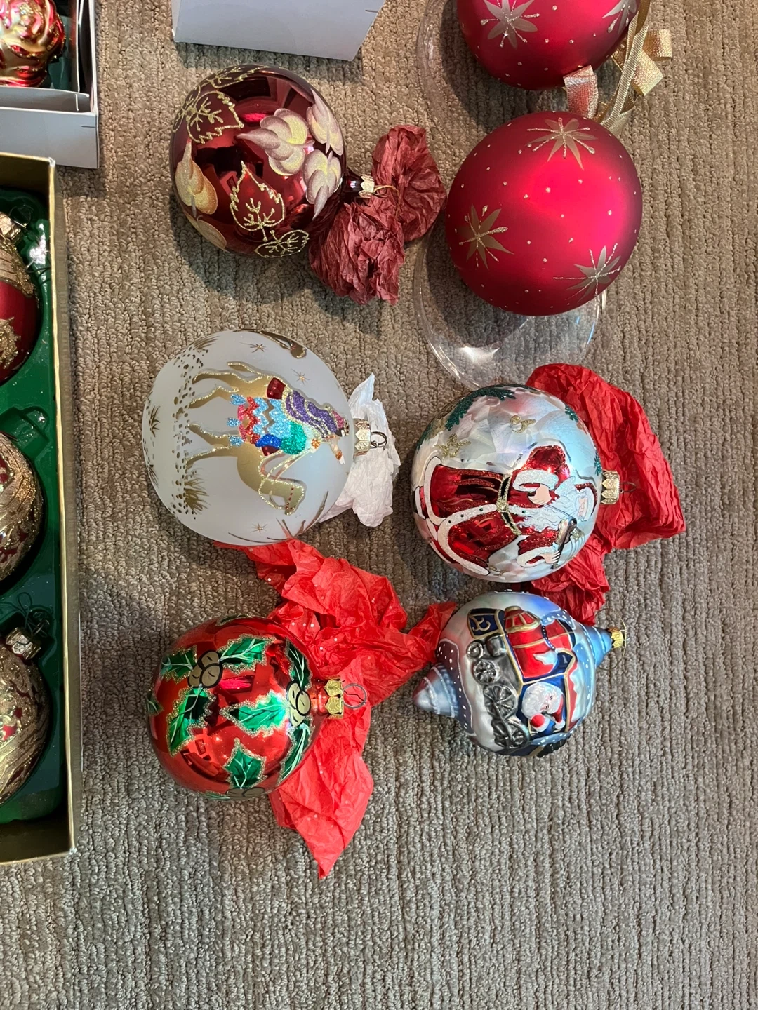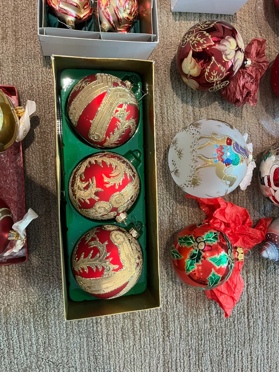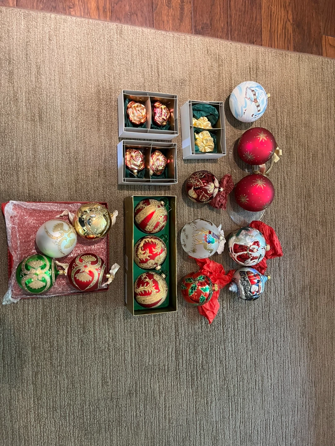 21 Christmas ornaments/ balls. Most are glass and about 15 are about 4 inches in height There are 6 smaller ones. Selling as a package. Good condition.