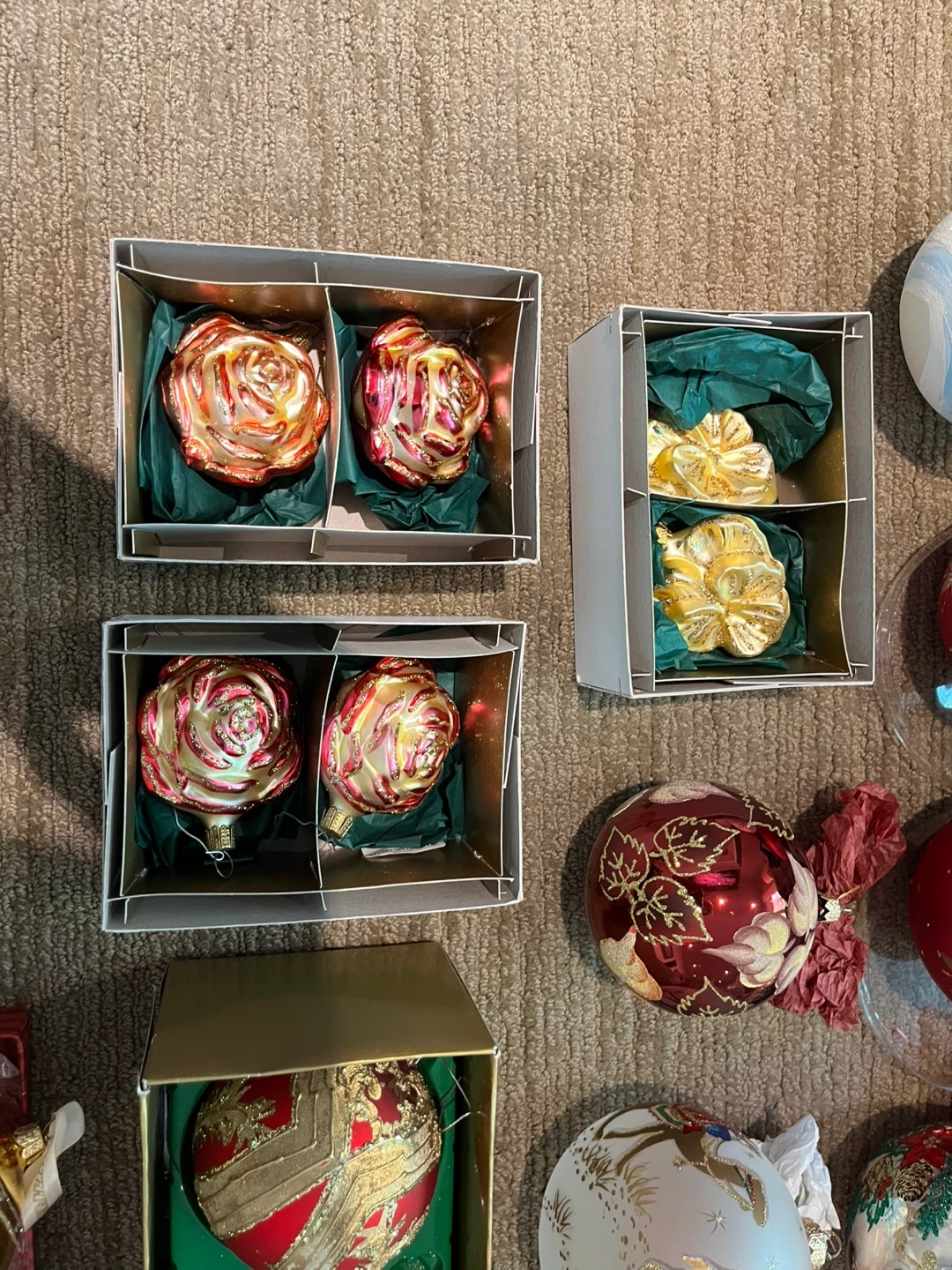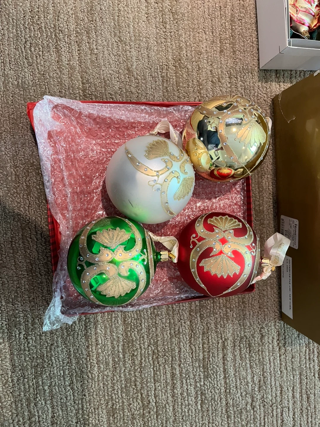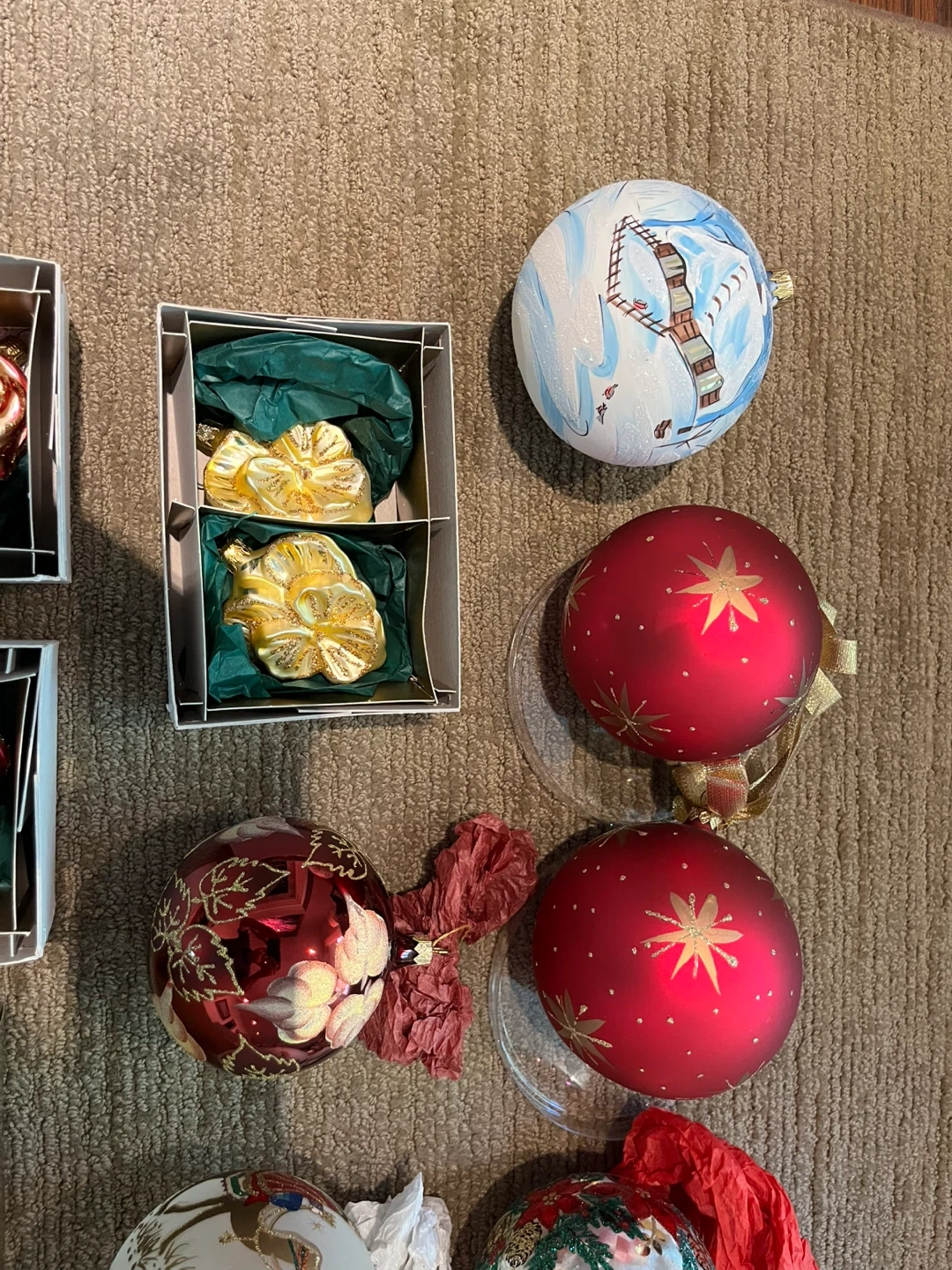 21 Christmas ornaments/ balls. Most are glass and about 15 are about 4 inches in height There are 6 smaller ones. Selling as a package. Good condition.