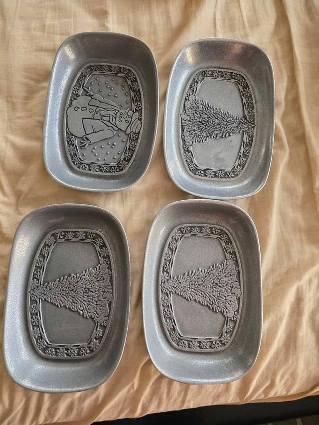 I'm offering a set of four Wilton Armetale handcrafted pewter plates, perfect for adding a touch of festive charm to your holiday gatherings. These plates feature a lovely Christmas tree and snow scene design, showcasing fine craftsmanship and attention to detail. These are previously owned and display minor signs of use, adding to their vintage appeal. * Material: Pewter * Design: Christmas tree and snow scene * Brand: Wilton Armetale * Quantity: Four plates. I'm sure these plates will bring joy to your festive table!