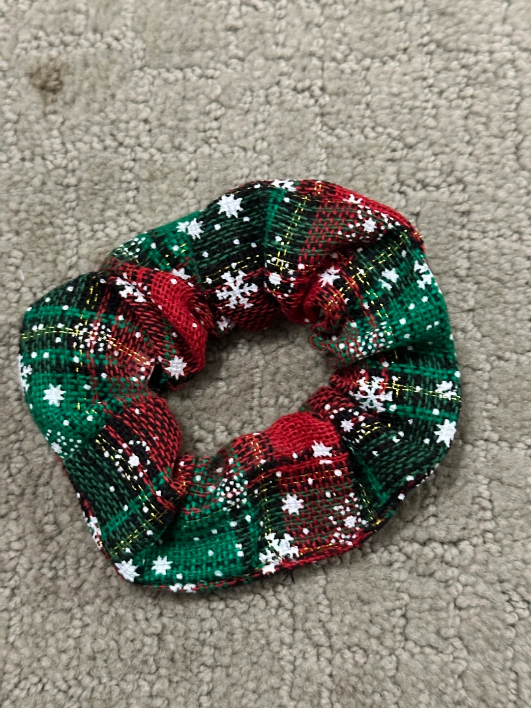1000+Red and green plaid scrunchie. Features snowflakes and gold accents. Festive hair accessory.