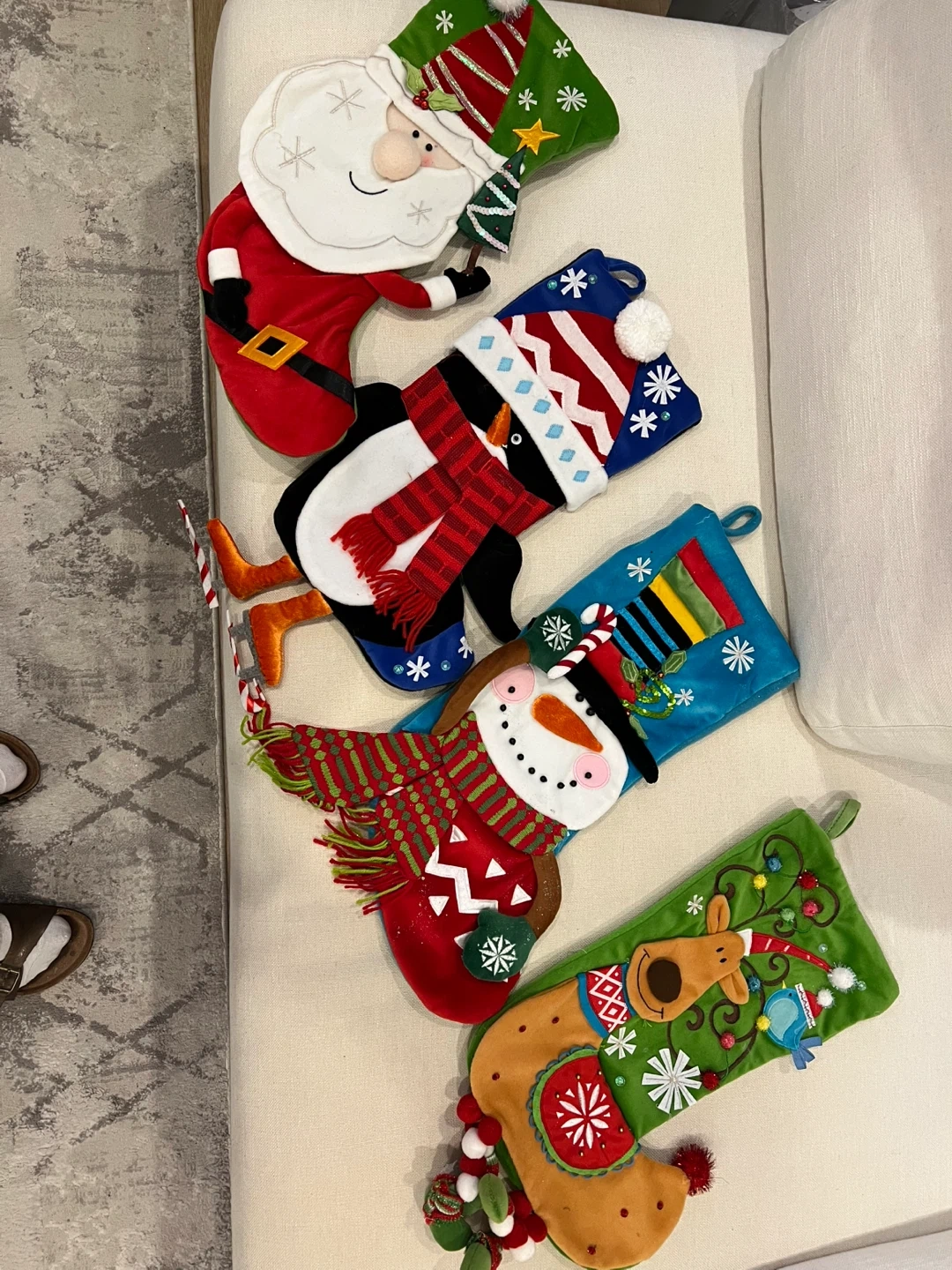10Get ready for the holidays with these adorable Christmas stockings! This set includes four unique designs: Santa, a penguin, a snowman, and a reindeer. Perfect for adding a festive touch to your home!