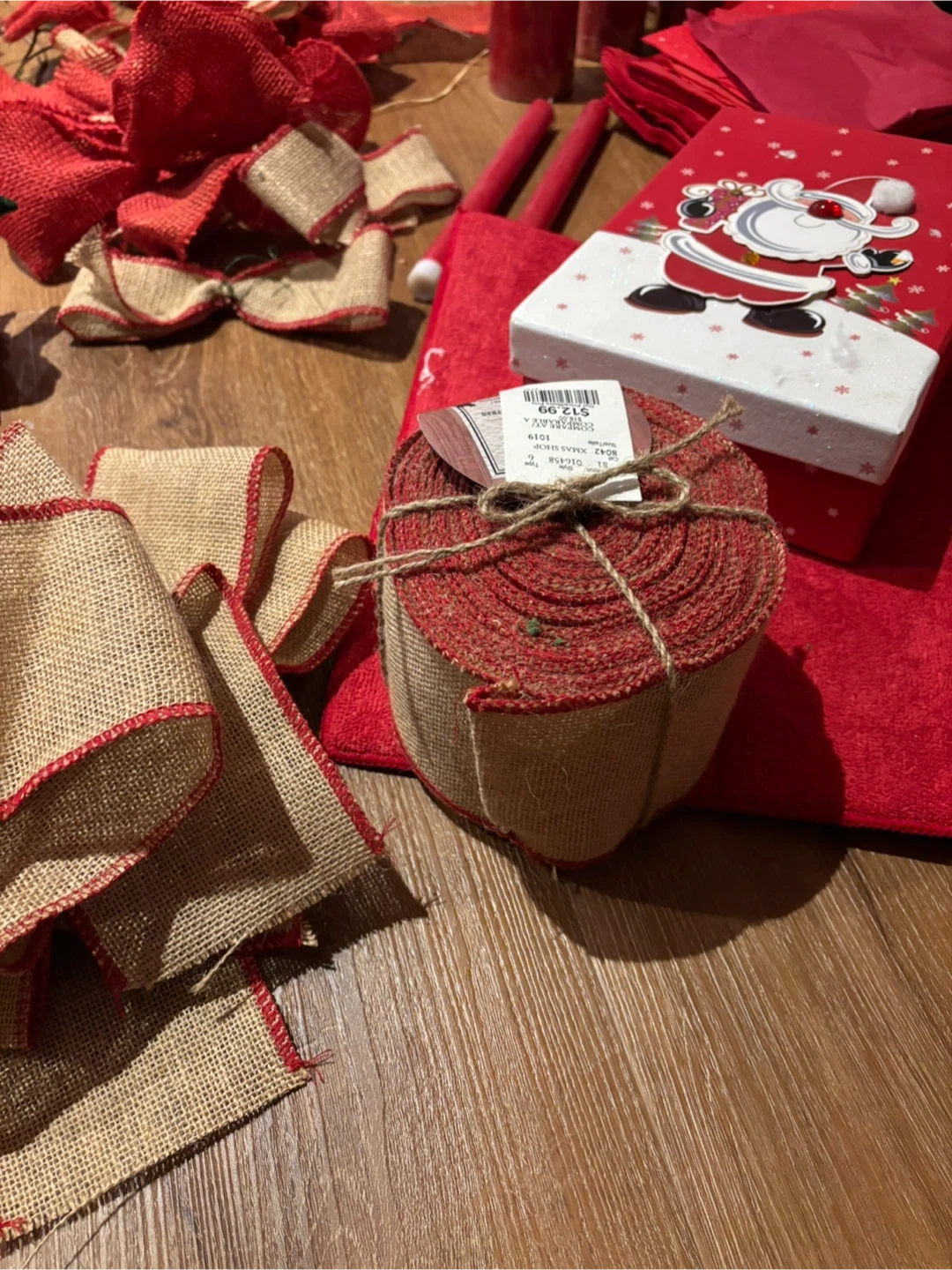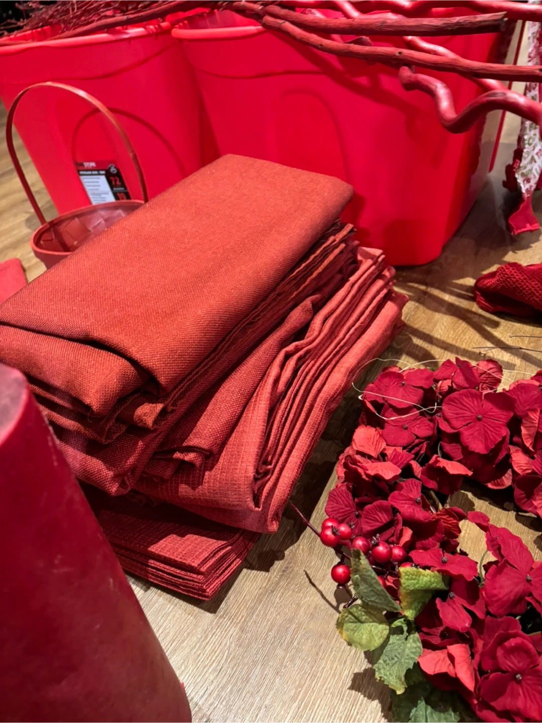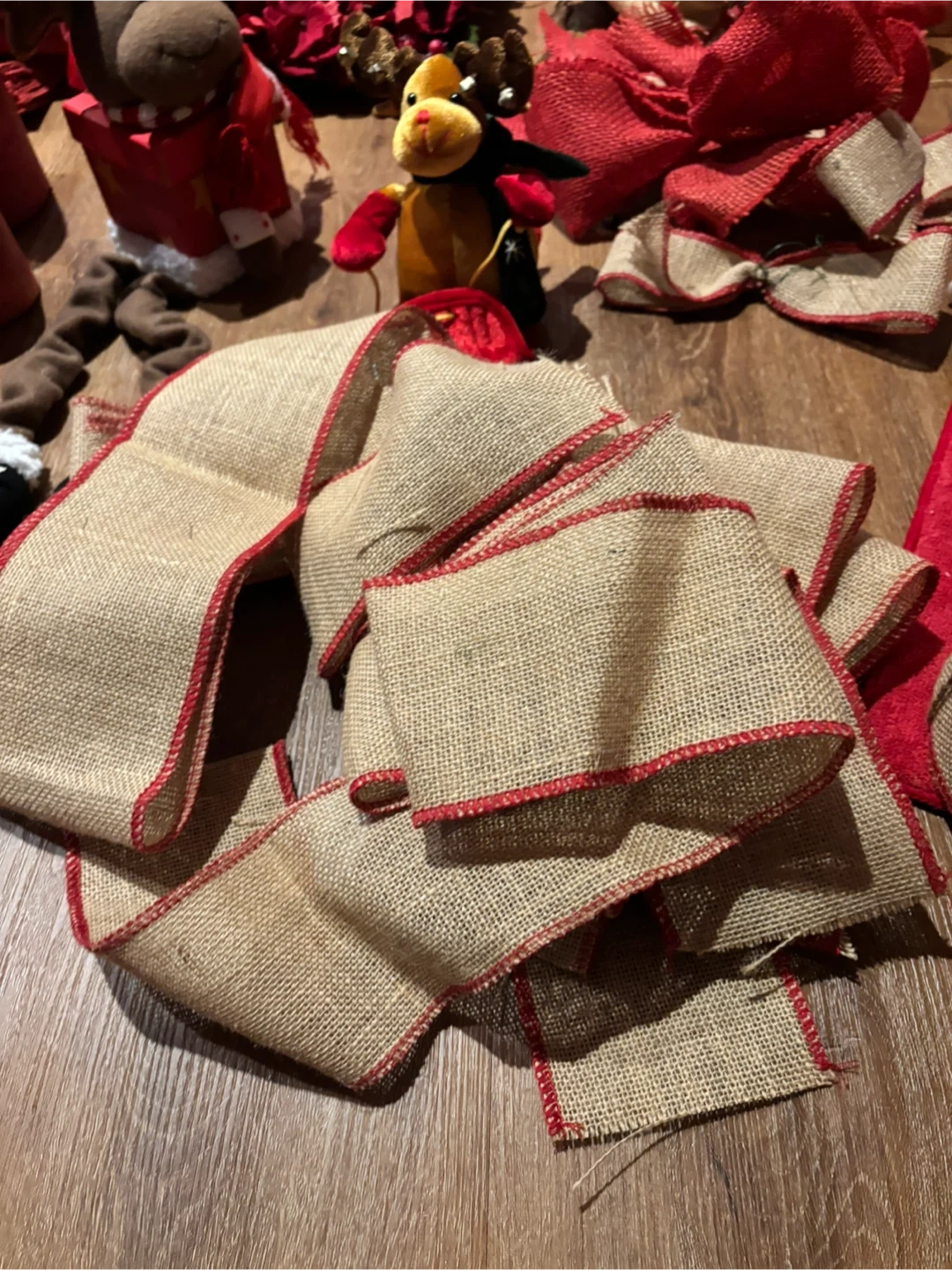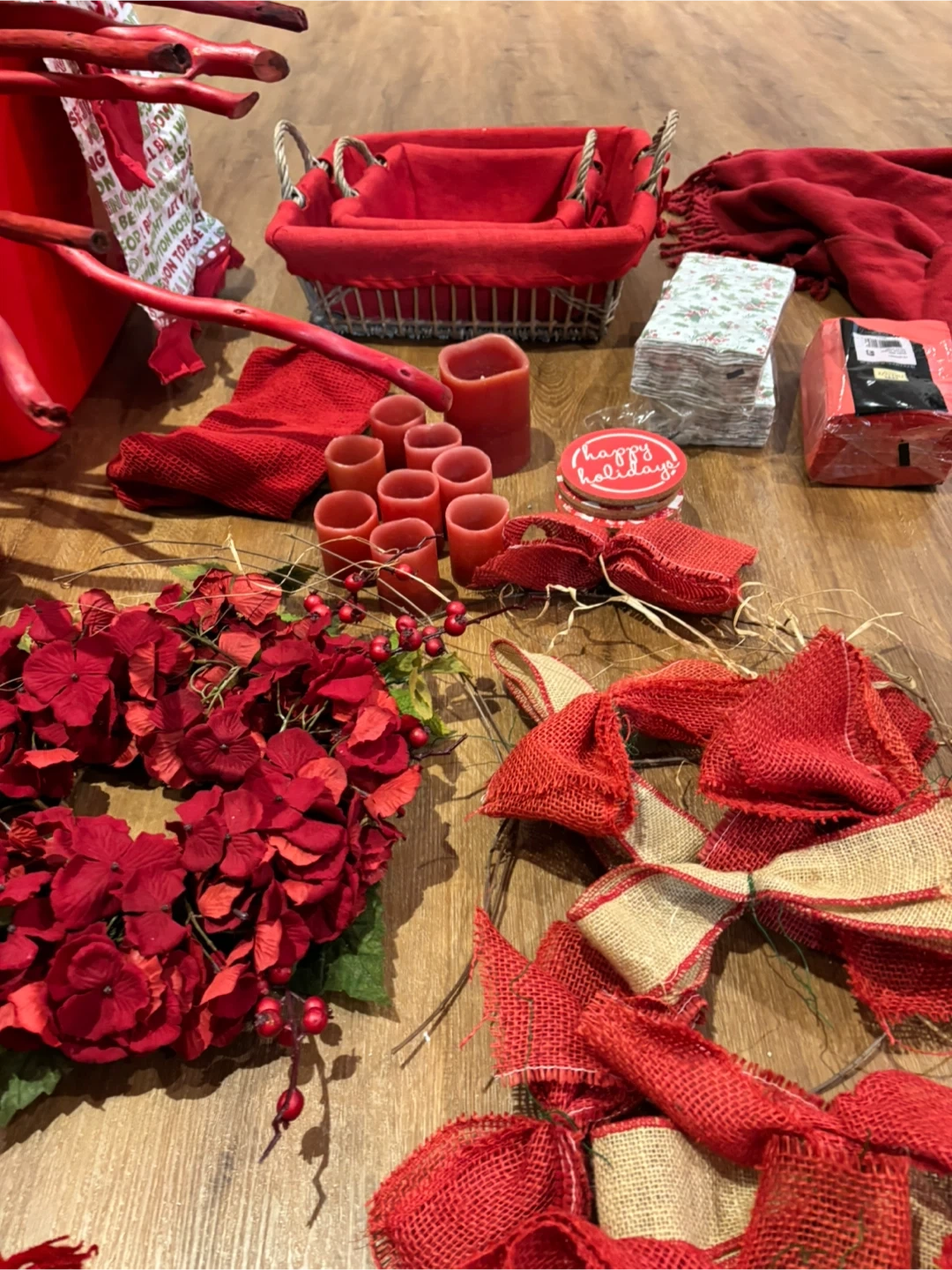 60A collection of red Christmas-themed home decor items! Includes candles, napkins, decorative bowls, and burlap ribbon. Perfect for adding a festive touch to your home this holiday season