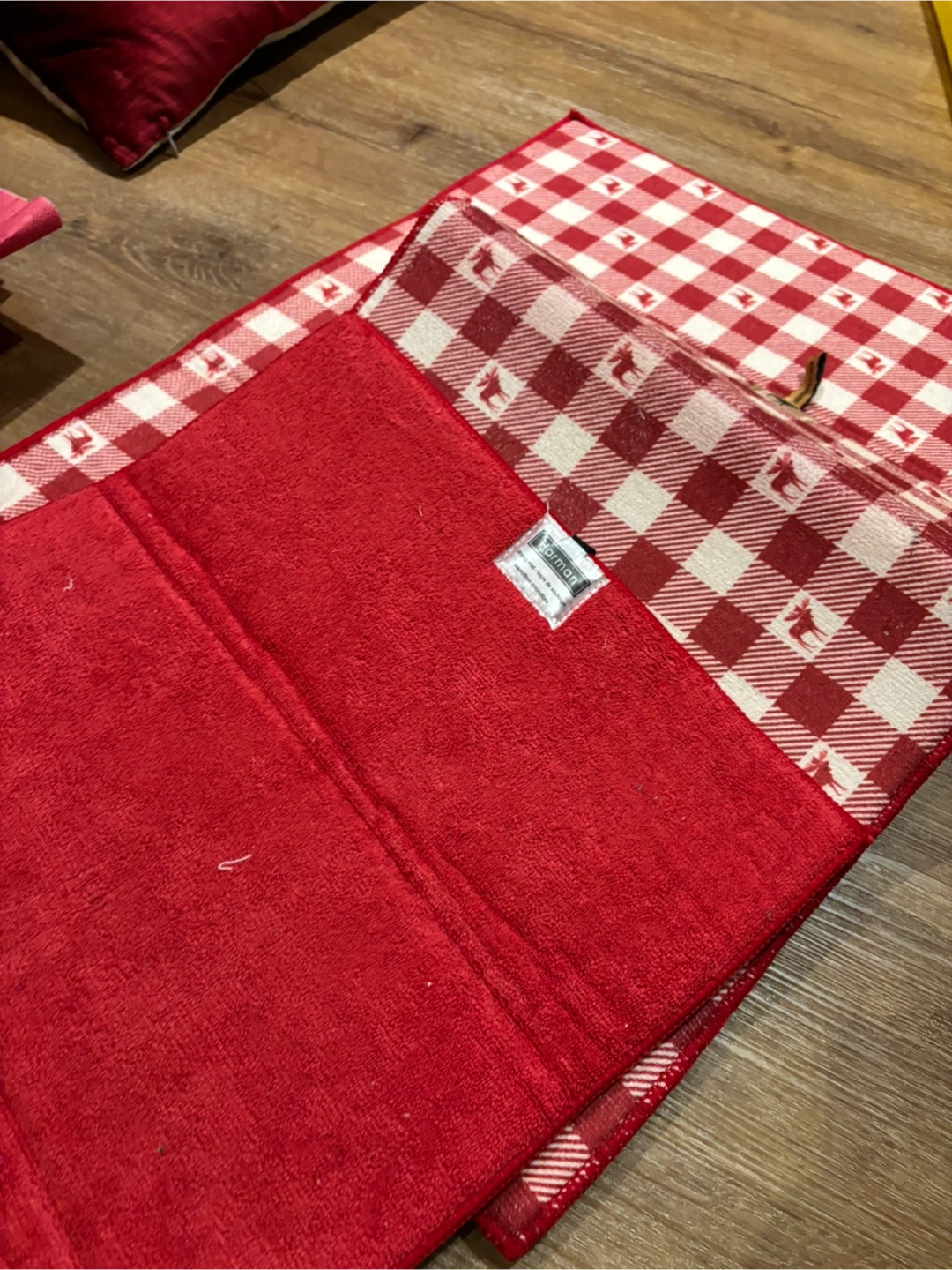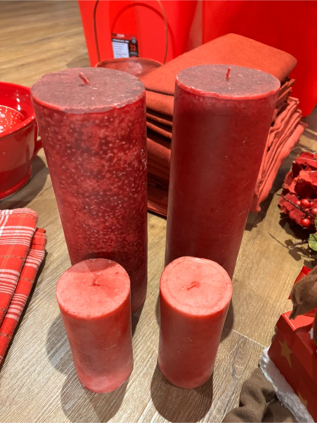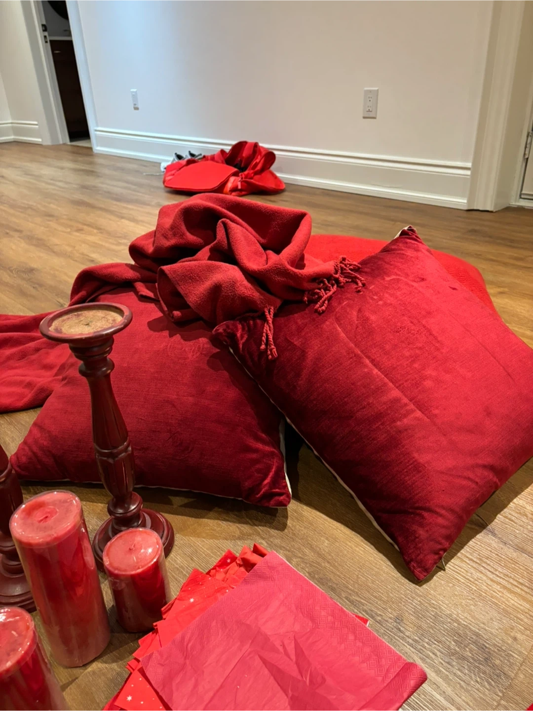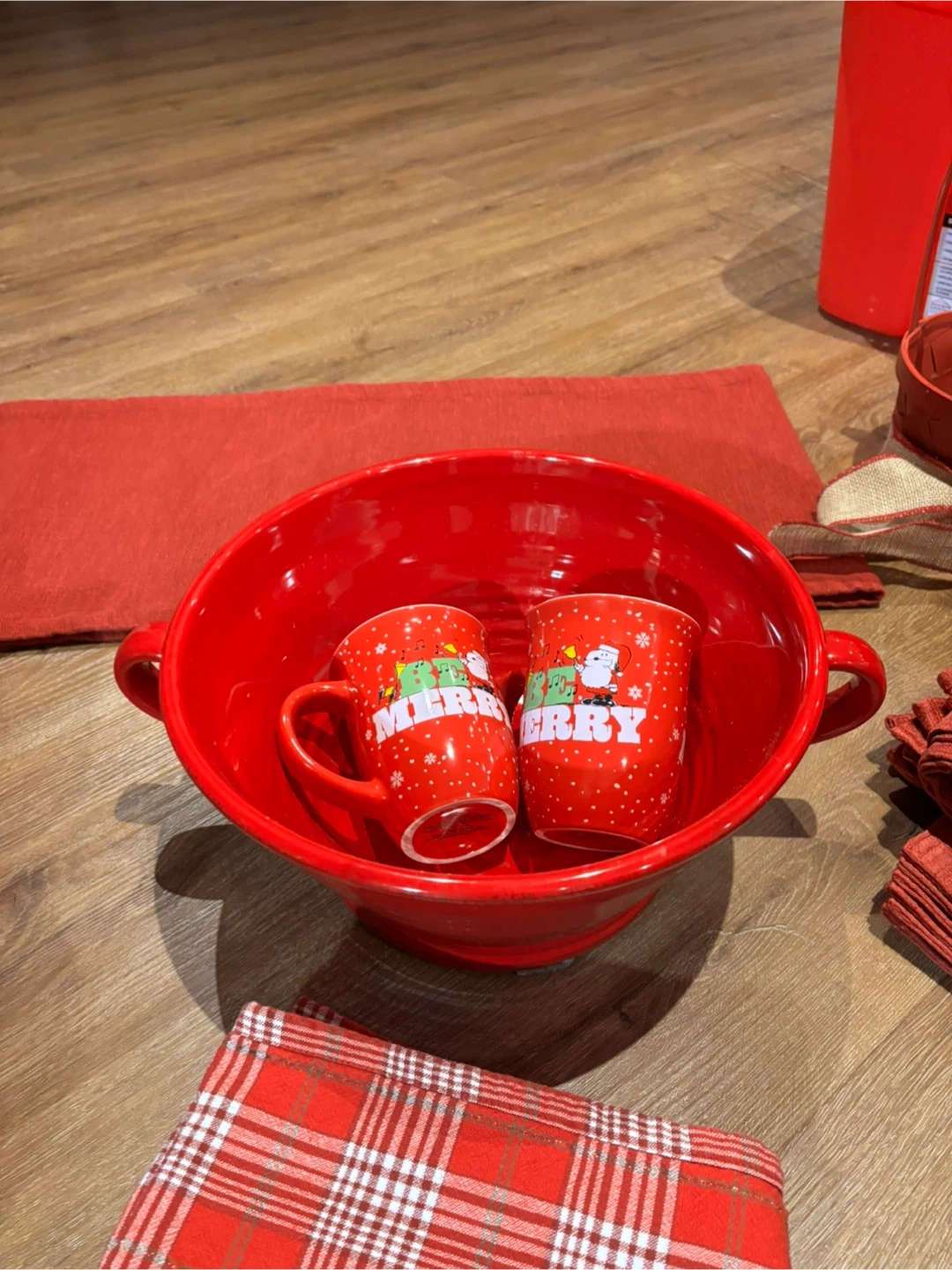 60A collection of red Christmas-themed home decor items! Includes candles, napkins, decorative bowls, and burlap ribbon. Perfect for adding a festive touch to your home this holiday season