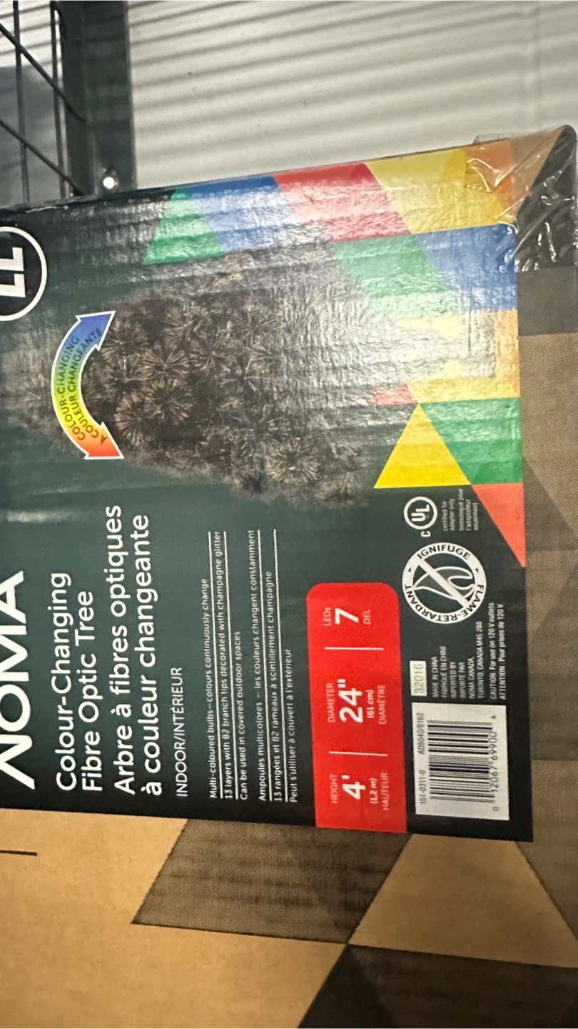 73Selling a NOMA Colour-Changing Fibre Optic Tree. It's 4 feet tall and has a diameter of 24 inches. It comes with multi-coloured bulbs that continuously change. The tree has 13 layers with 82 branches decorated with champagne glitter. Perfect for indoor or outdoor spaces! Comes with the box
