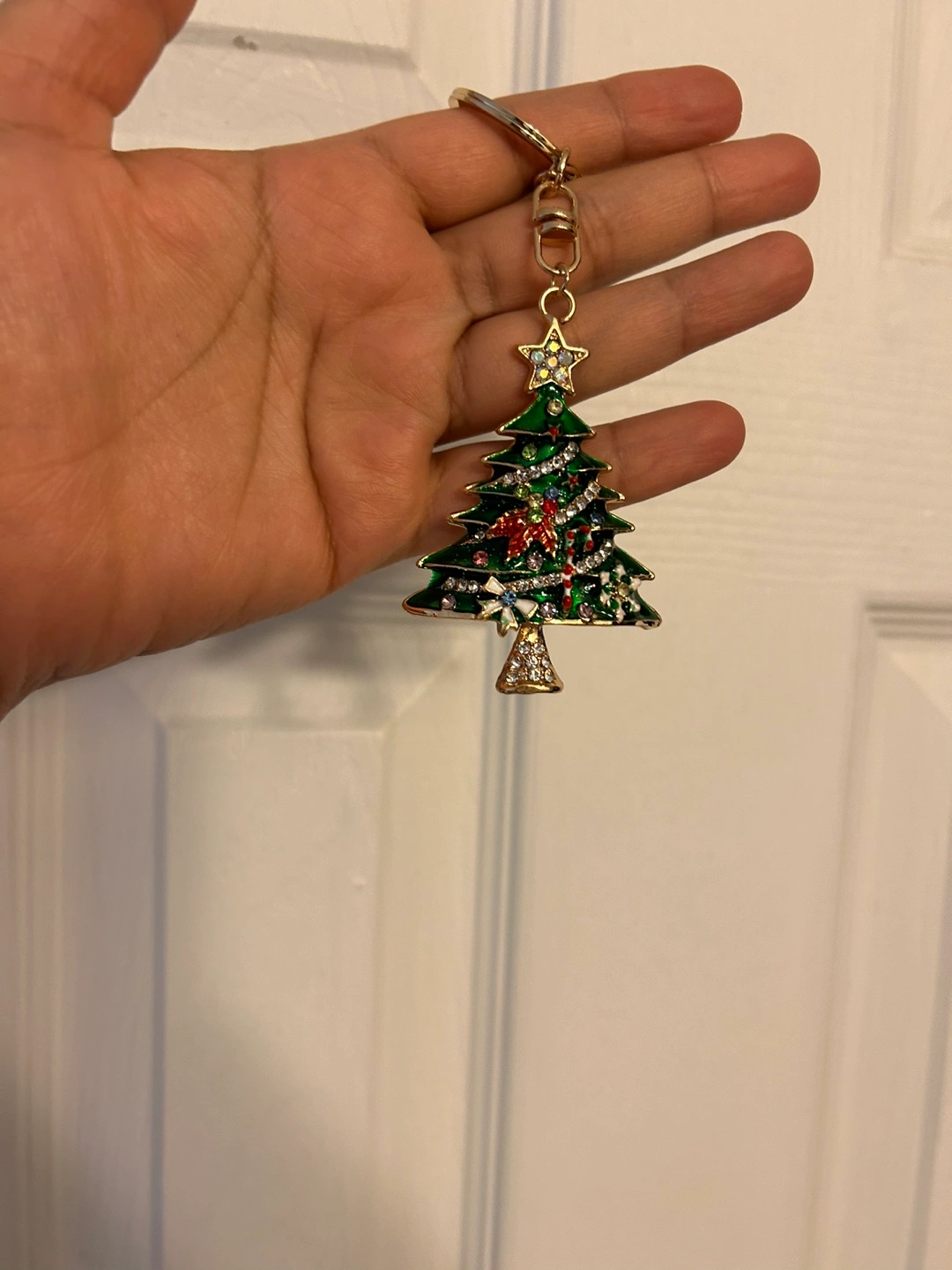 Green Christmas tree keychain with rhinestones. Gold coloured chain and star.