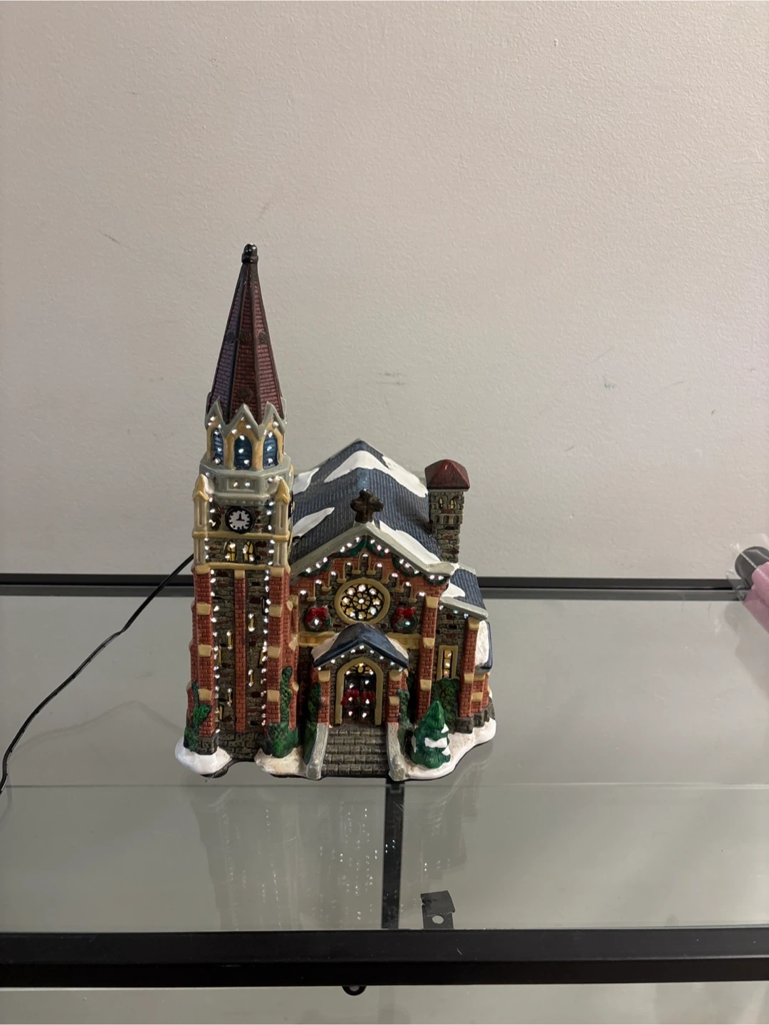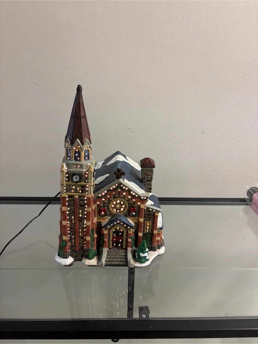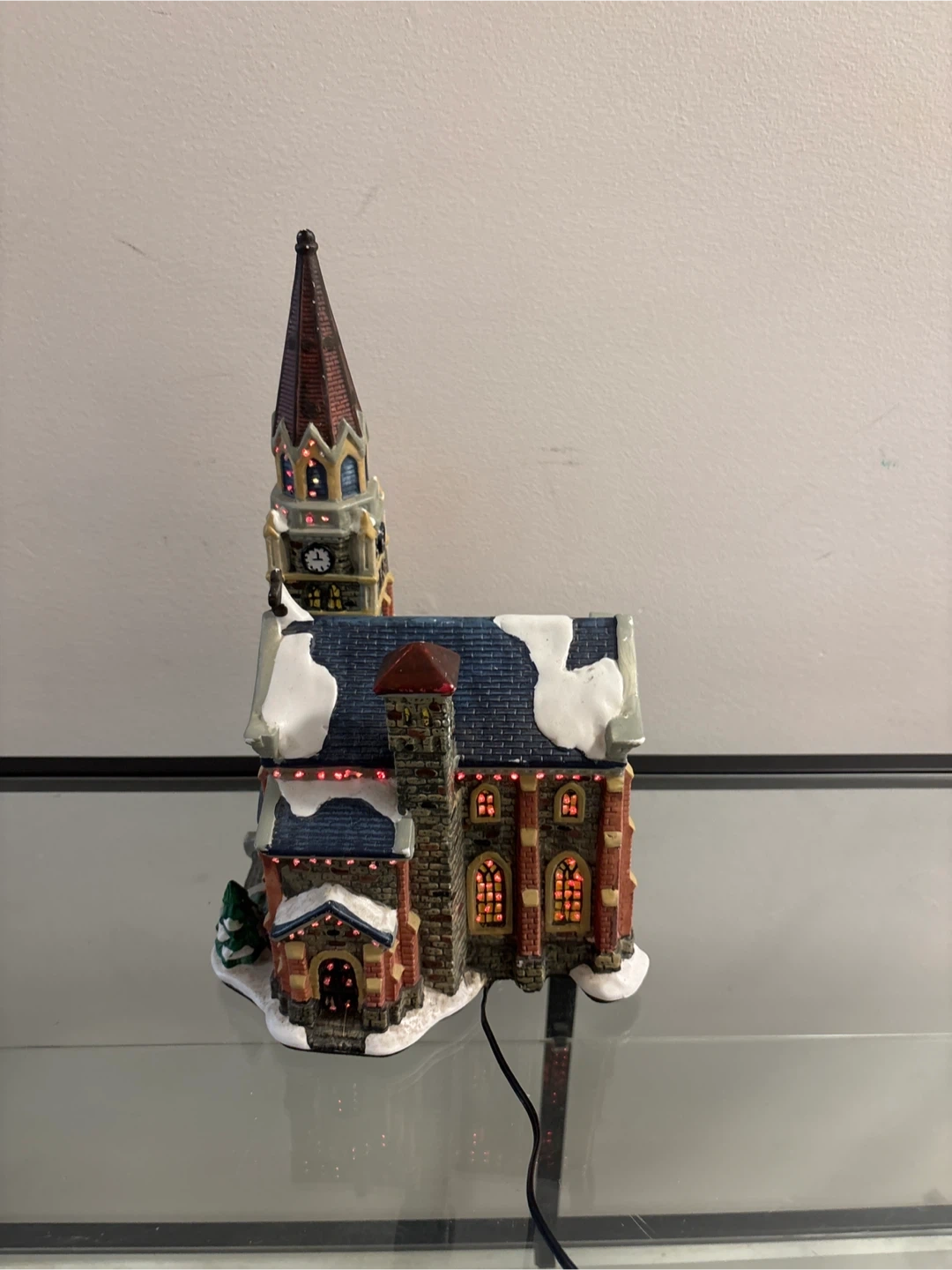 106Here's a charming Christmas village church figurine ready to brighten up your holiday decor with LED lights! It's in great shape and would make a lovely addition to any Christmas village display